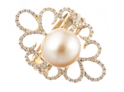 Bague en or jaune avec une perle des Mers du Sud dorée et dentelle de diamants