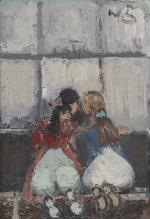 Walter SCHNEIDER (1903-1968) "Deux fillettes à genou sur un banc"