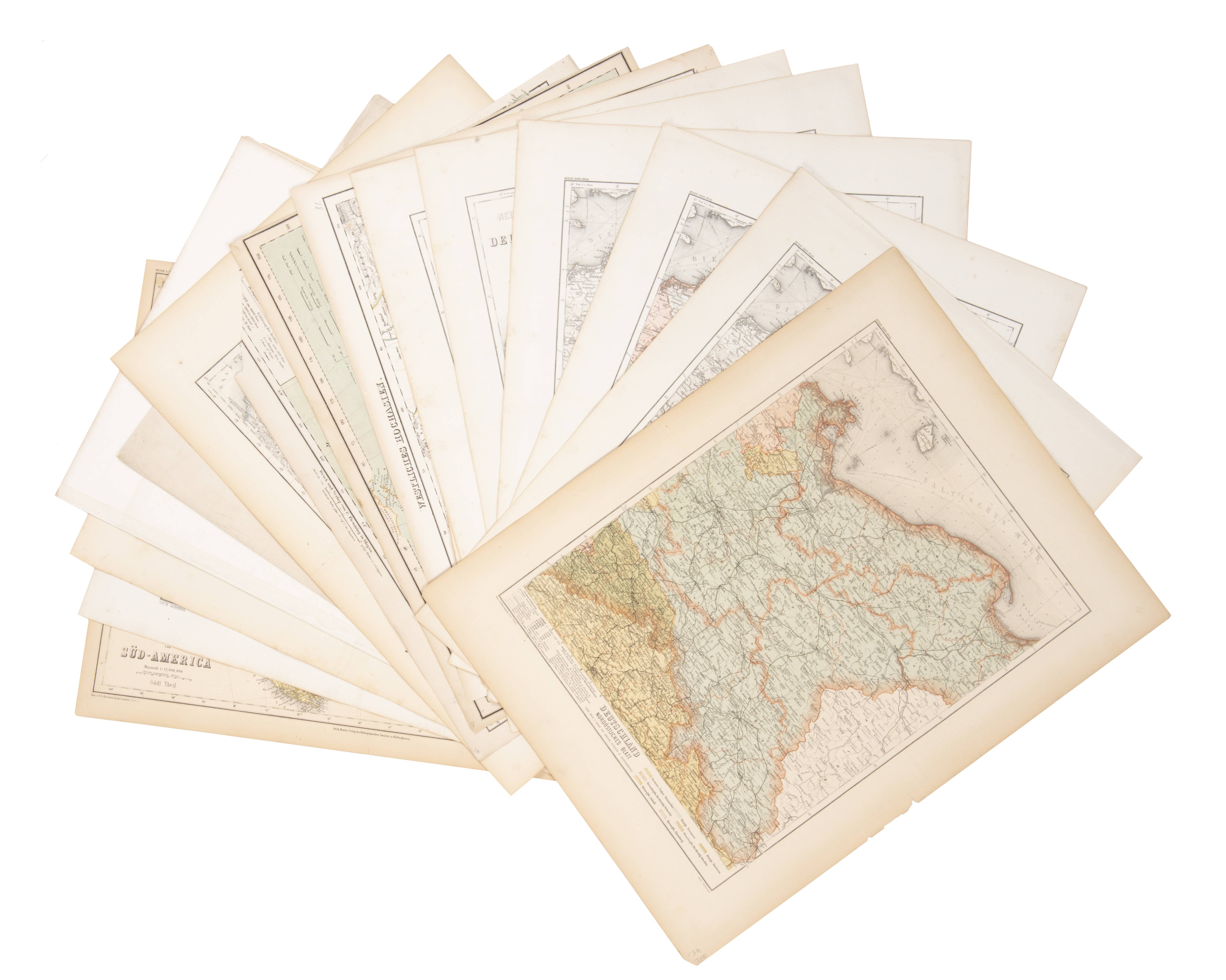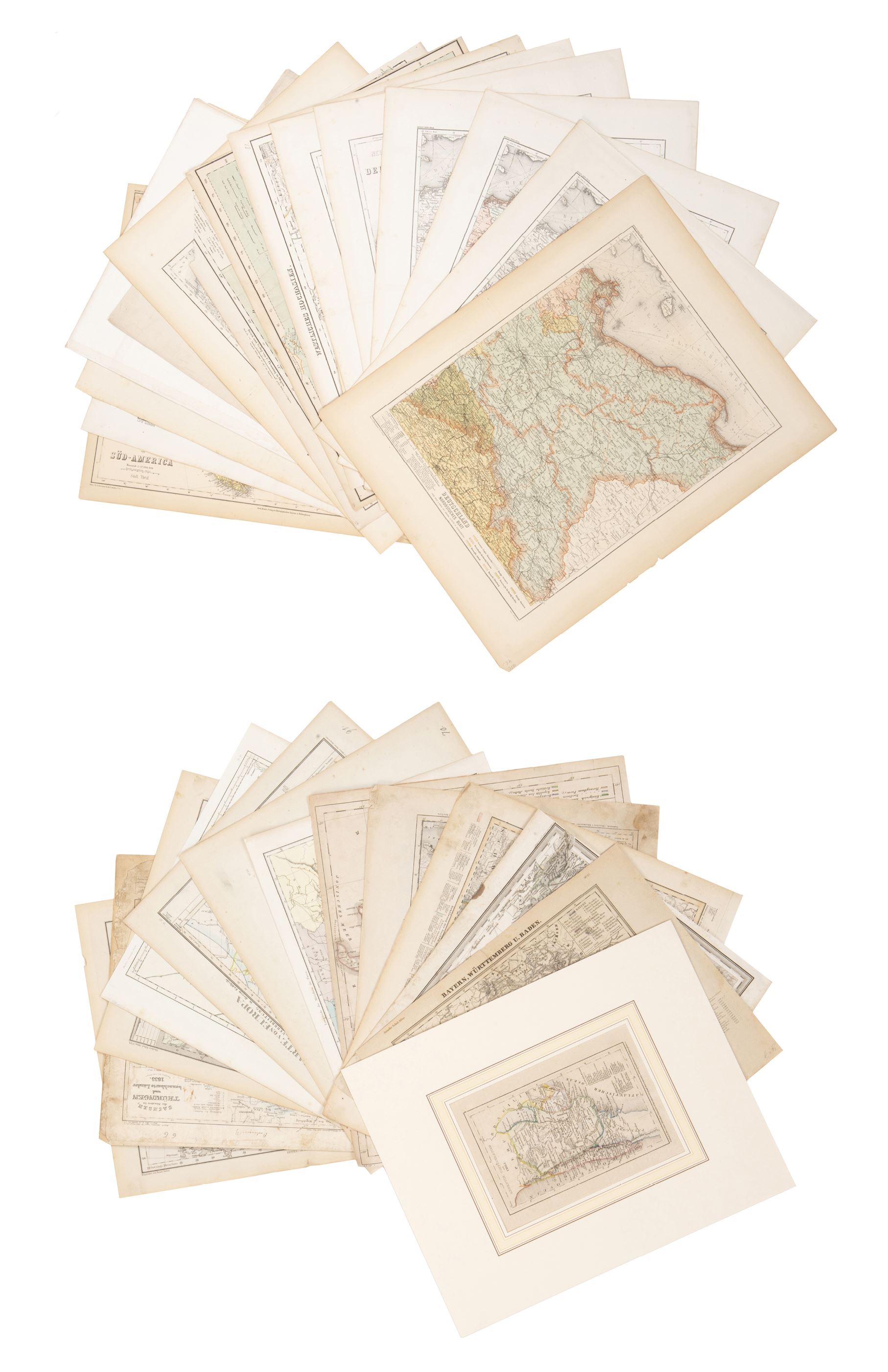 Lot de 37 cartes géographiques, principalement XIXe, différents formats, couvre de multiples pays : Allemagne, Amérique du Sud, carte de l'Europe, France, Italie, Danemark, cartes du monde, etc.