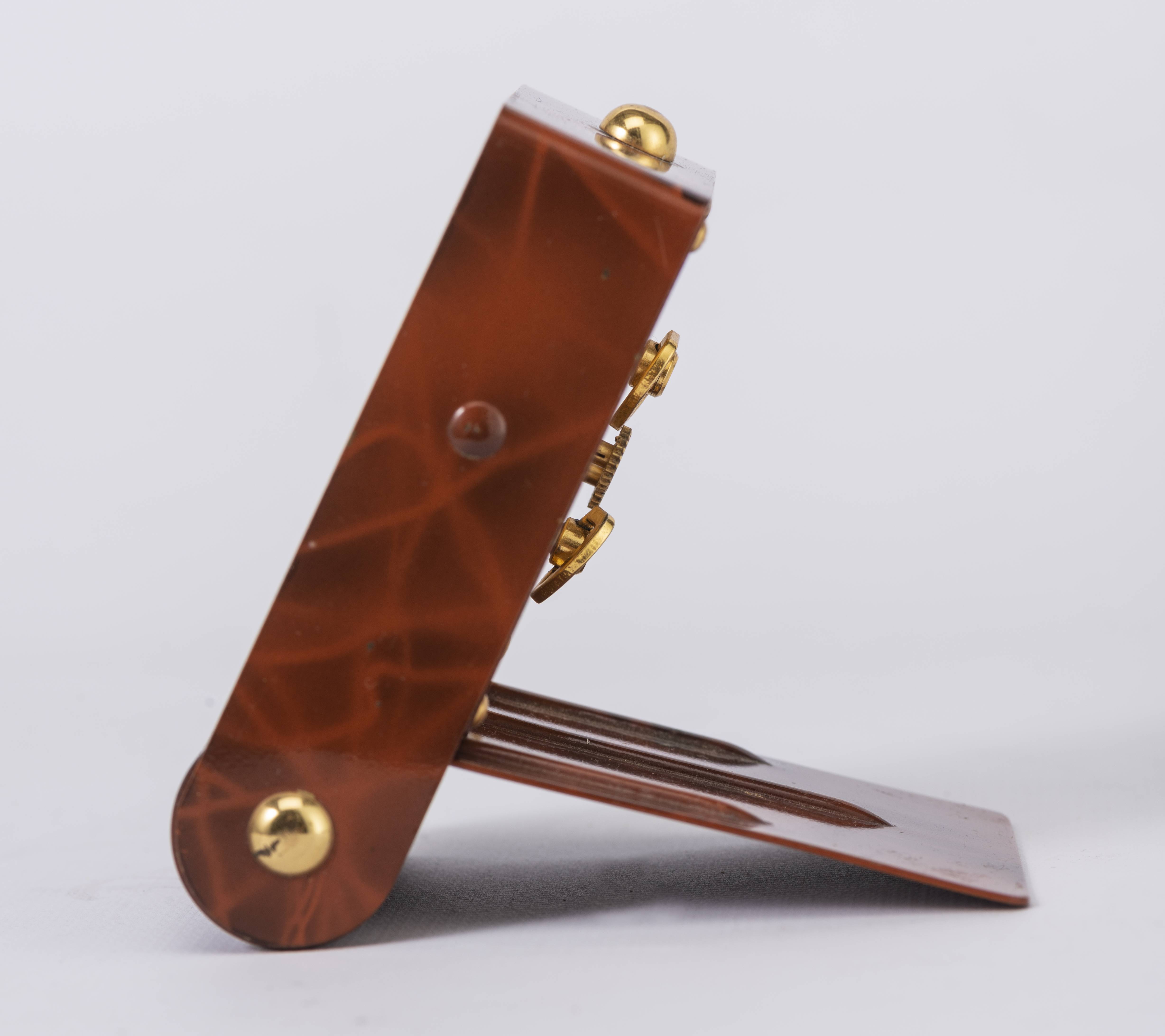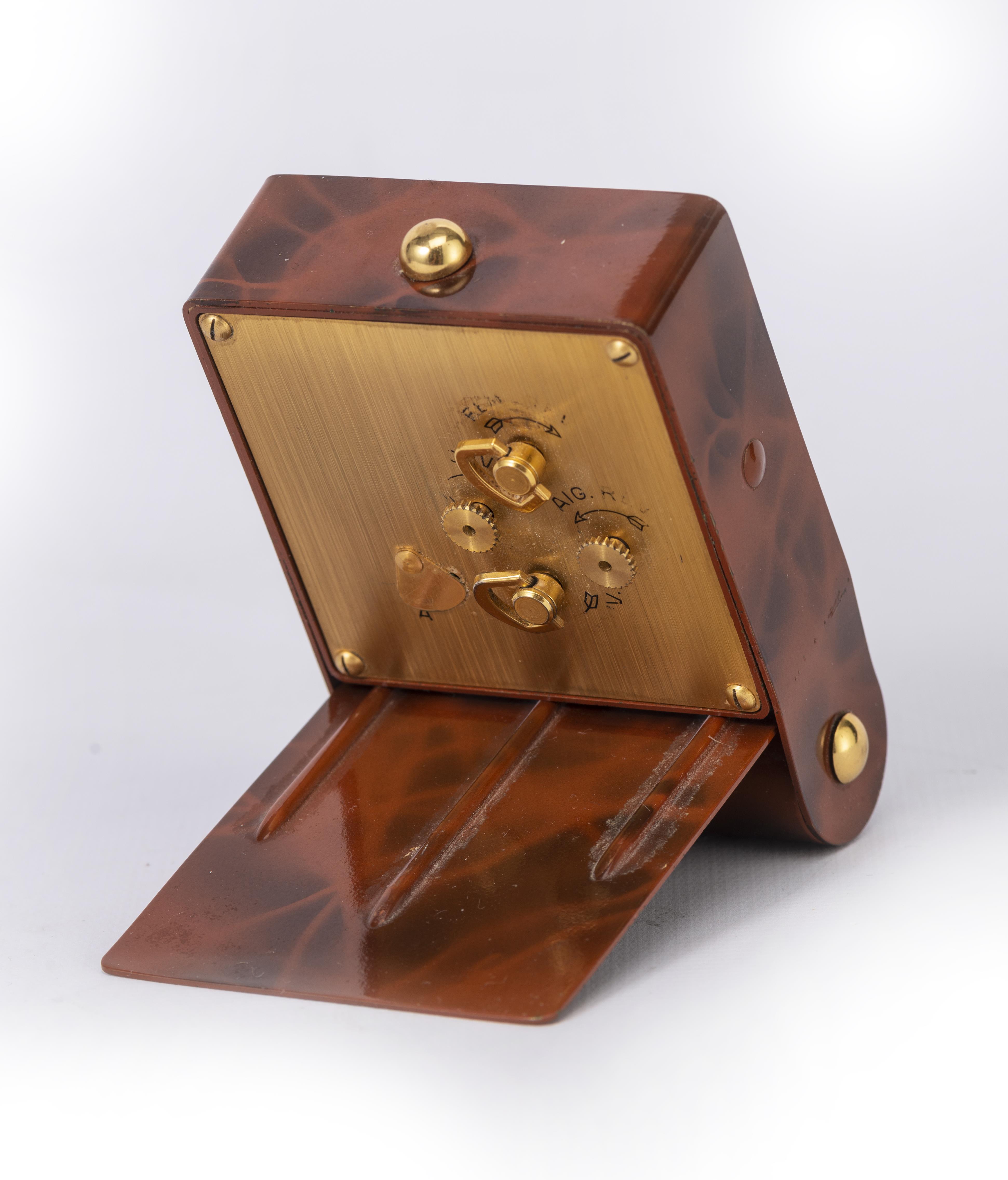 JAEGER-LECOULTRE réveil de bureau à boîte en métal peint faux bois et cadran doré, index à chiffres arabes, aiguilles bleuïes, signé Jaeger.