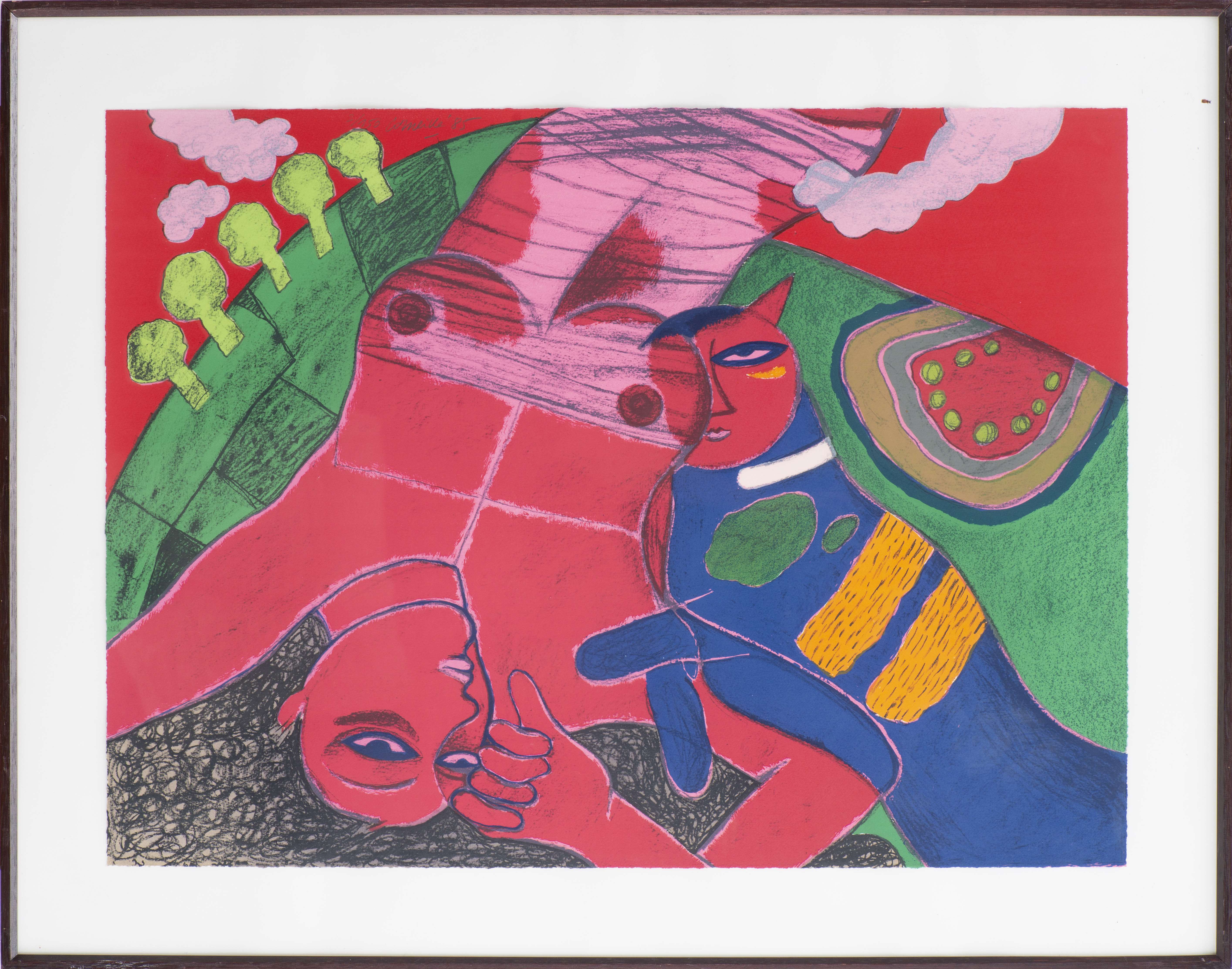 - "Femme et chat" Estampe couleurs shg au crayon, num 2/150 et daté 85.