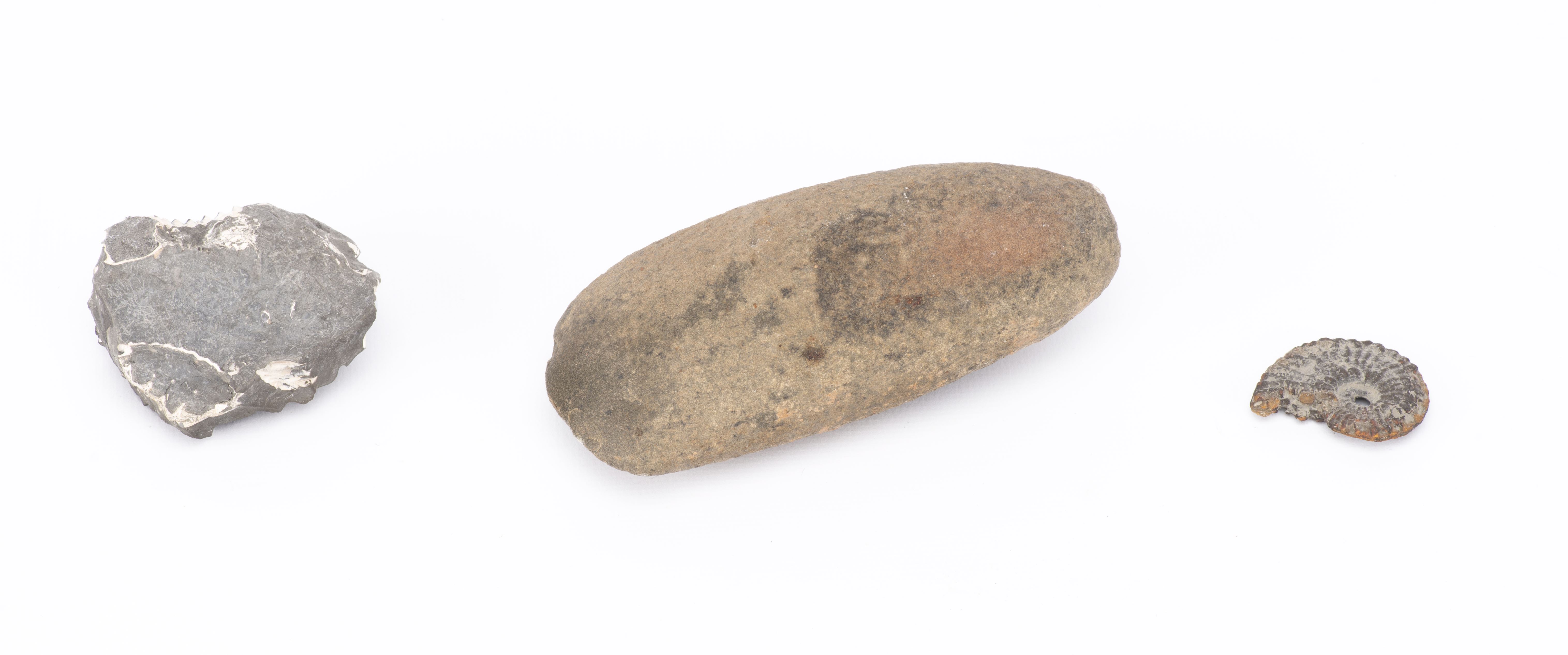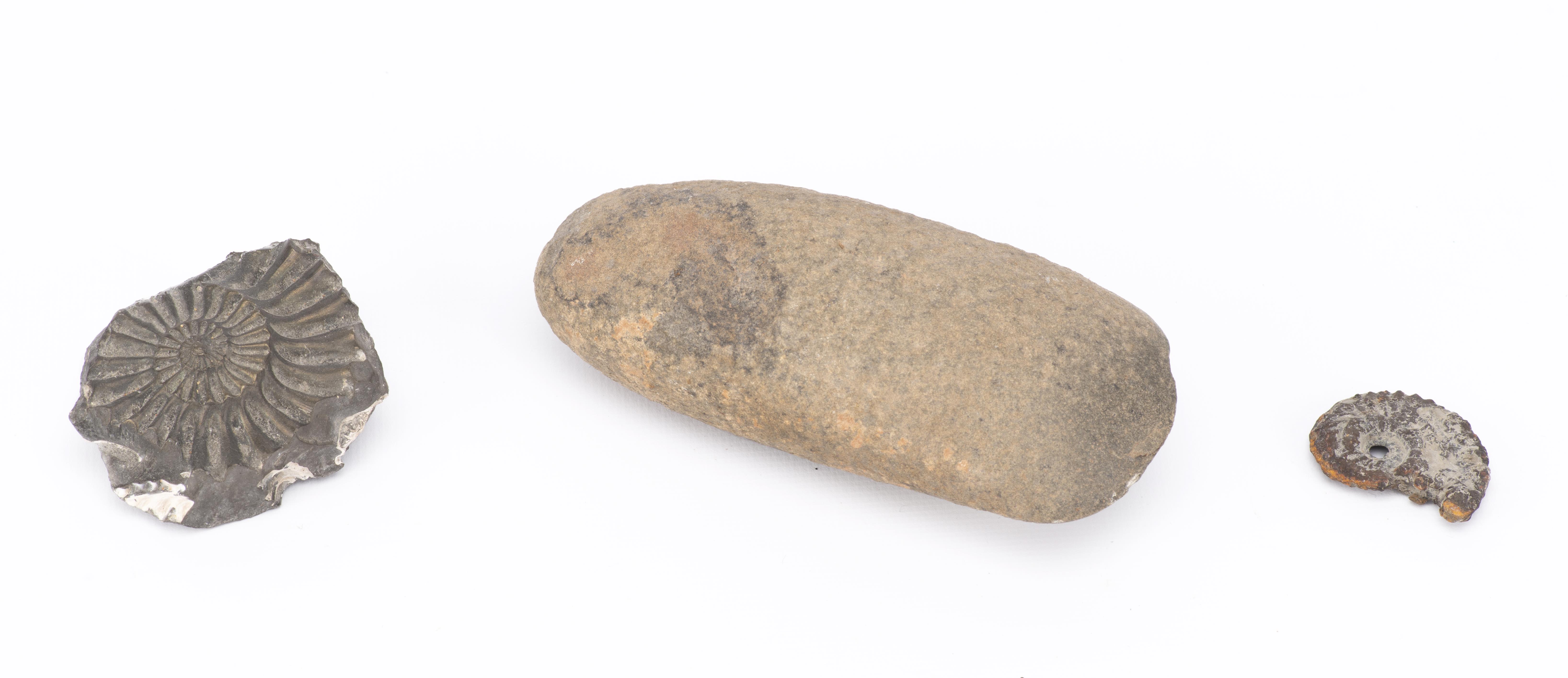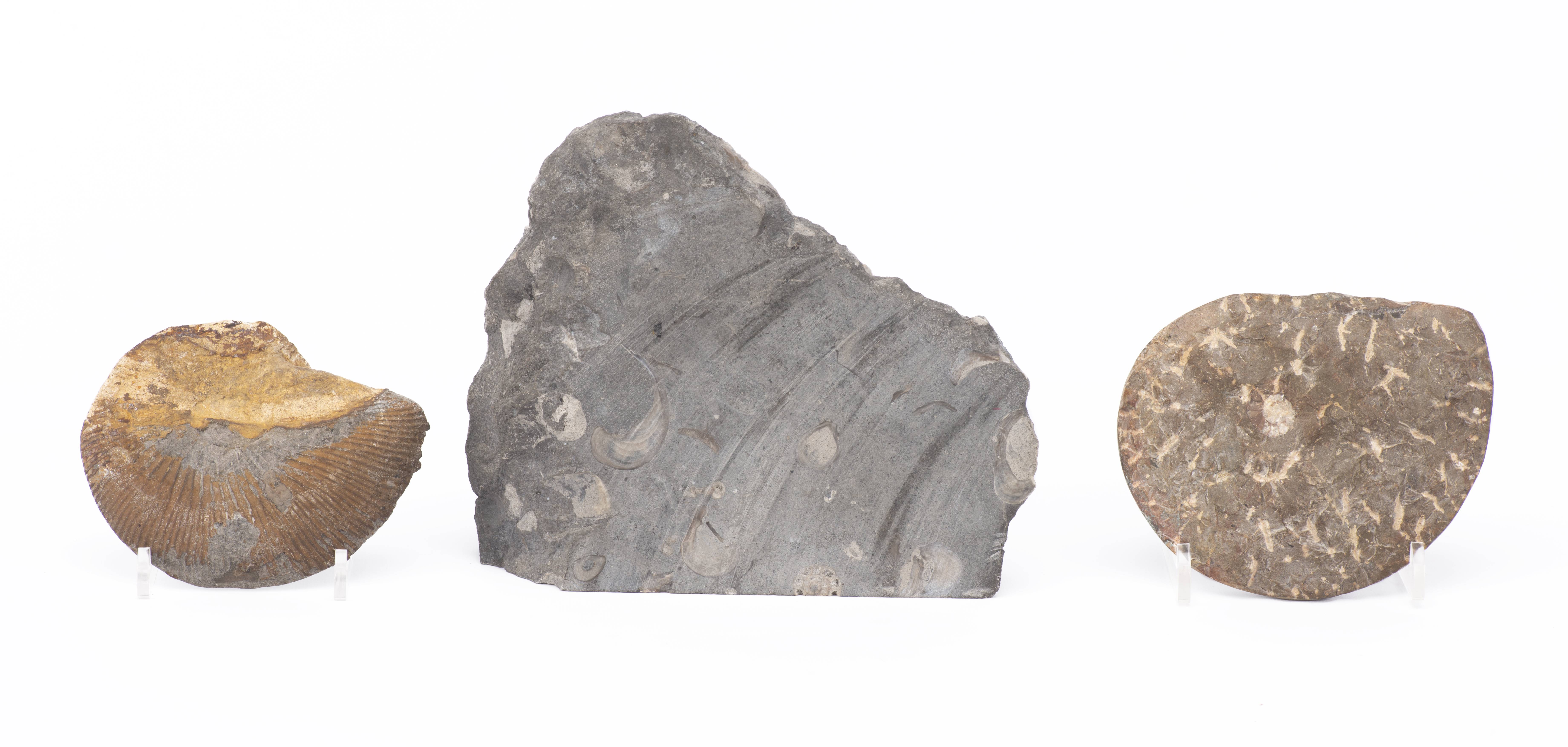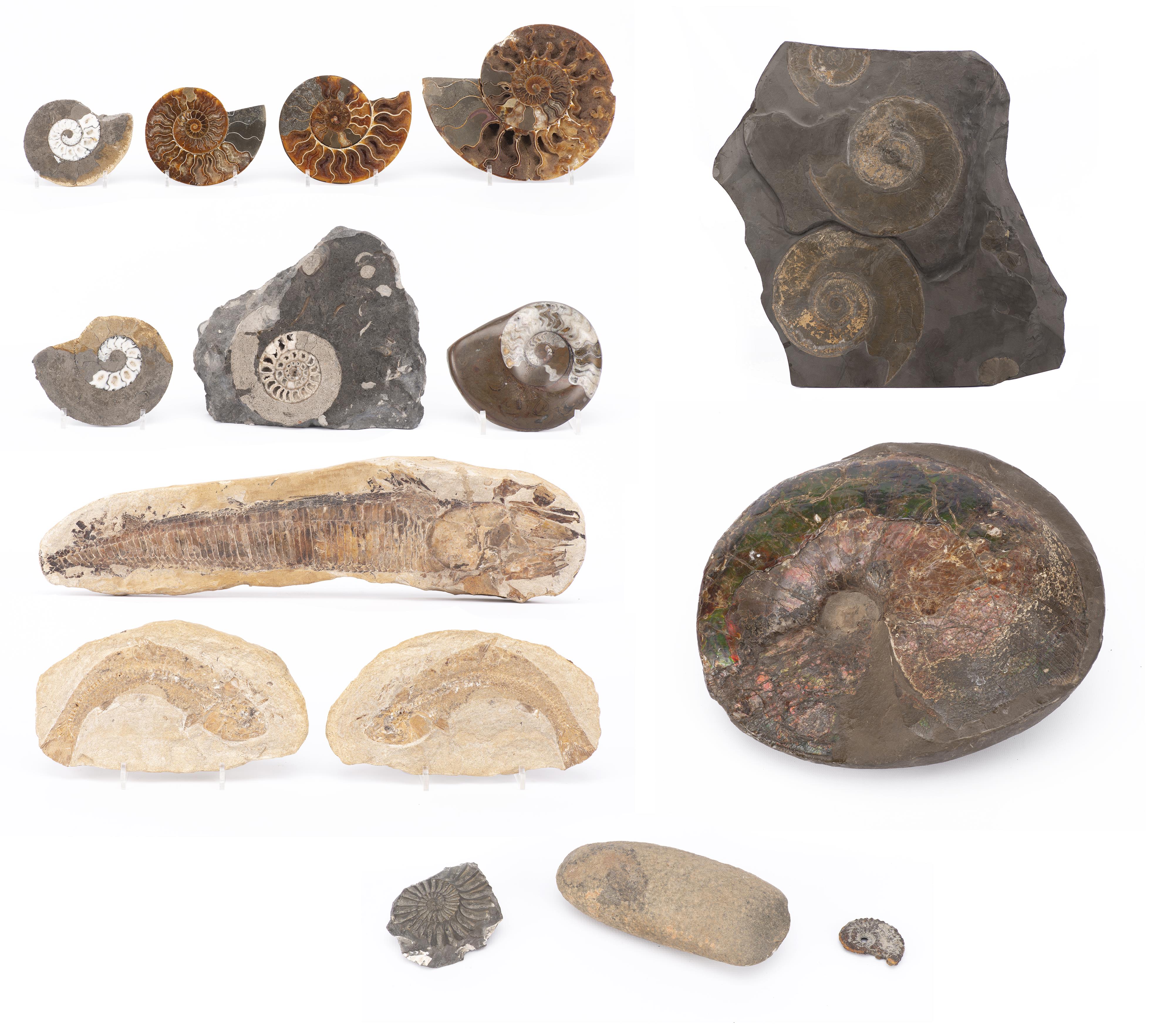 Tailles: entre 12.5 cm, 28.5 cm ainsi qu'une plaque 55x51 cm et deux fossiles marins L. 26.5 & L. 43 cm