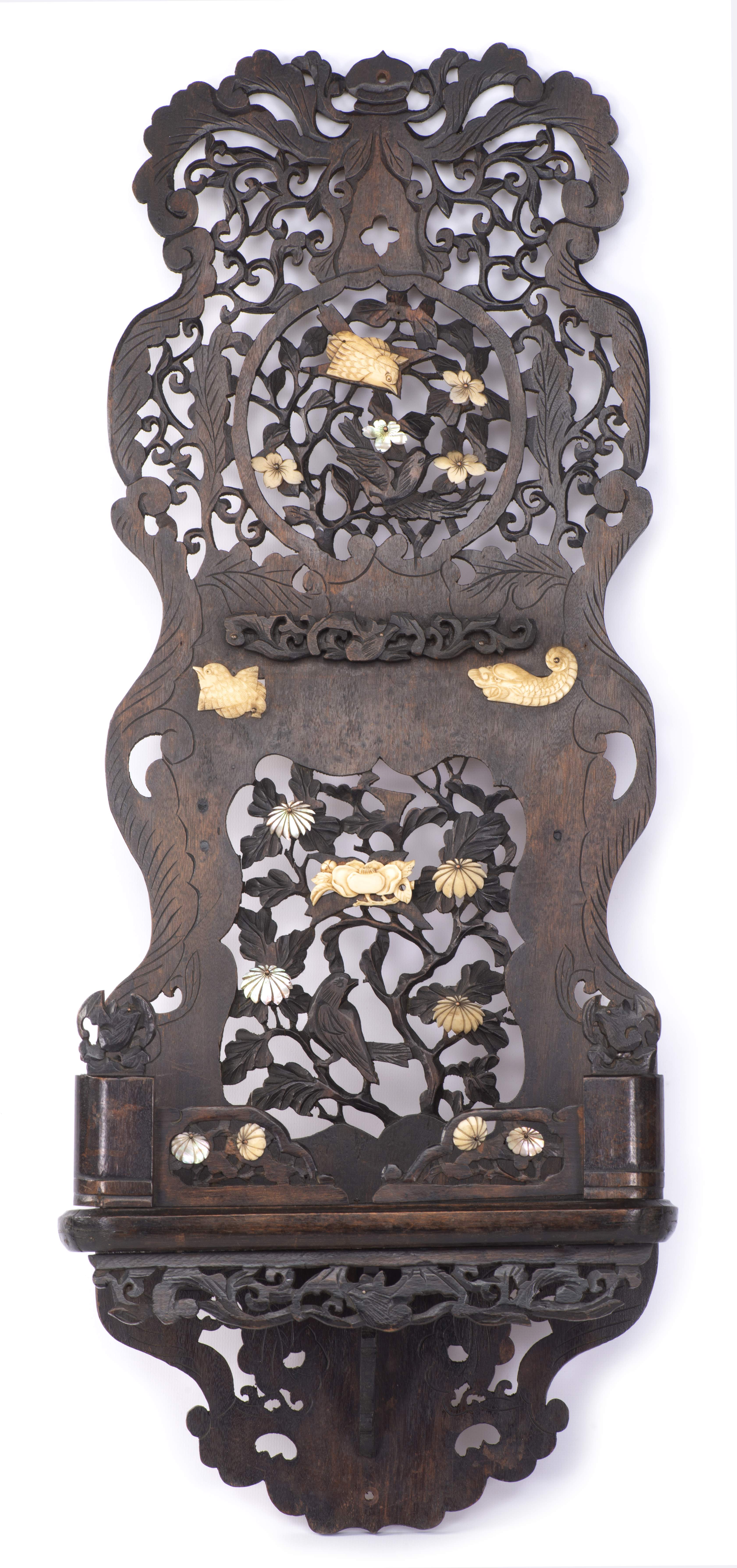 Etagère murale en bois teinté à décor ajouré de fleurs, feuillage et oiseaux, inserts d'ivoire et de nacre. Japon, Fin XIX - Début XXe.