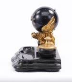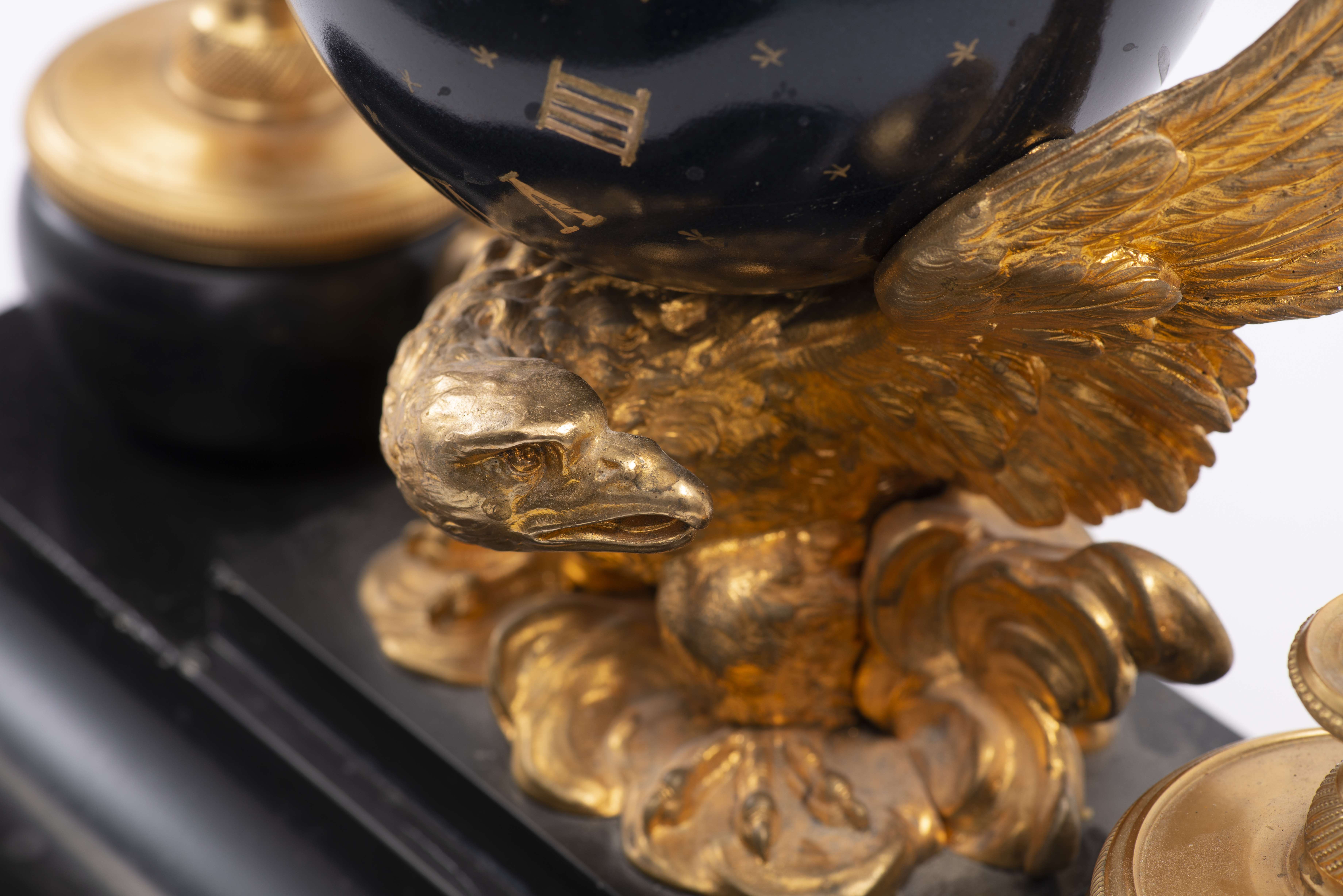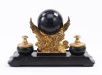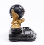 Garniture de bureau à deux encriers et pendule boule soutenu par un aigle en bronze doré, aiguilles en forme de serpent.