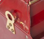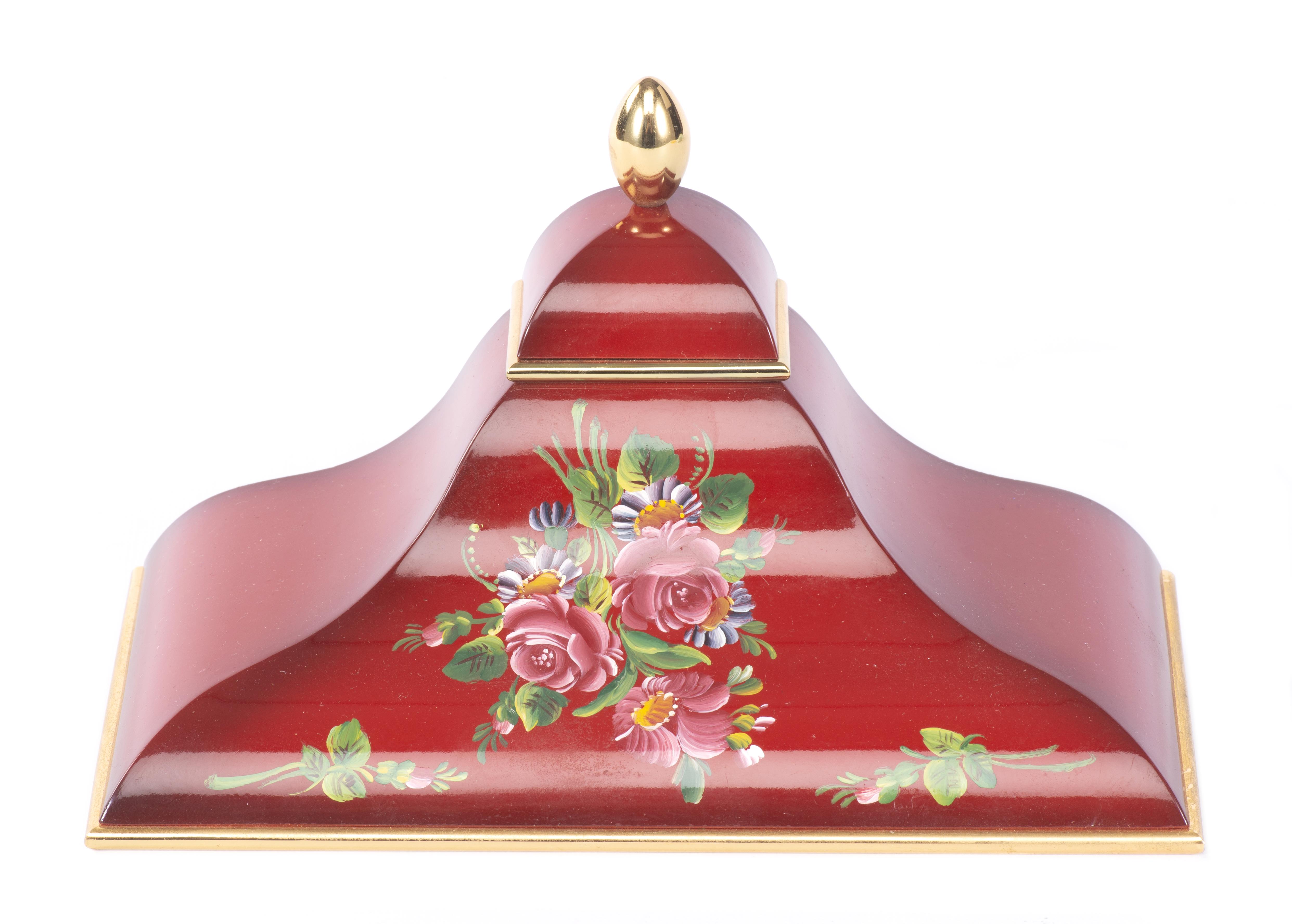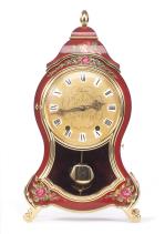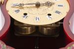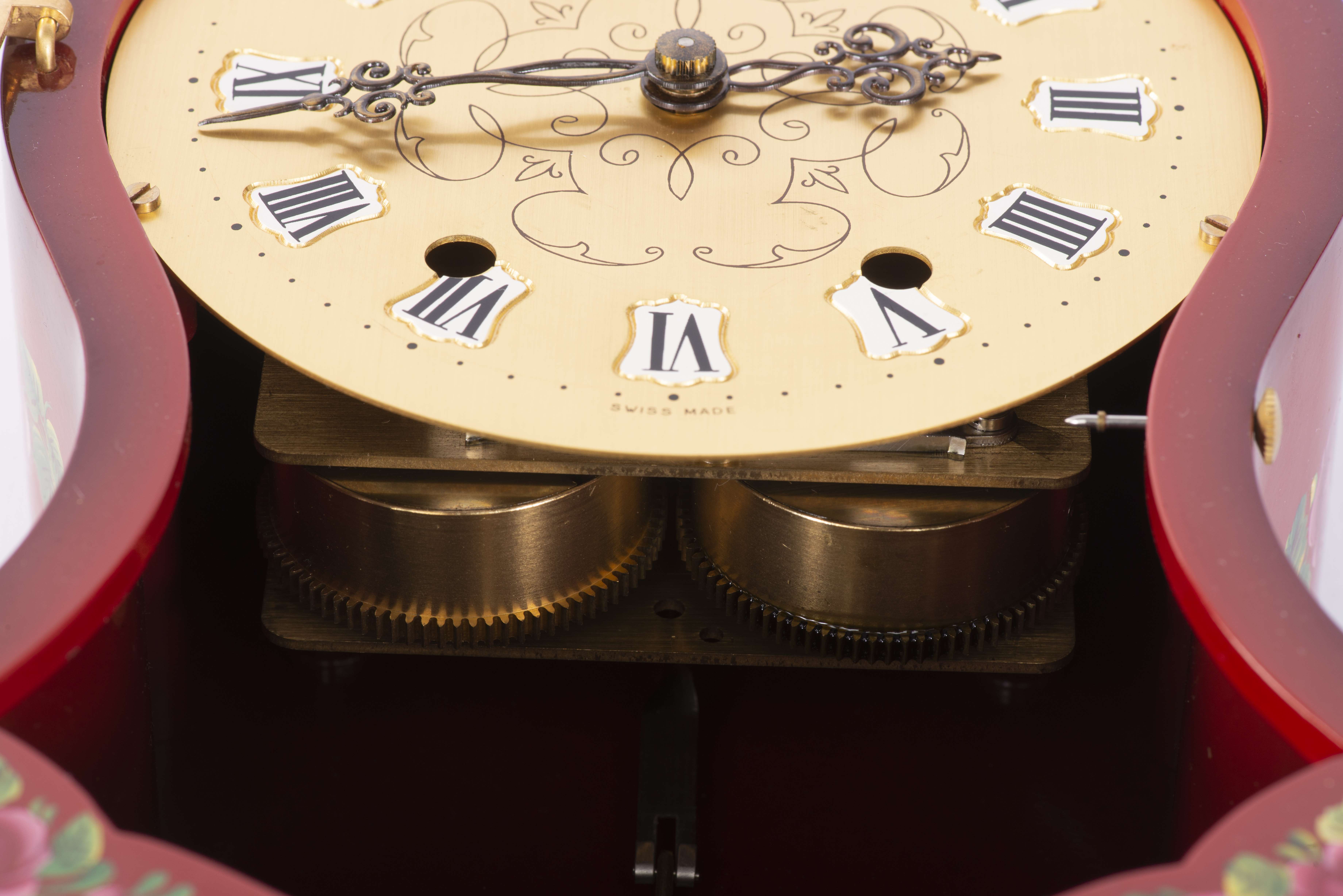 Horloge neuchâteloise Eluxa et sa console à caisse rouge à décor de fleurs, signature du décorateur au dos.