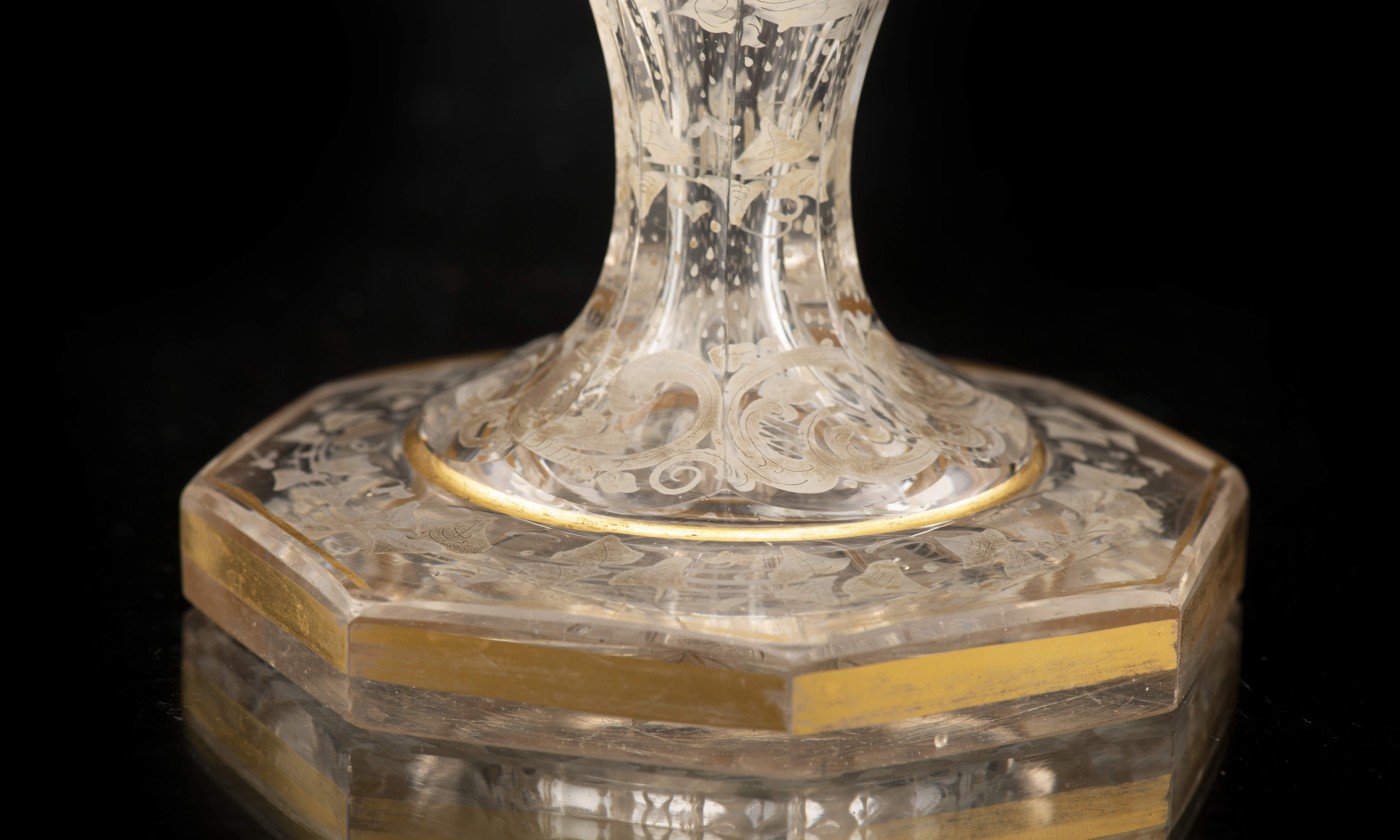 Coupe sur pied haut en cristal taillé, peint et doré dans le goût de Baccarat. Epoque Nap. III vers 1860.
