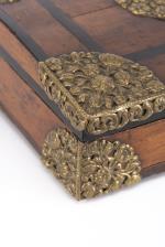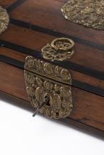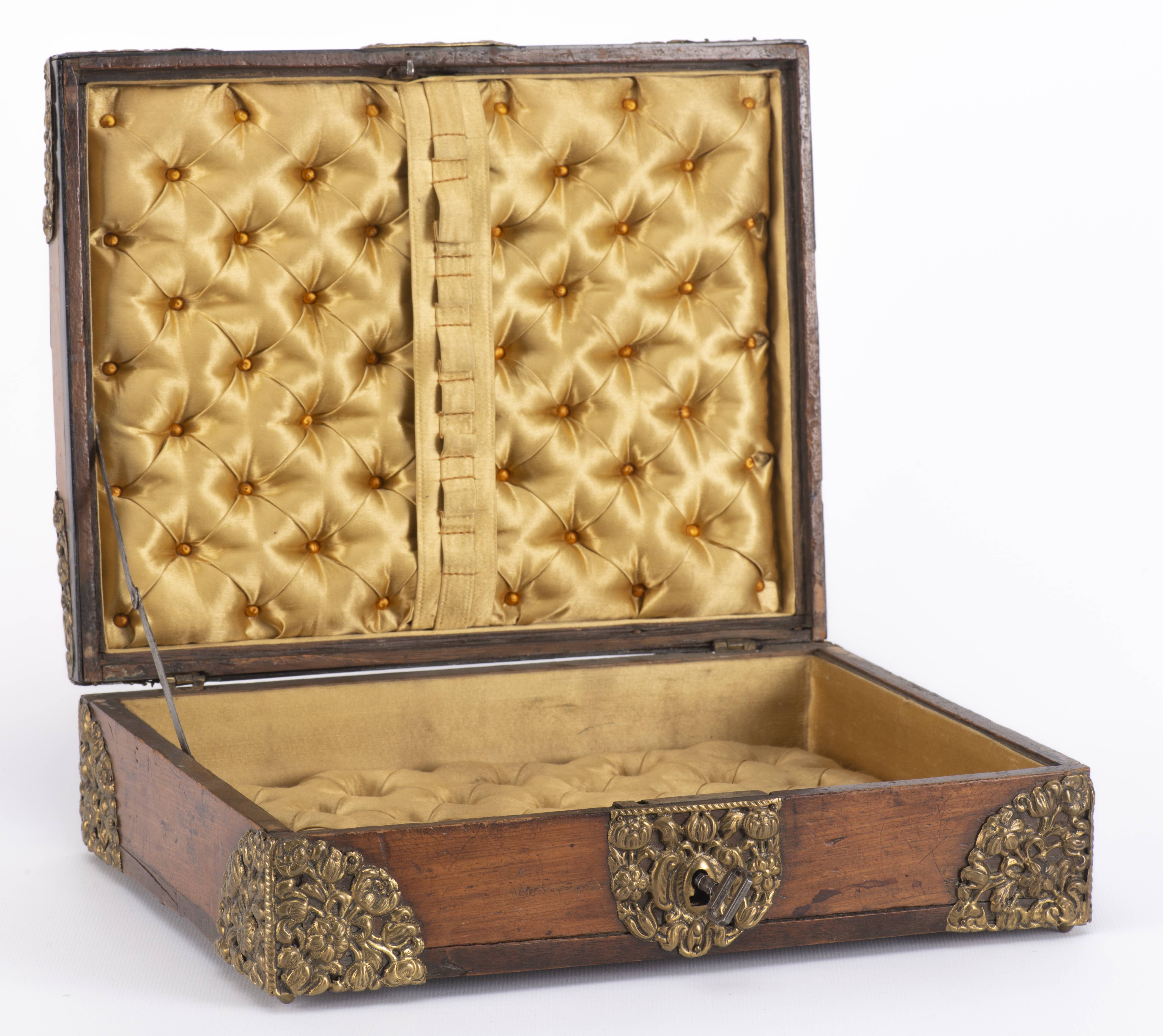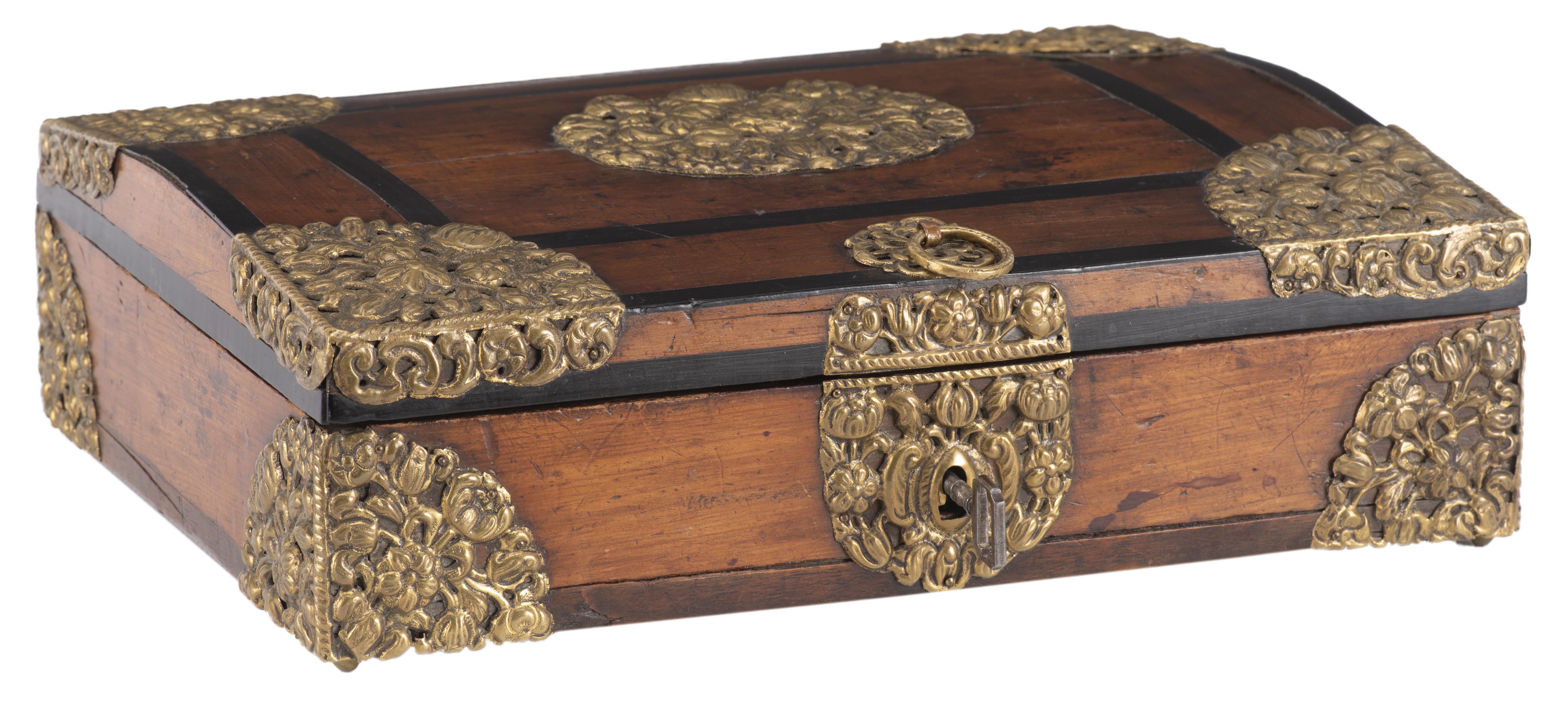 Boîte rectangulaire ancienne en bois et placage, ornements décoratifs en laiton doré repoussé à décor de fleurs et feuillage, avec sa clé.