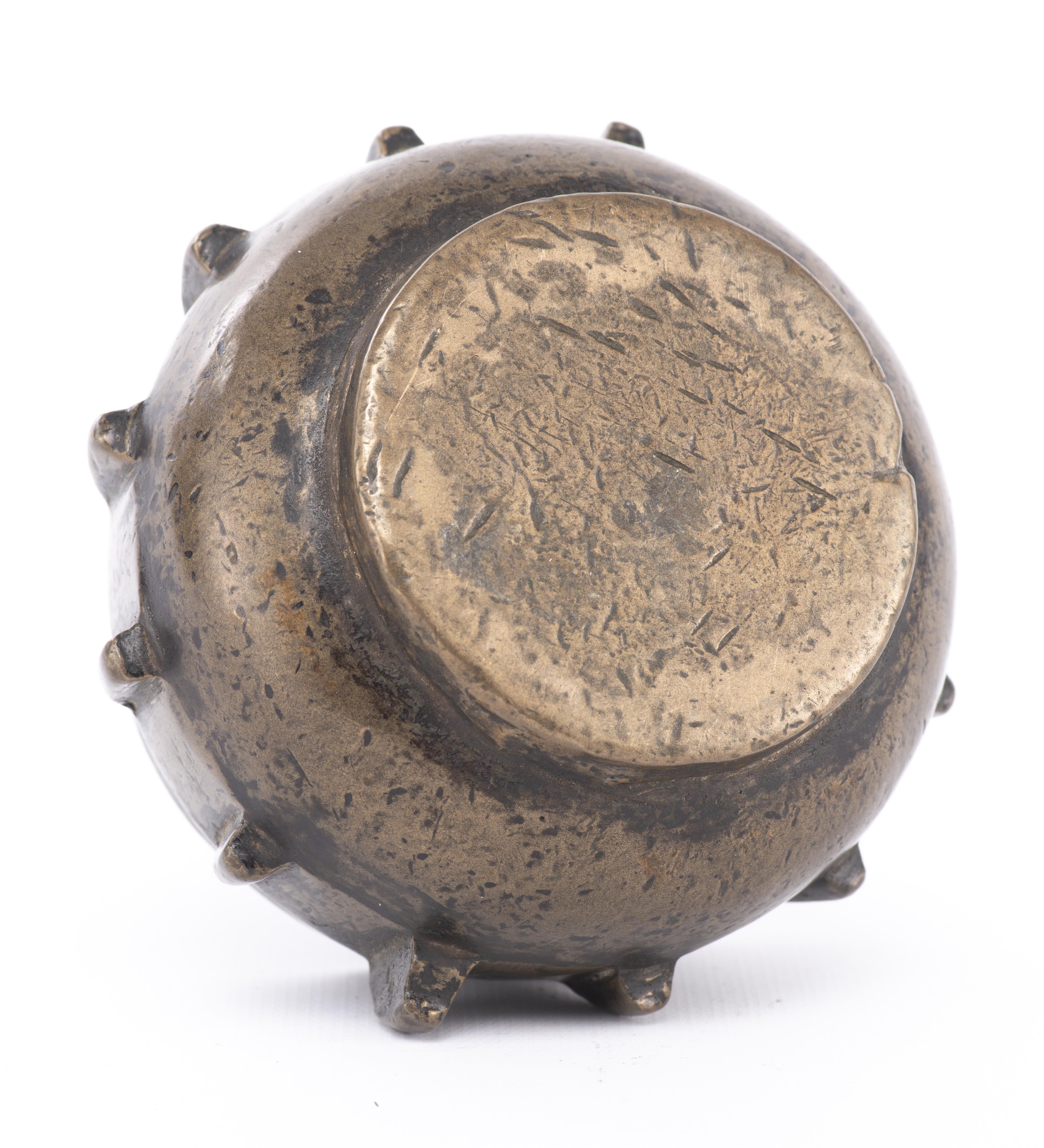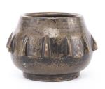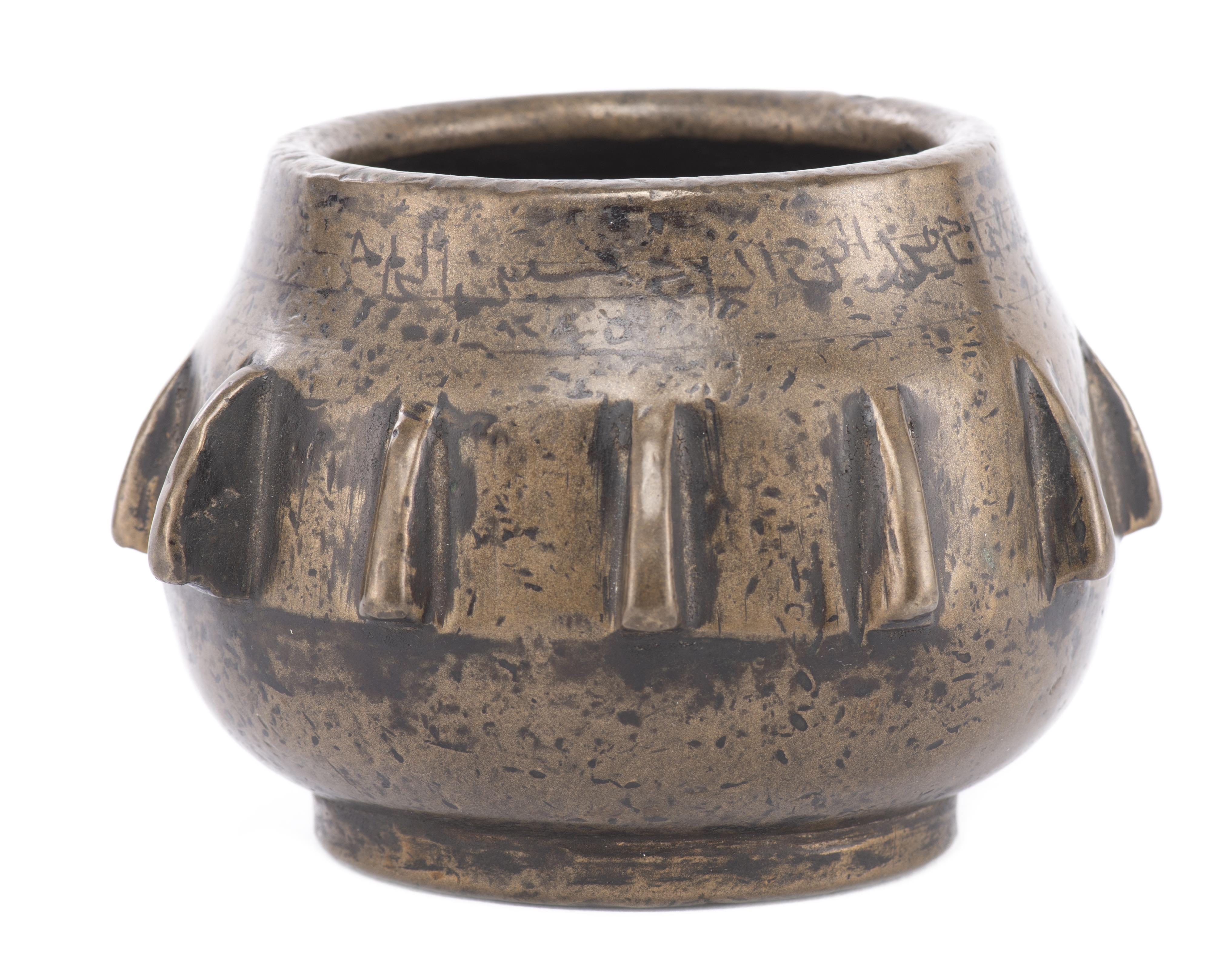 Mortier en bronze à patine brune à décor en relief de baguettes verticales sur la panse, inscription en arabe sur le col, Perse XII-XIIIe.