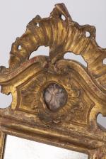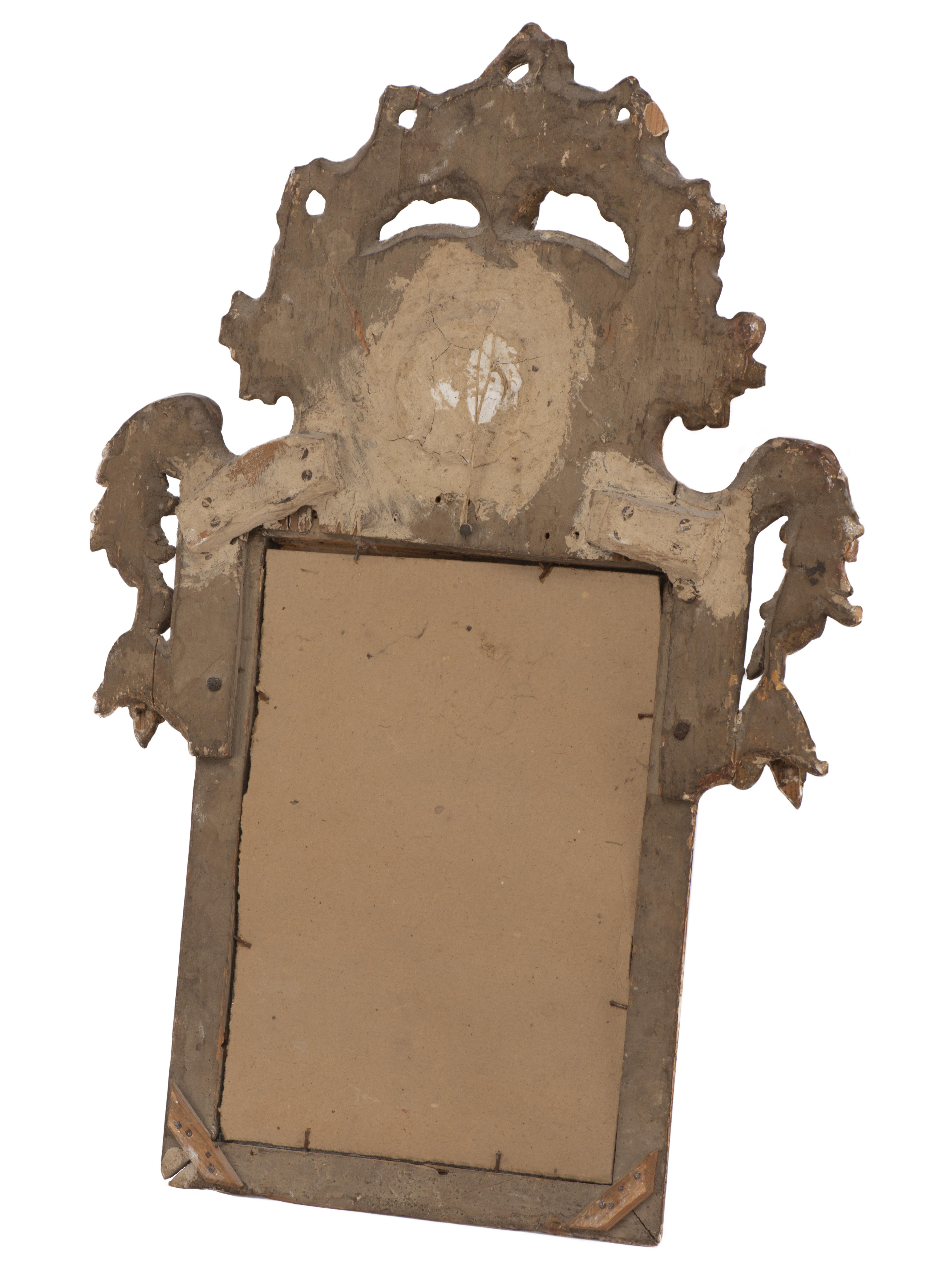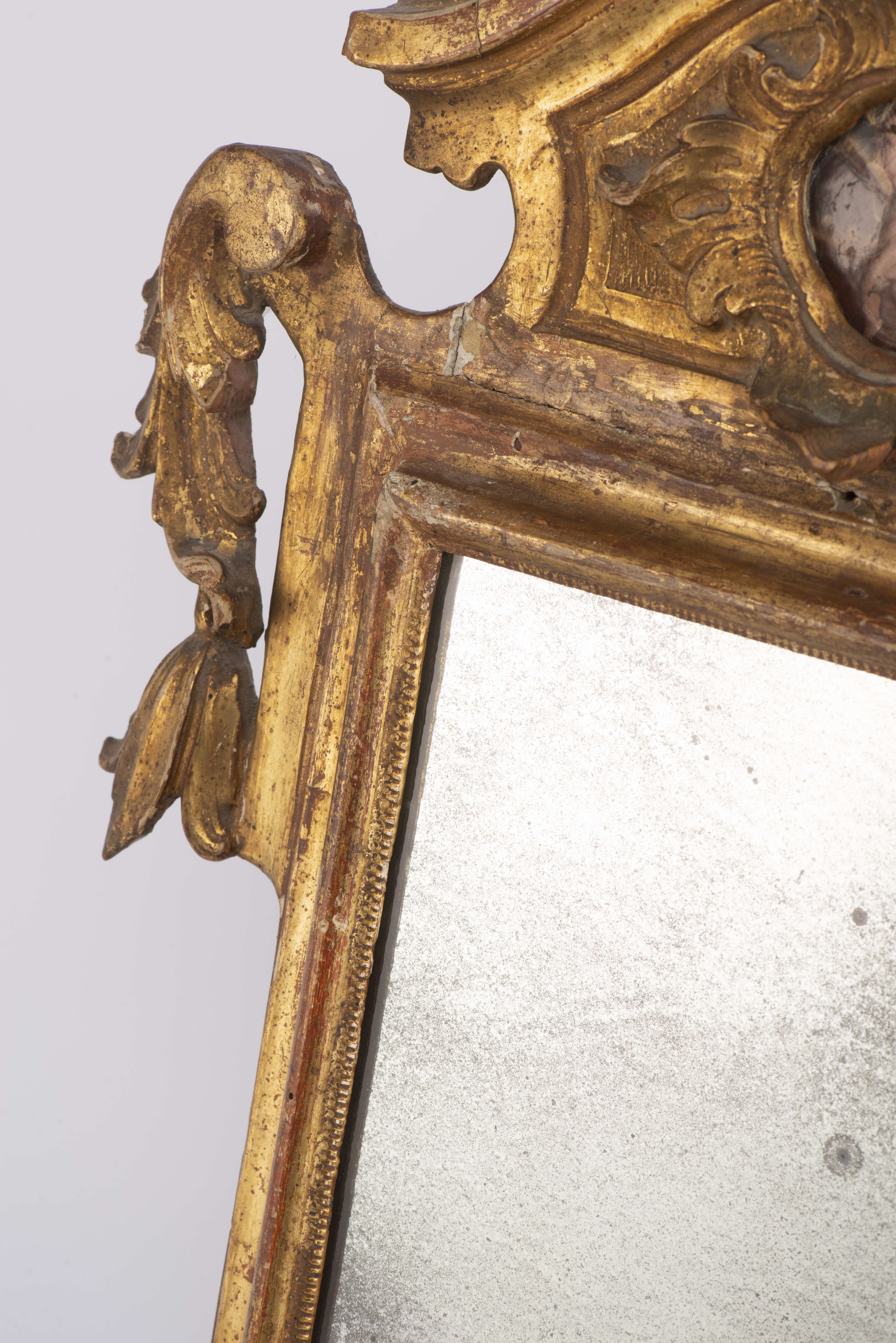 Miroir rectangulaire baroque espagnol à cadre en bois et stuc doré à fronton à médaillon d'un angelot peint sur de l'onyx orange. Glace ancienne.