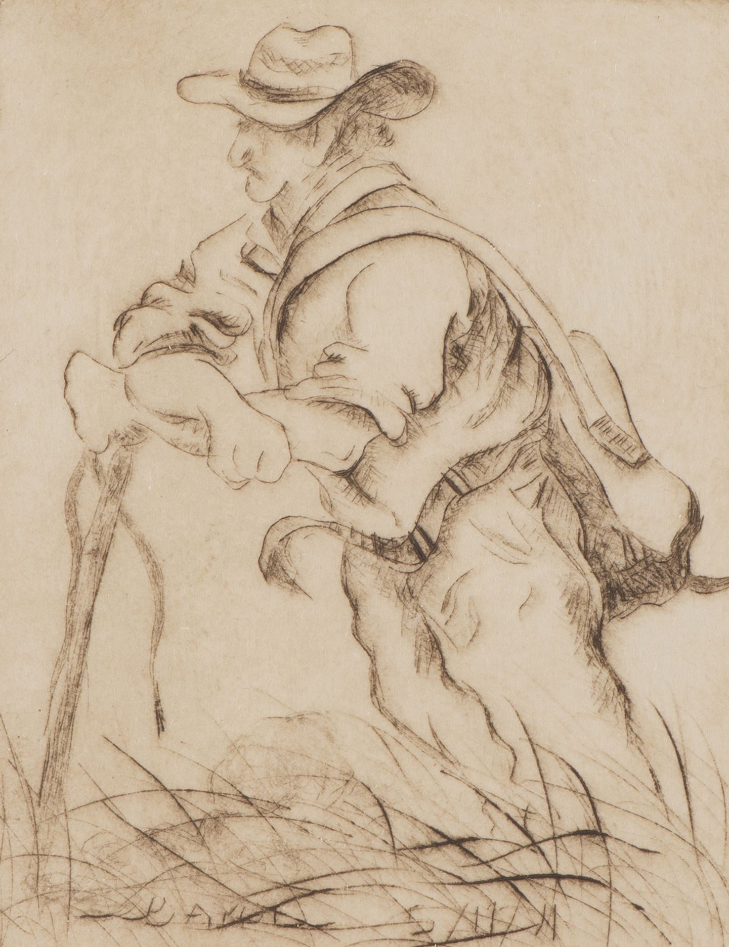 - "Homme appuyé sur son bâton", eau-forte, sbg et daté 5/11/11, sbd sous la plaque et numéroté 2/30.