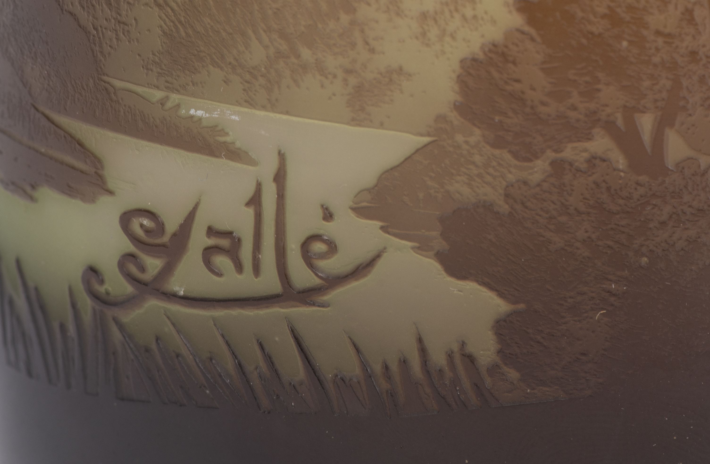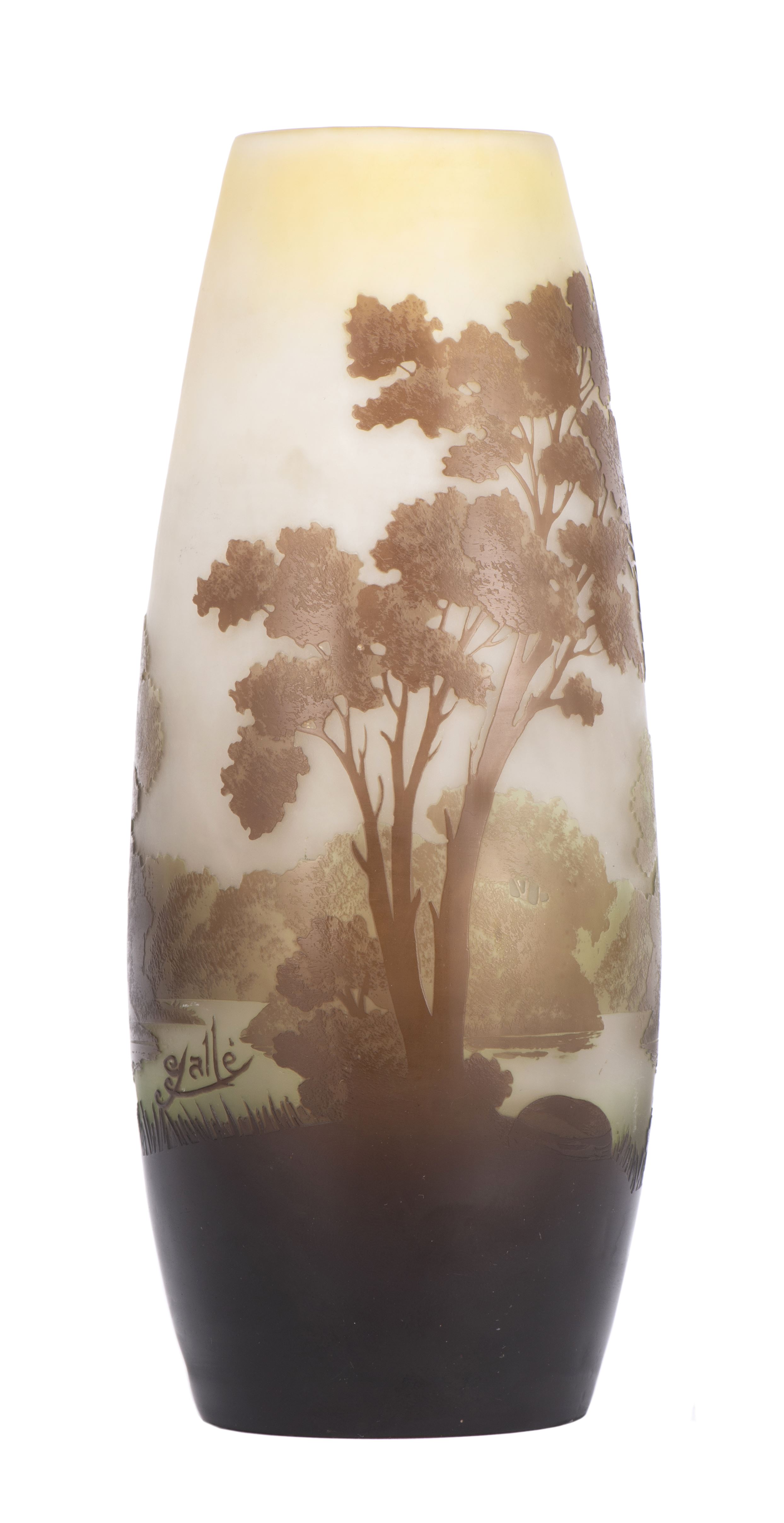 Emile GALLE (1846-1904), vase en verre multicouche à forme cylindrique arrondie et décor gravé à l'acide d'un paysage aux arbres en brun et vert sur fond jaune.