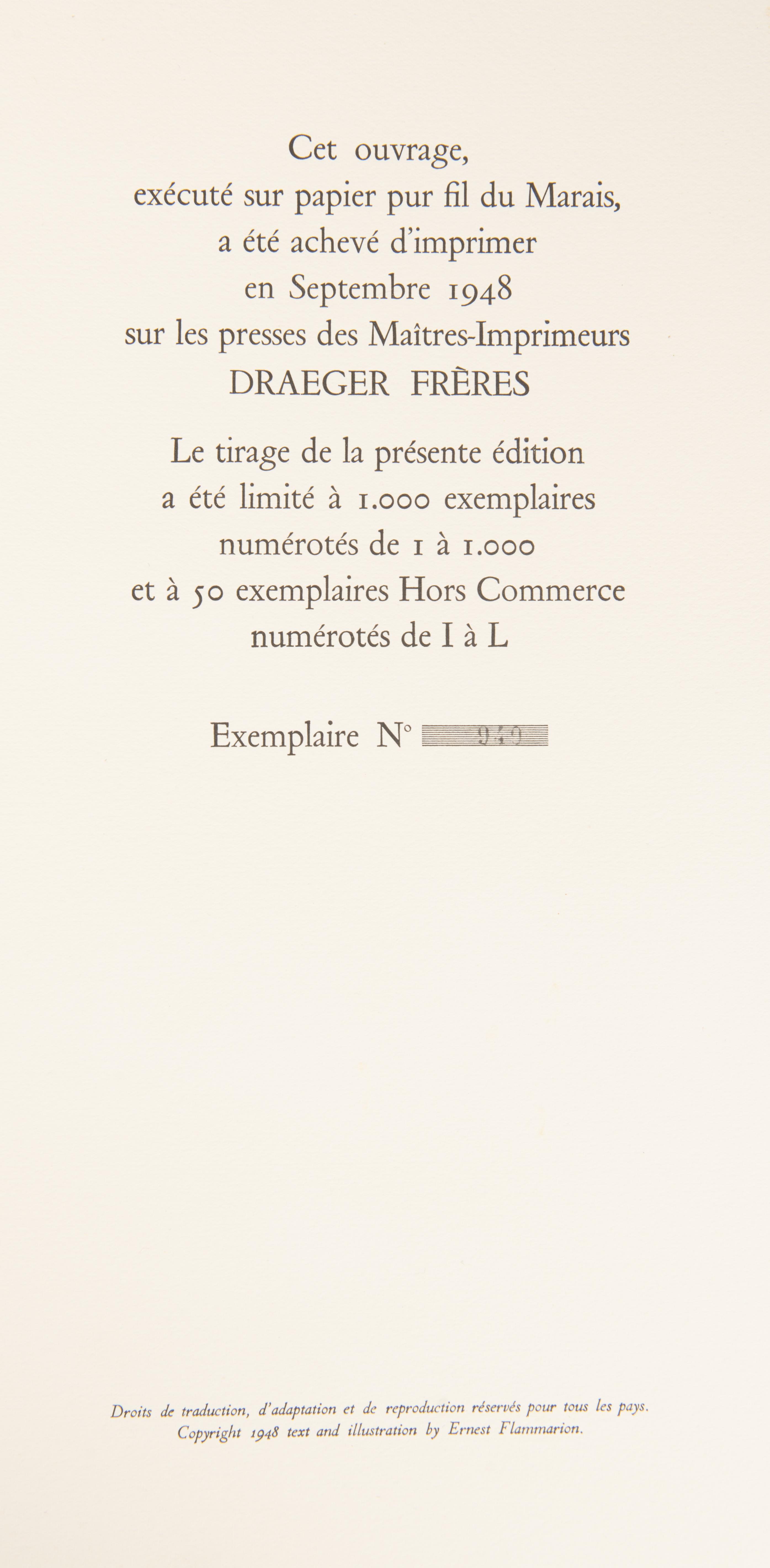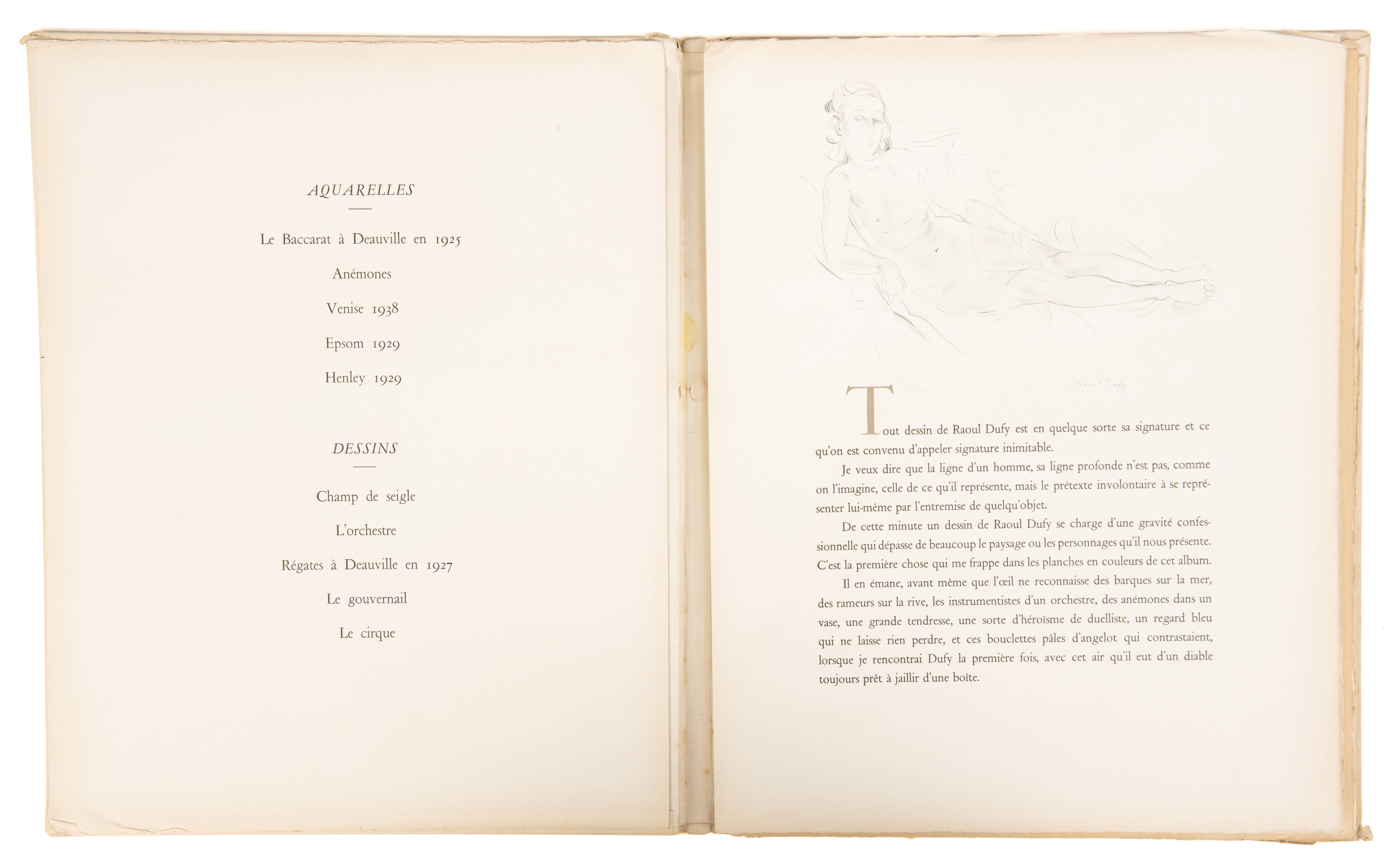 Edit. orig. tirée à 1050 ex. num. sur pur fil du Marais. Imprimerie Draeger Frères. Illustré de 5 aquarelles en couleurs, 5 dessins en noir et blanc de Raoul Dufy en pleine page et 2 dessins en noir et blanc in-texte. Complet.