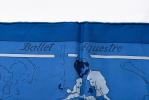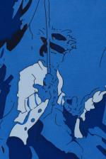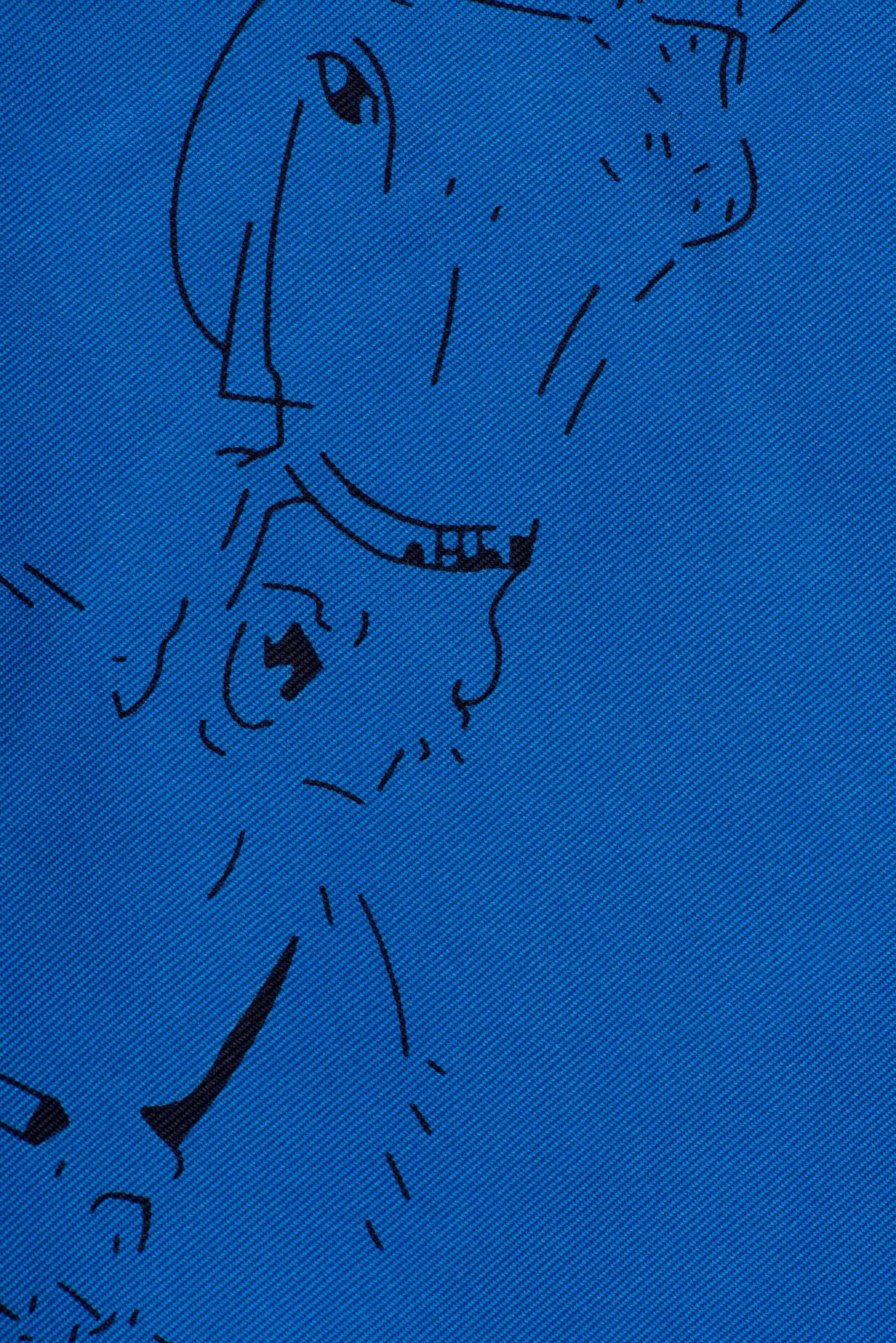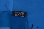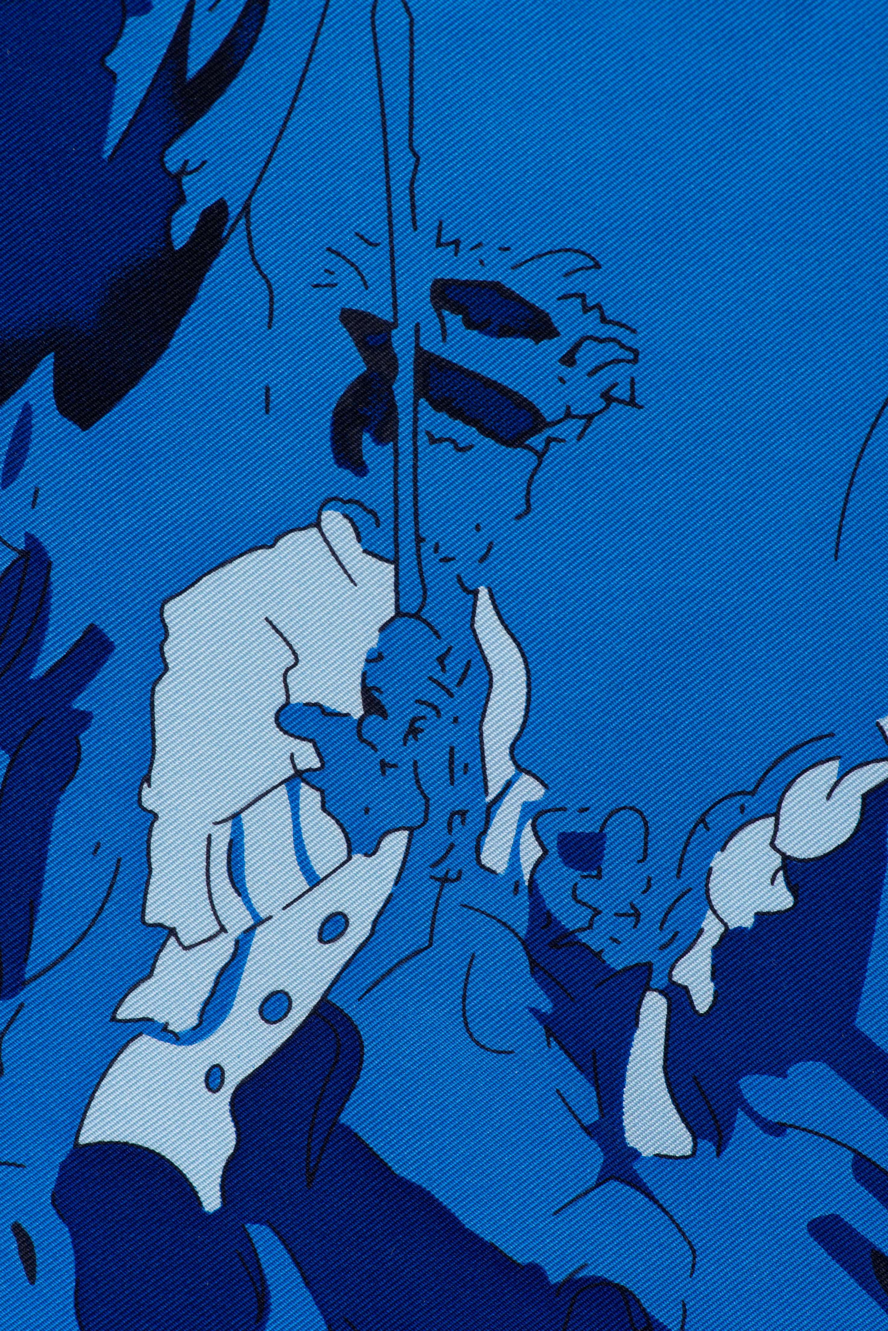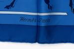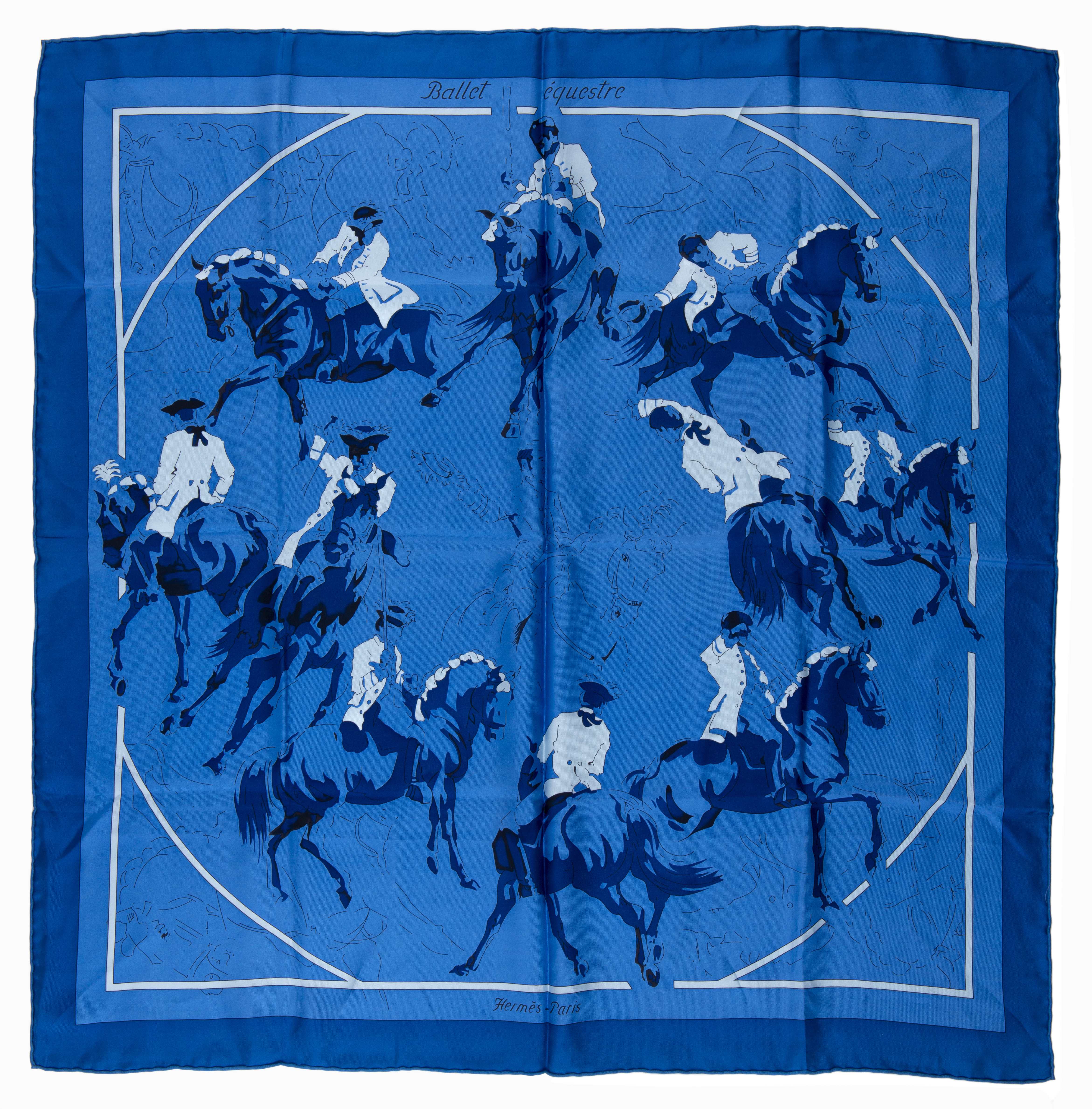 Hermès Carré en twill de soie "Ballet équestre" de 2007 par Hubert de Watrigant, bordure bleu foncé sur champ bleu ciel.