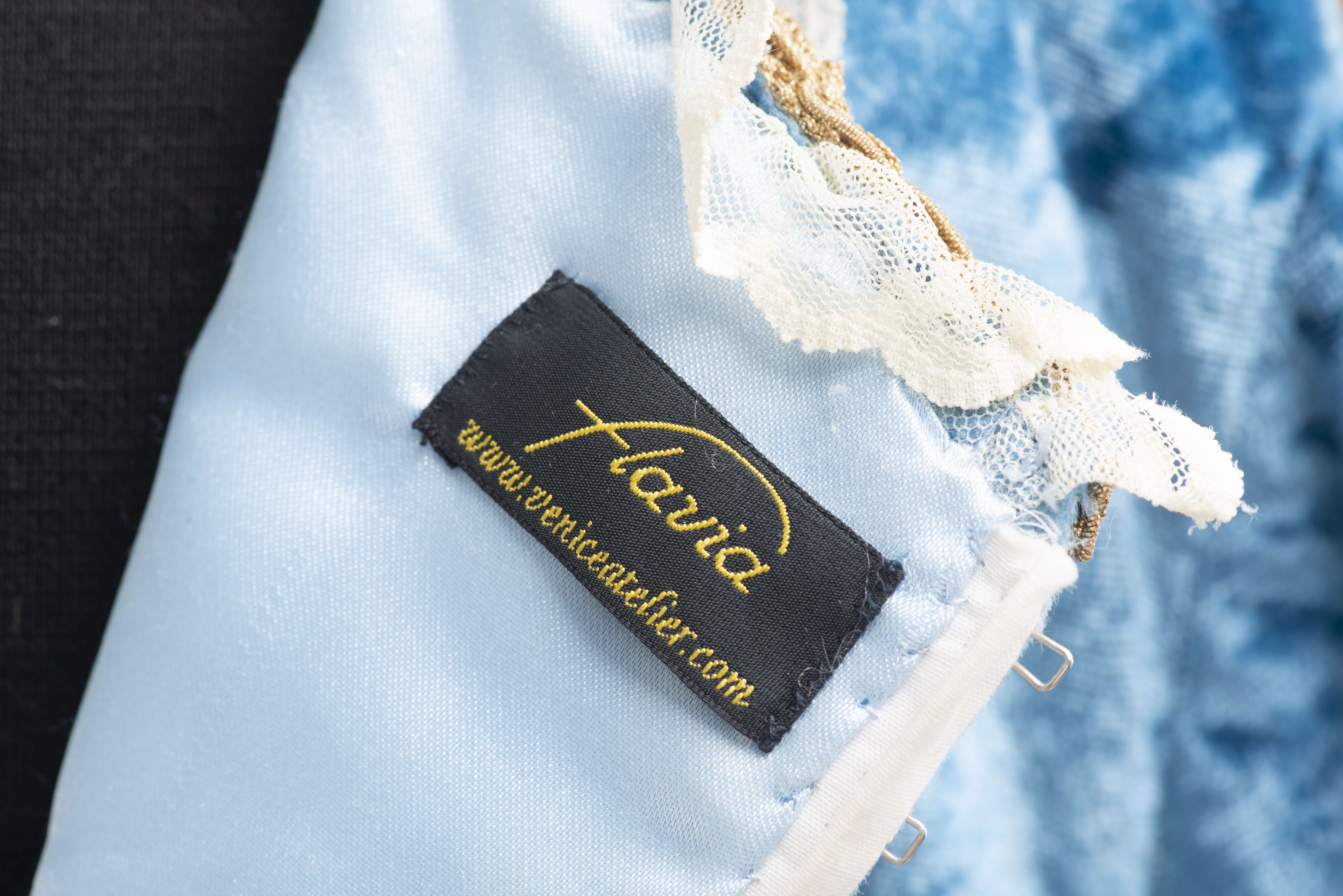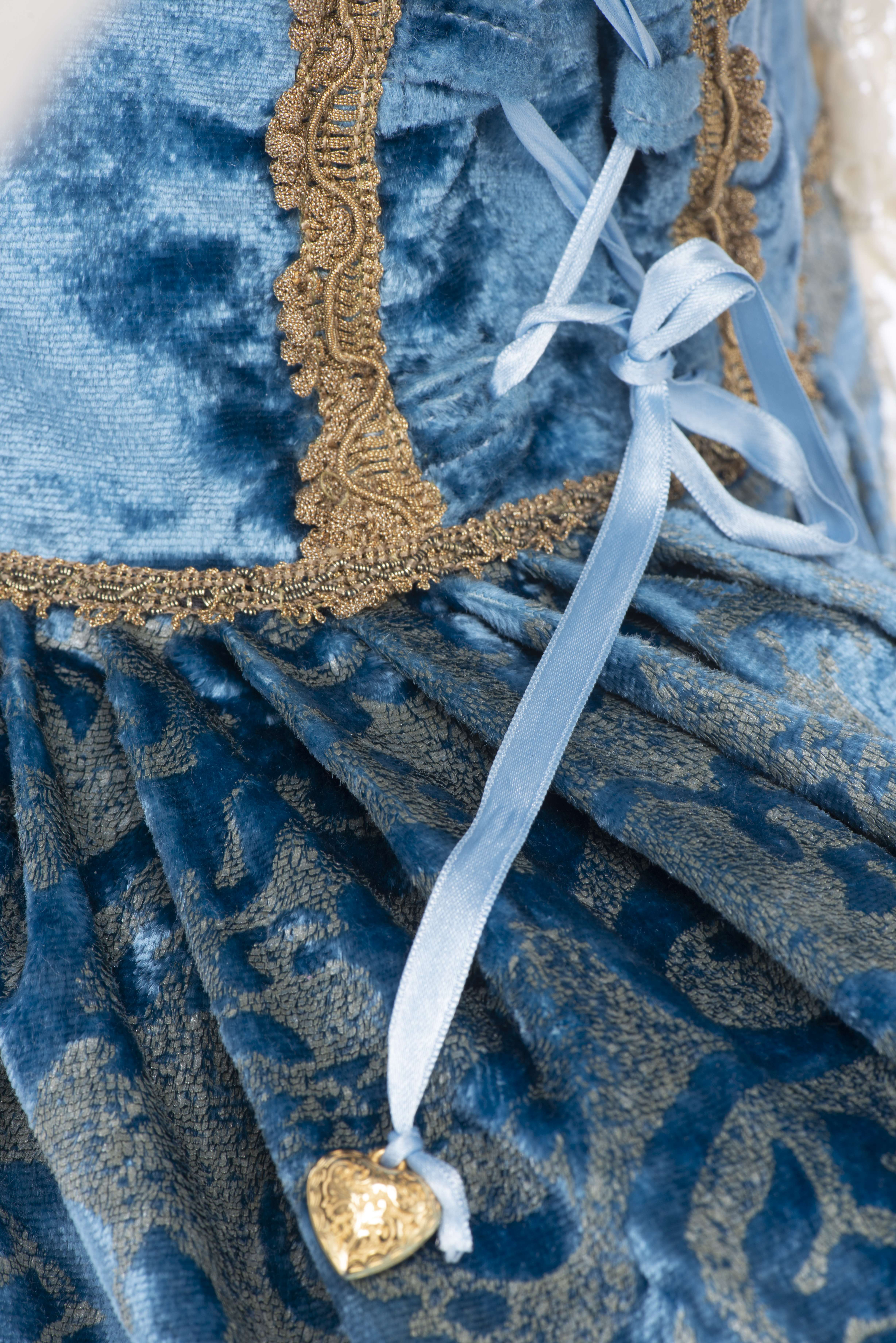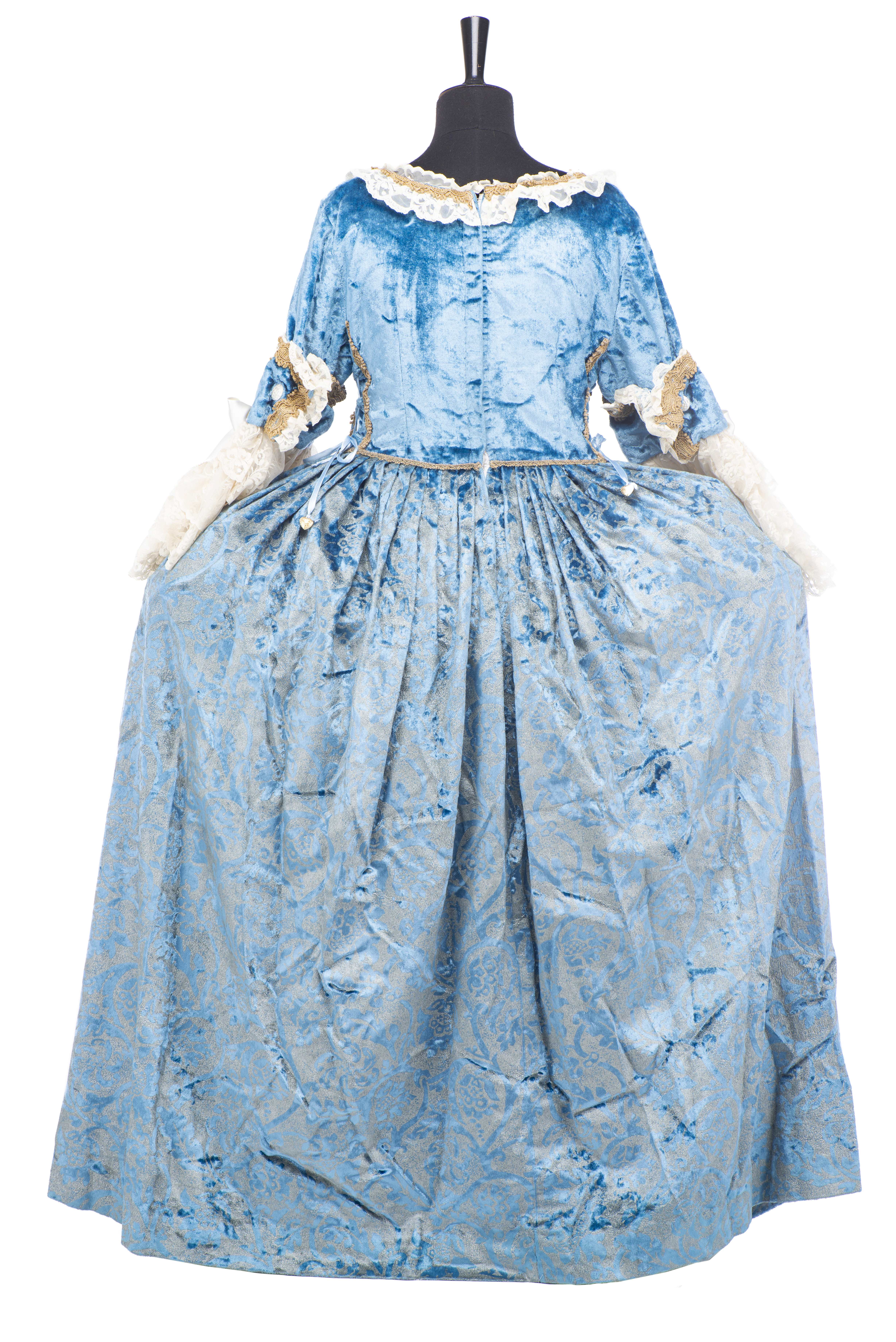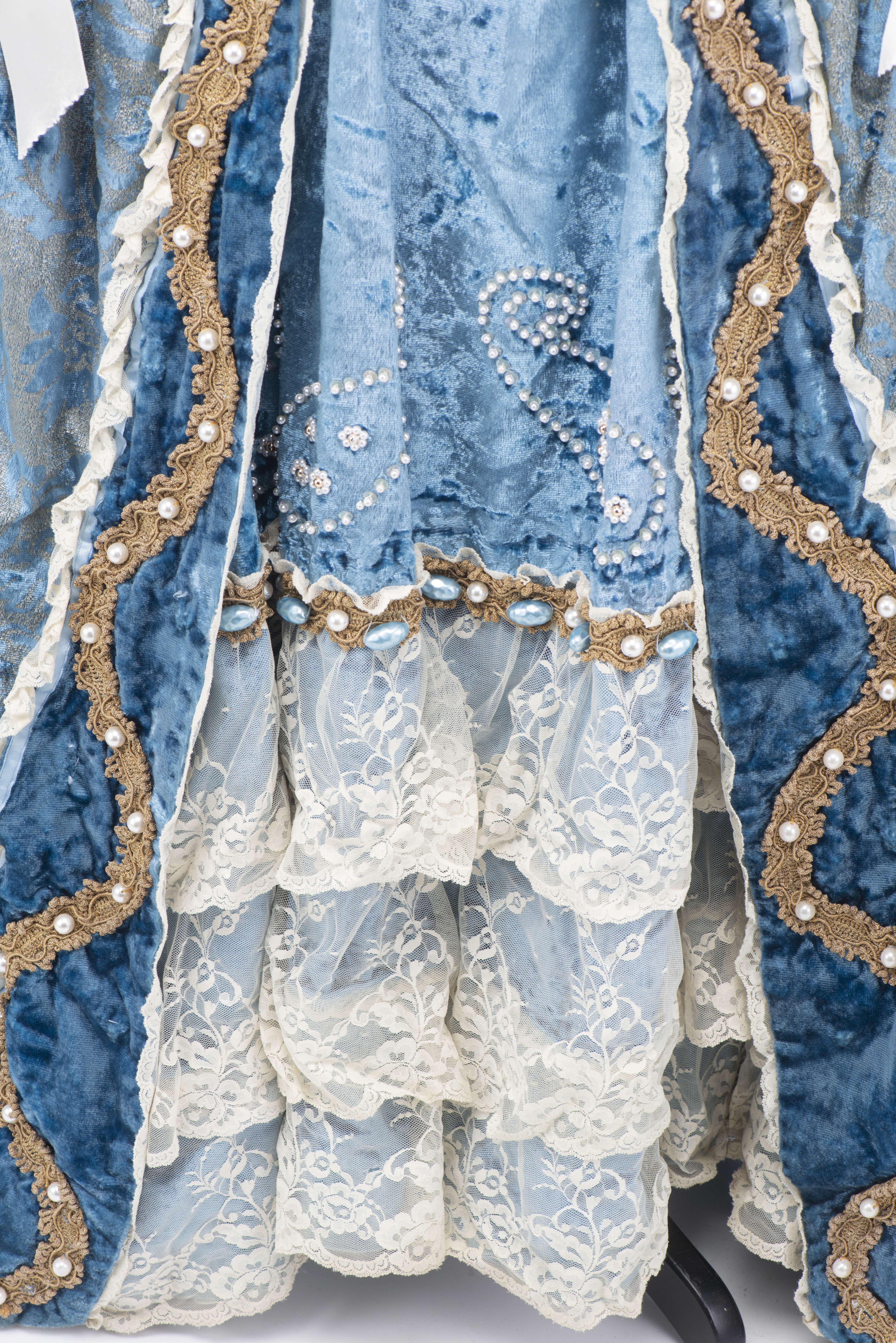 Robe de carnaval de Venise comprenant un tricorne, un loup et une bourse. Le tout réalisé par l'atelier Flavia à Venise, pièces uniques agrémentées de tissus précieux, dentelles, passementerie et perles.