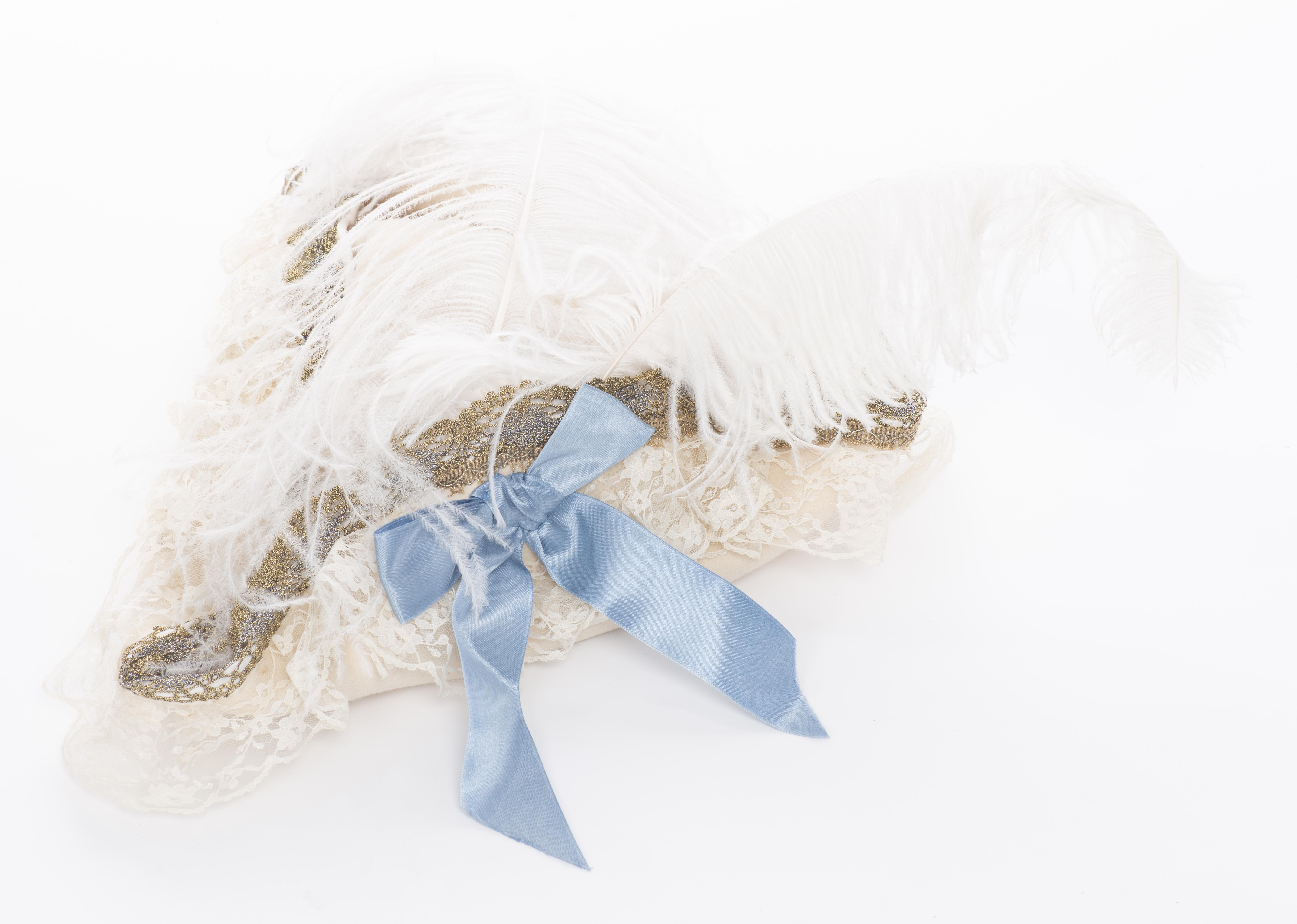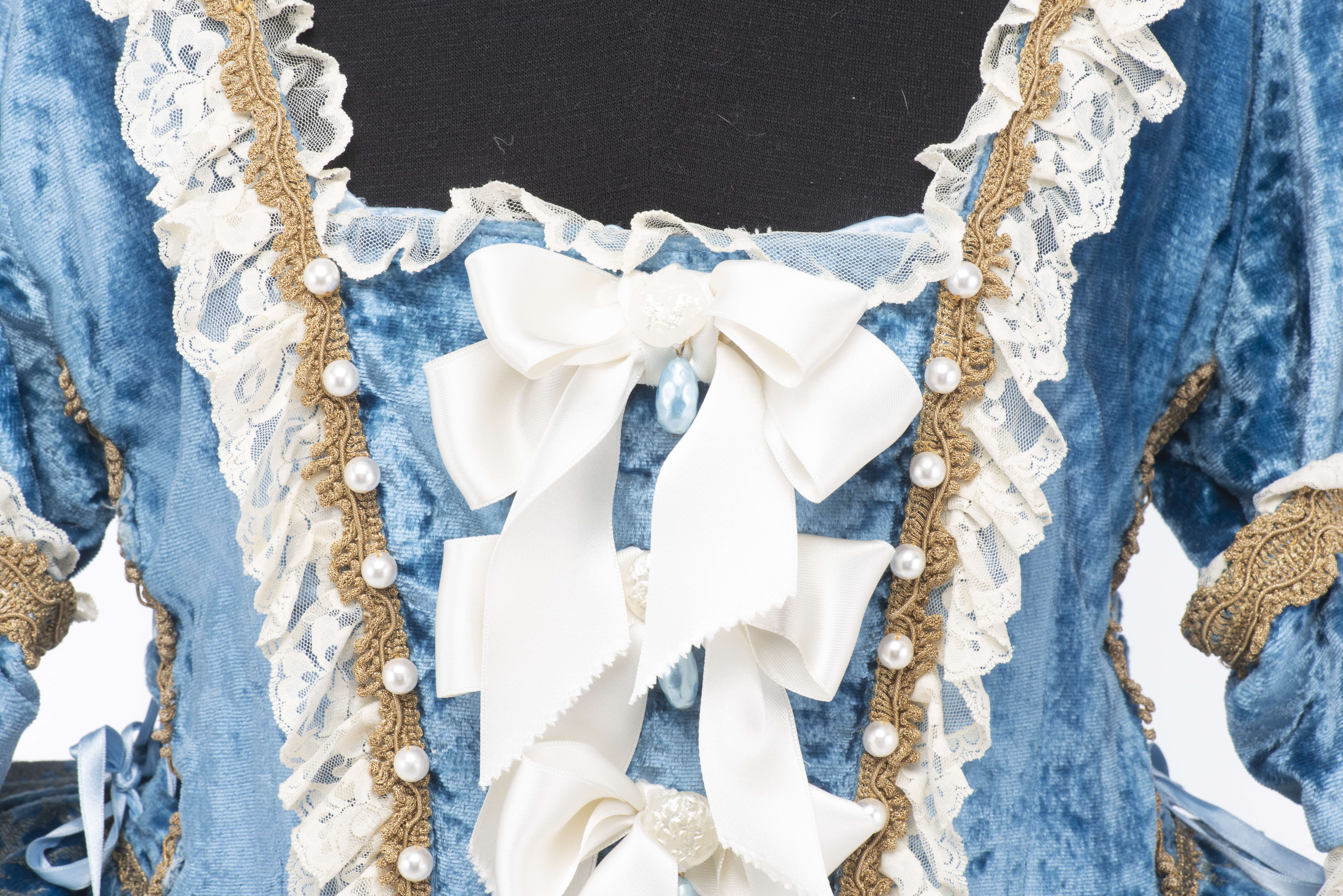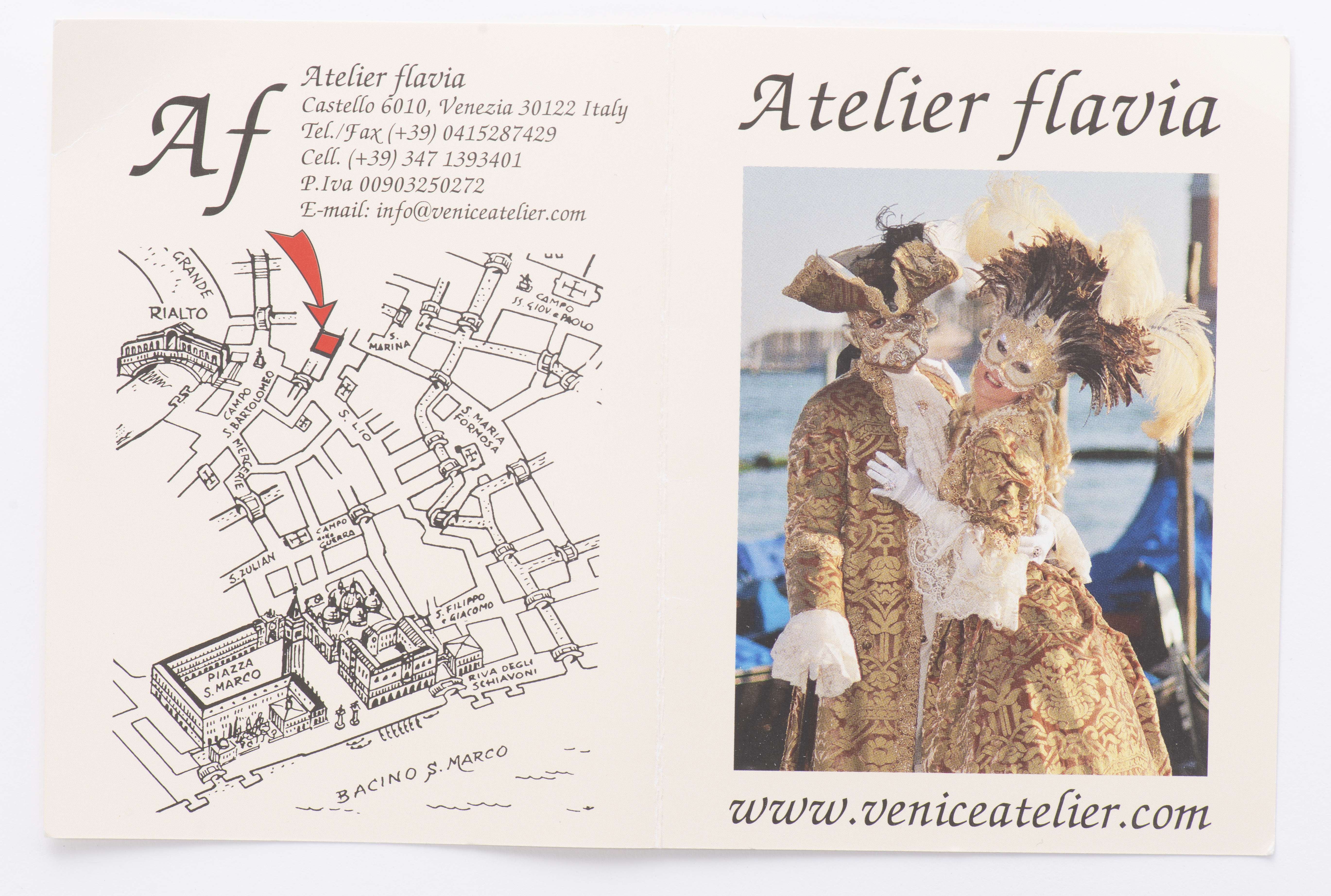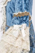Robe de carnaval de Venise comprenant un tricorne, un loup et une bourse. Le tout réalisé par l'atelier Flavia à Venise, pièces uniques agrémentées de tissus précieux, dentelles, passementerie et perles.