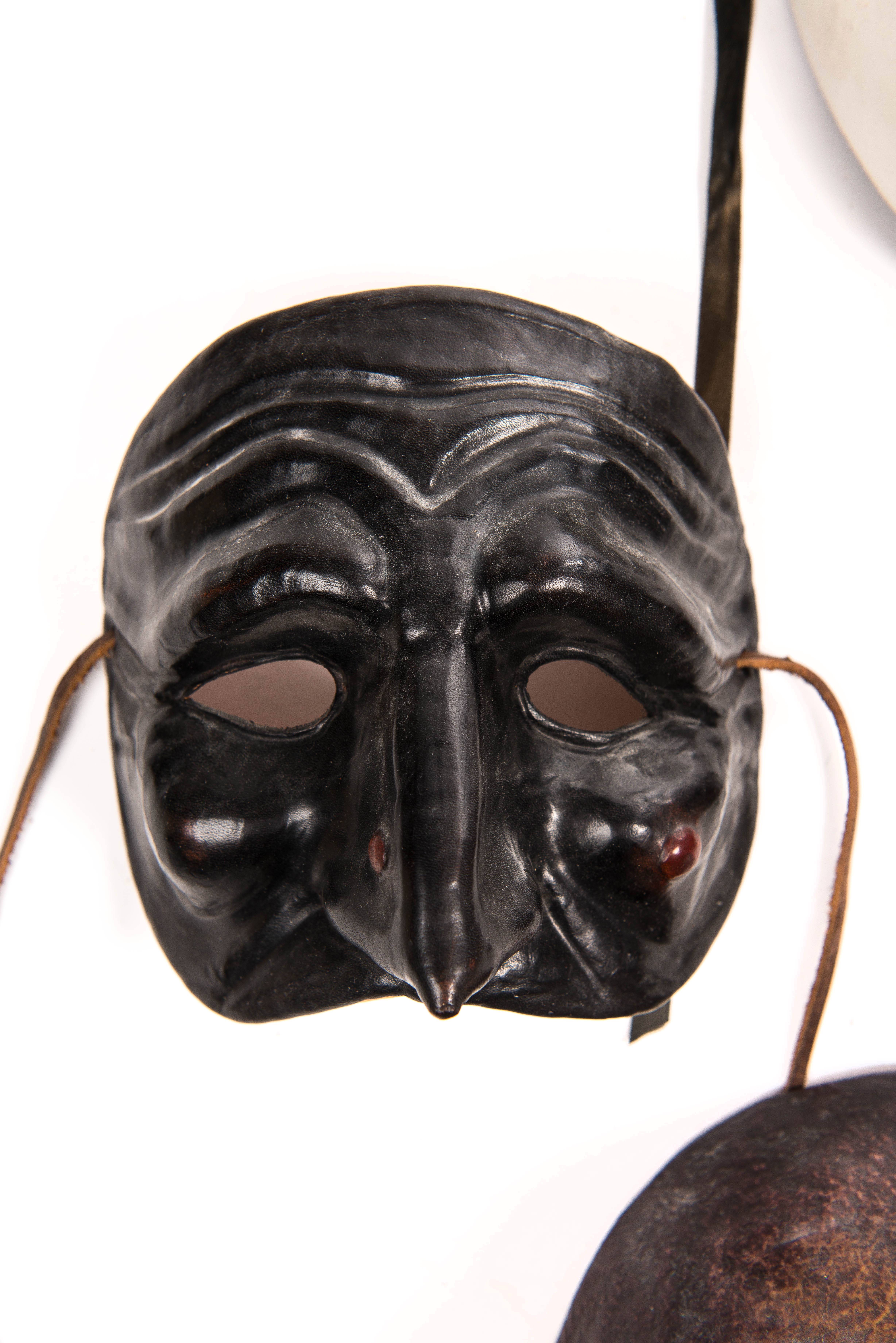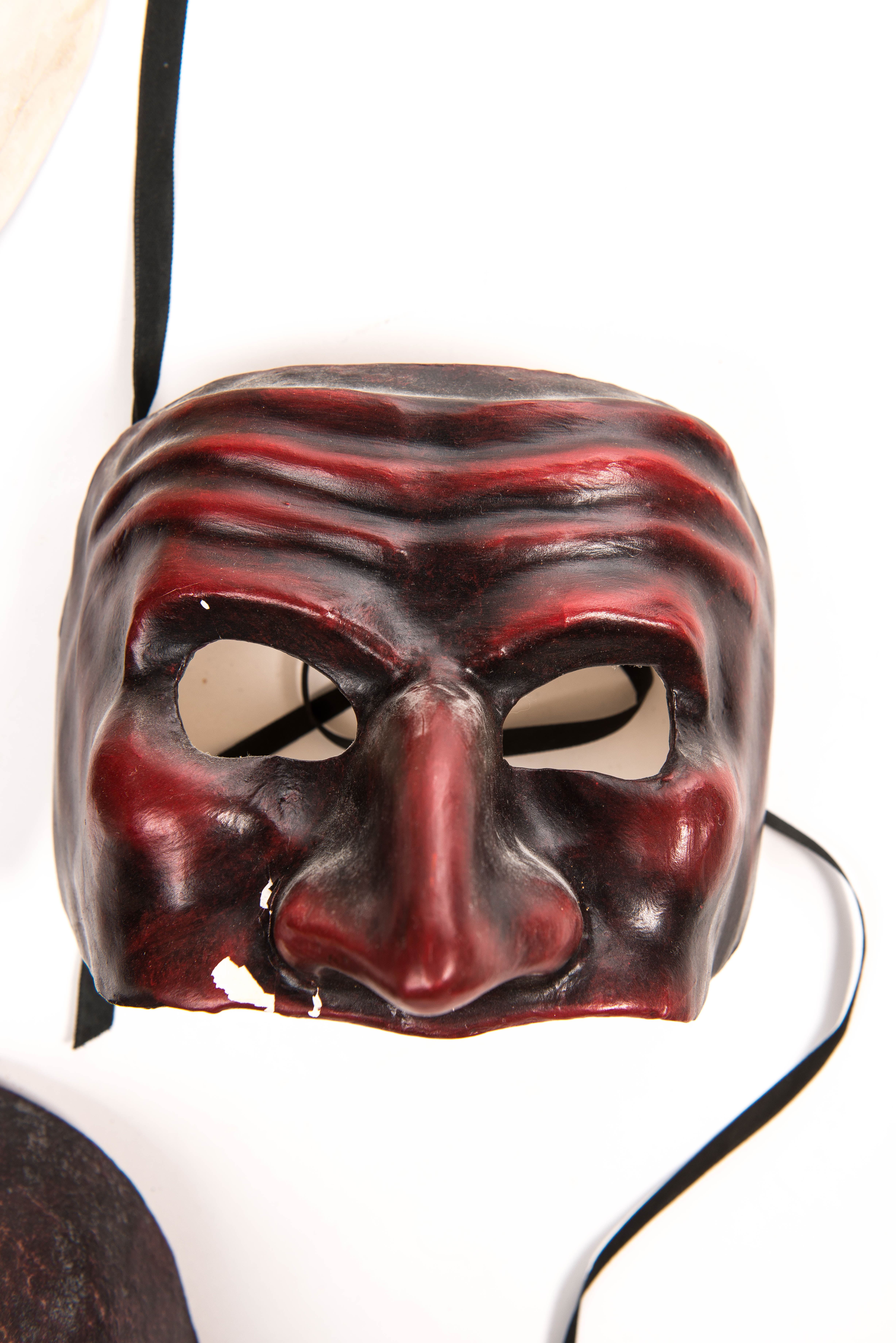 Quatre masques de la Commedia dell'Arte en cuir et papier mâché :