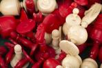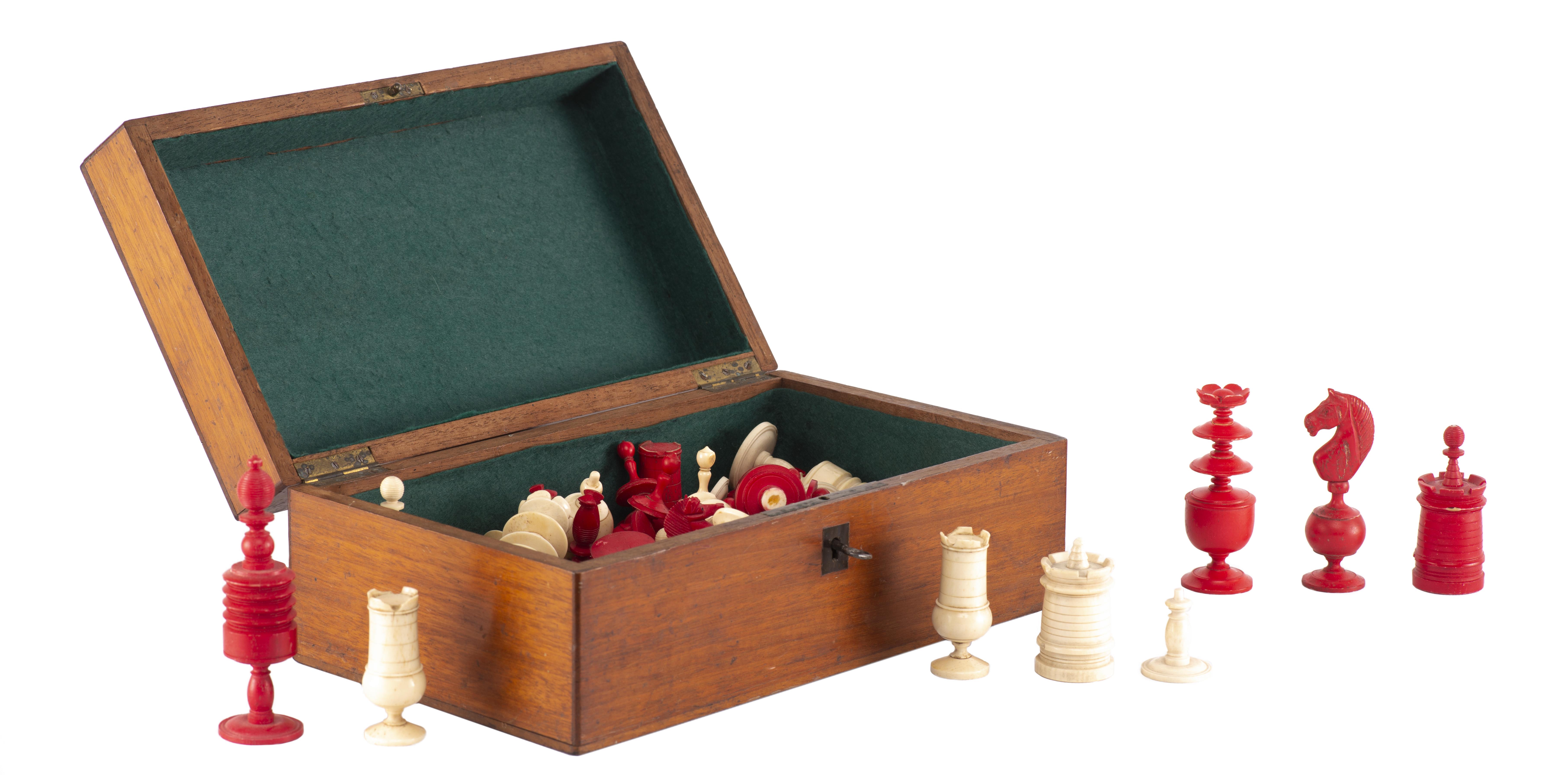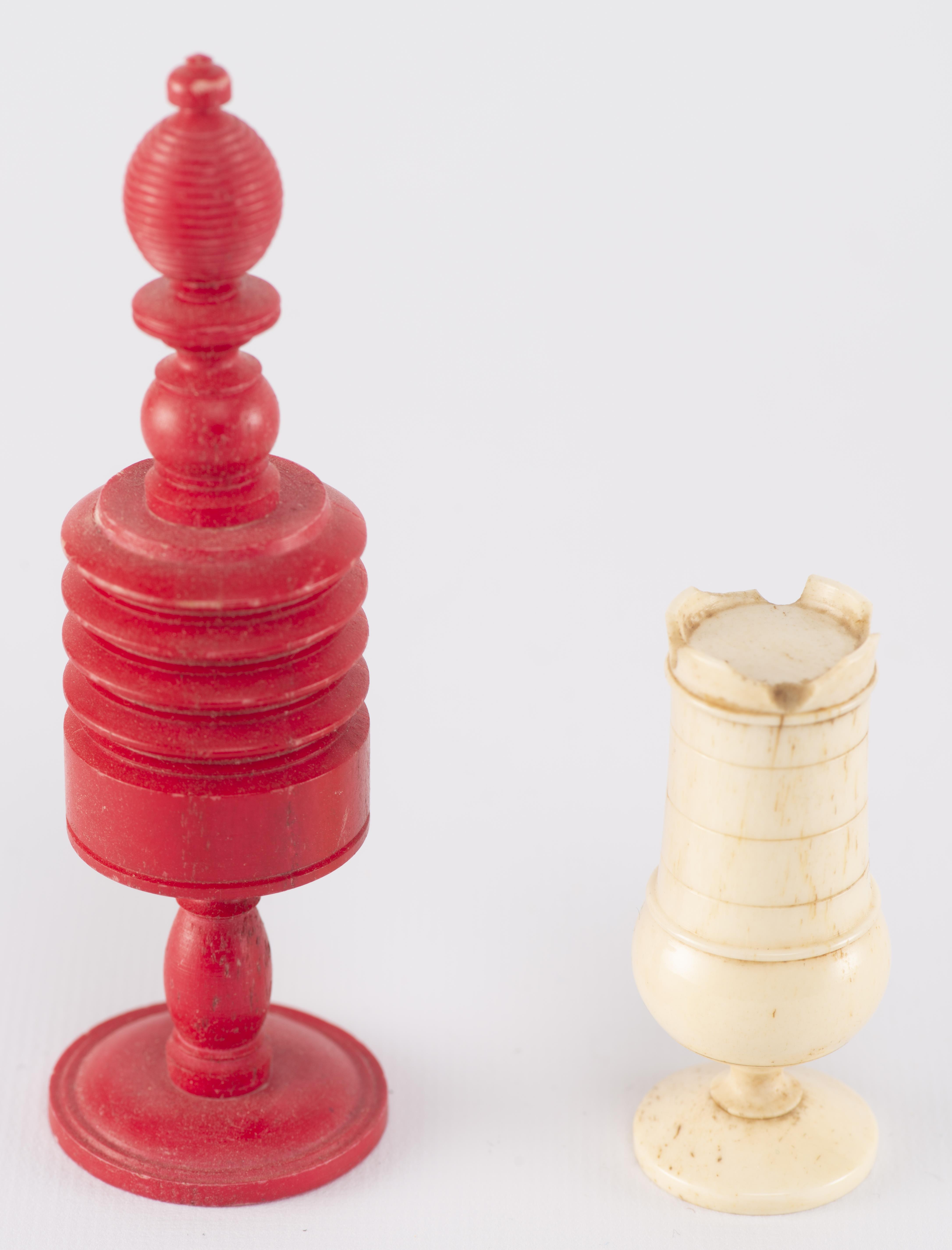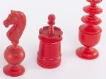 Jeu d'échec anglais en os et ivoire teinté en rouge et en blanc.