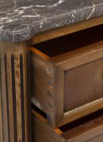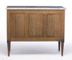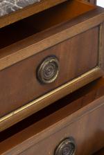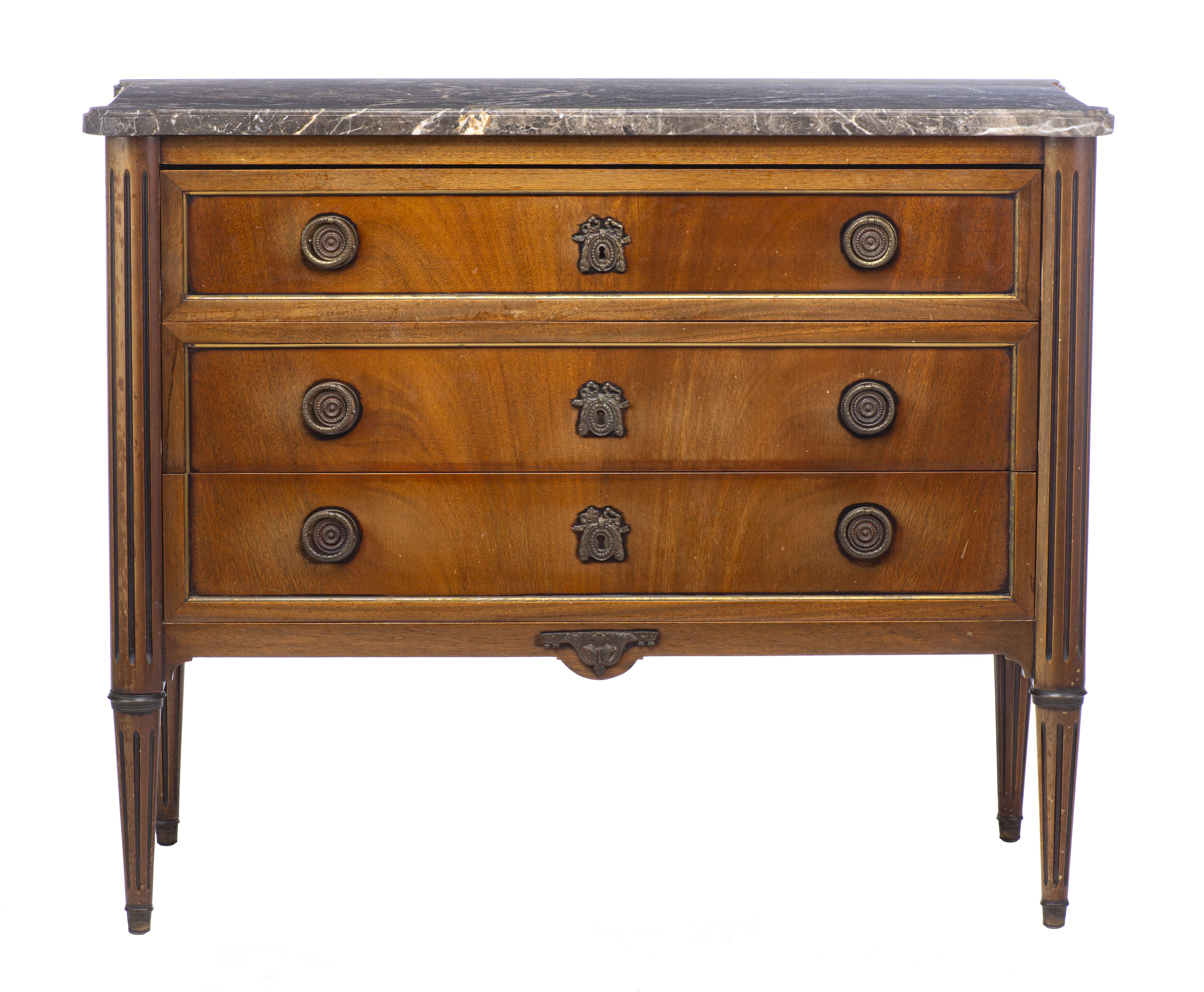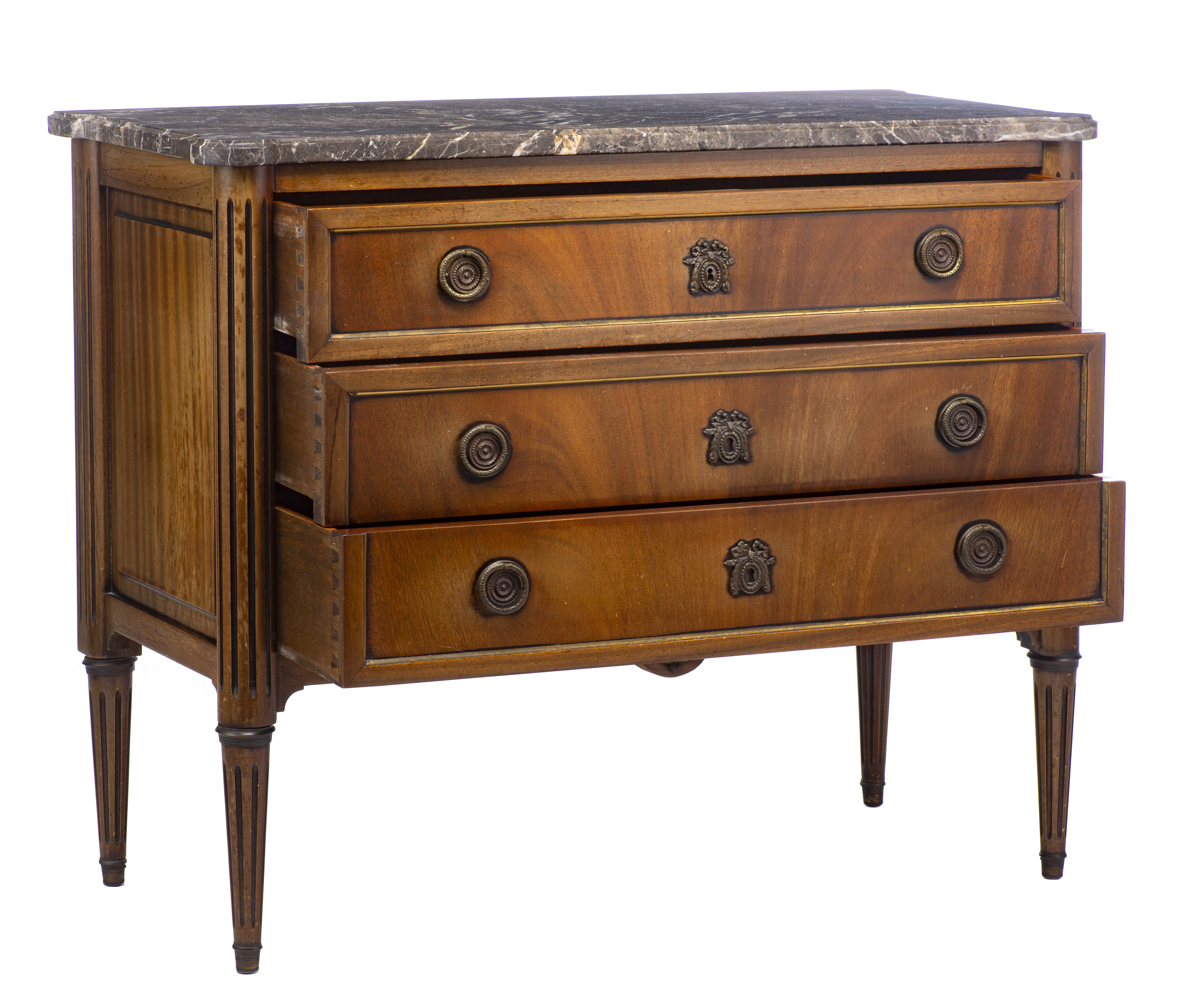 Commode en acajou de style Louis XVI à 3 tiroirs, dessus de marbre de Campan gris rubanné.