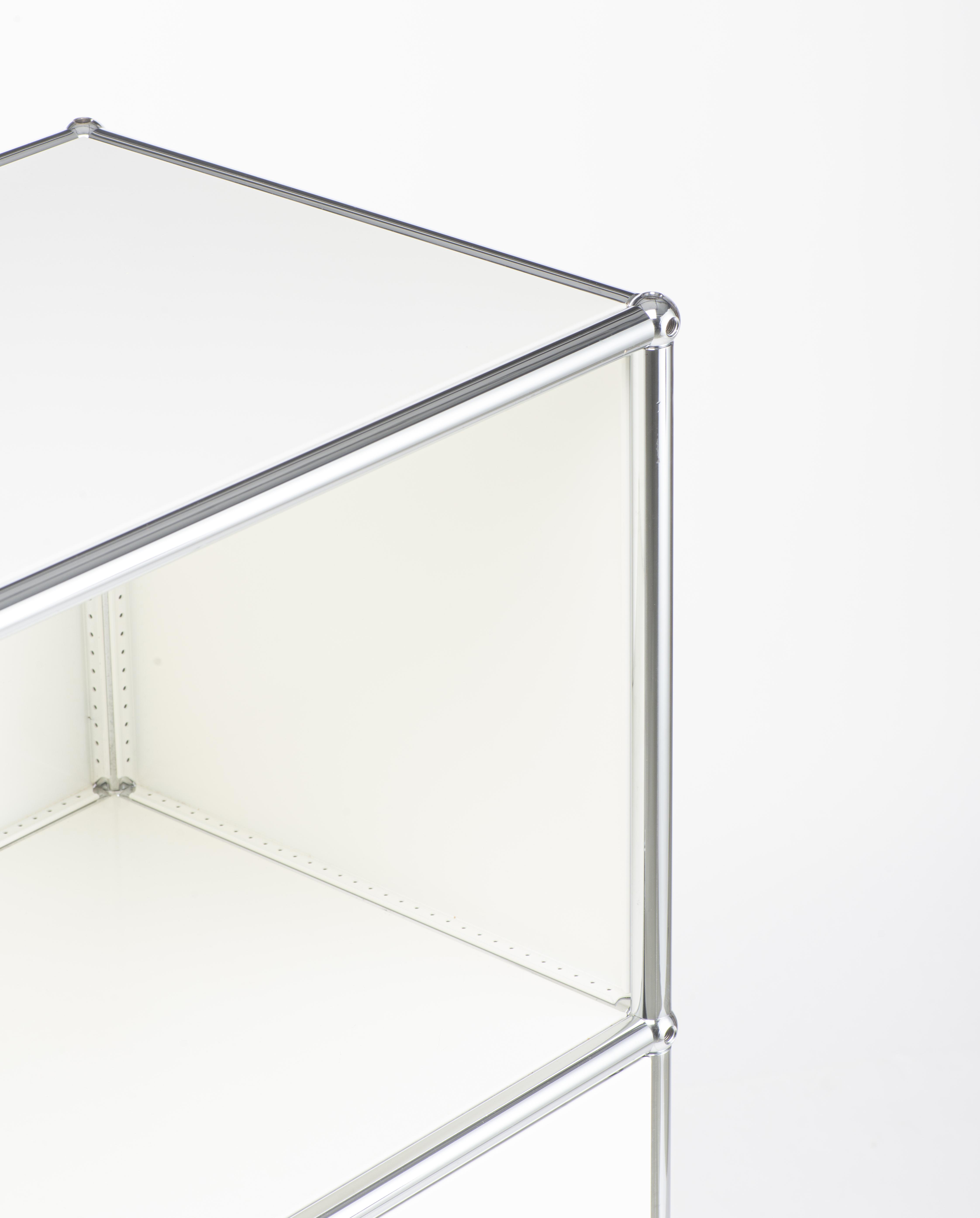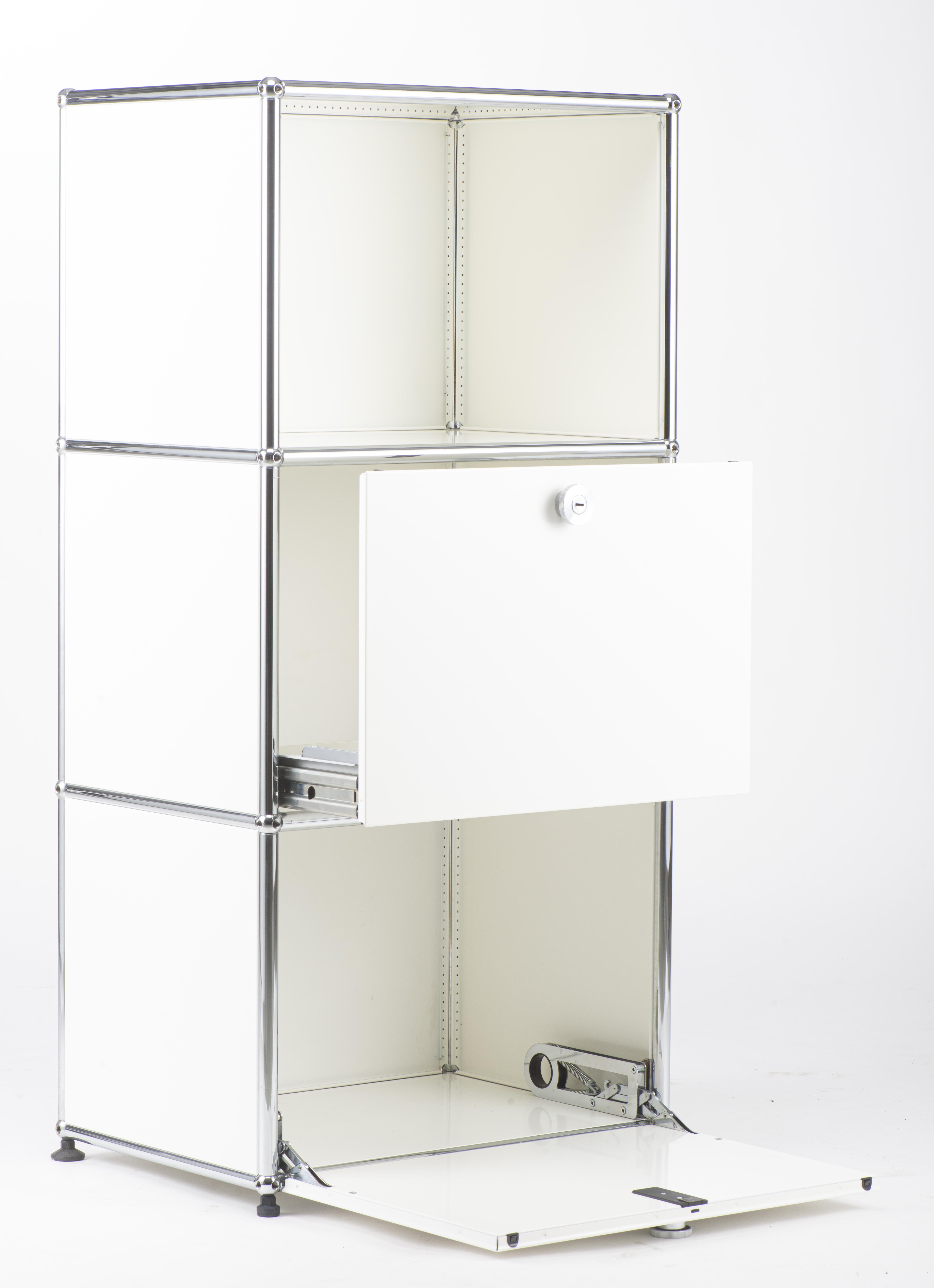 USM, meuble de rangement laqué blanc à 3 compartiments, une niche ouverte, un tiroir coulissant et une niche avec un battant.