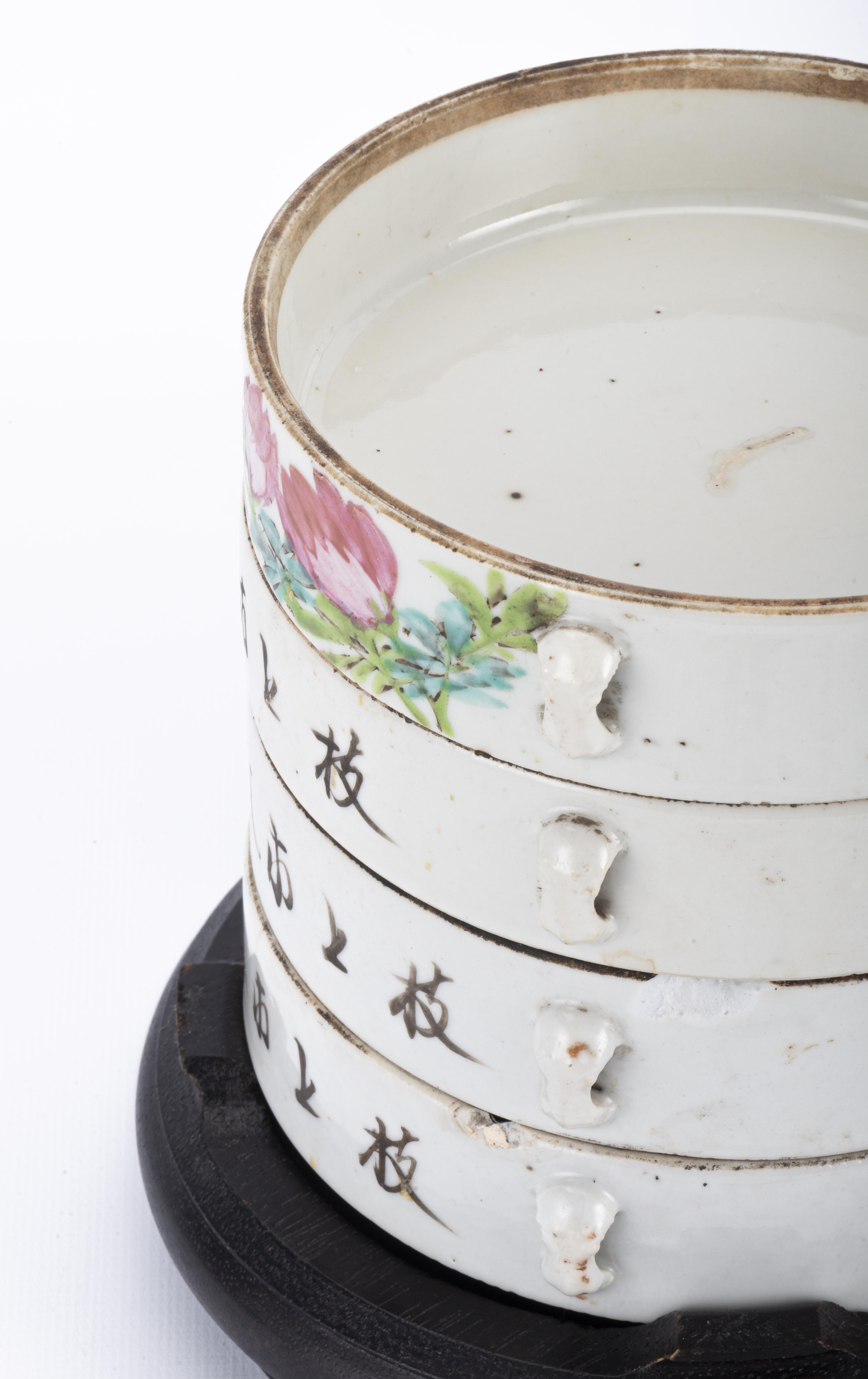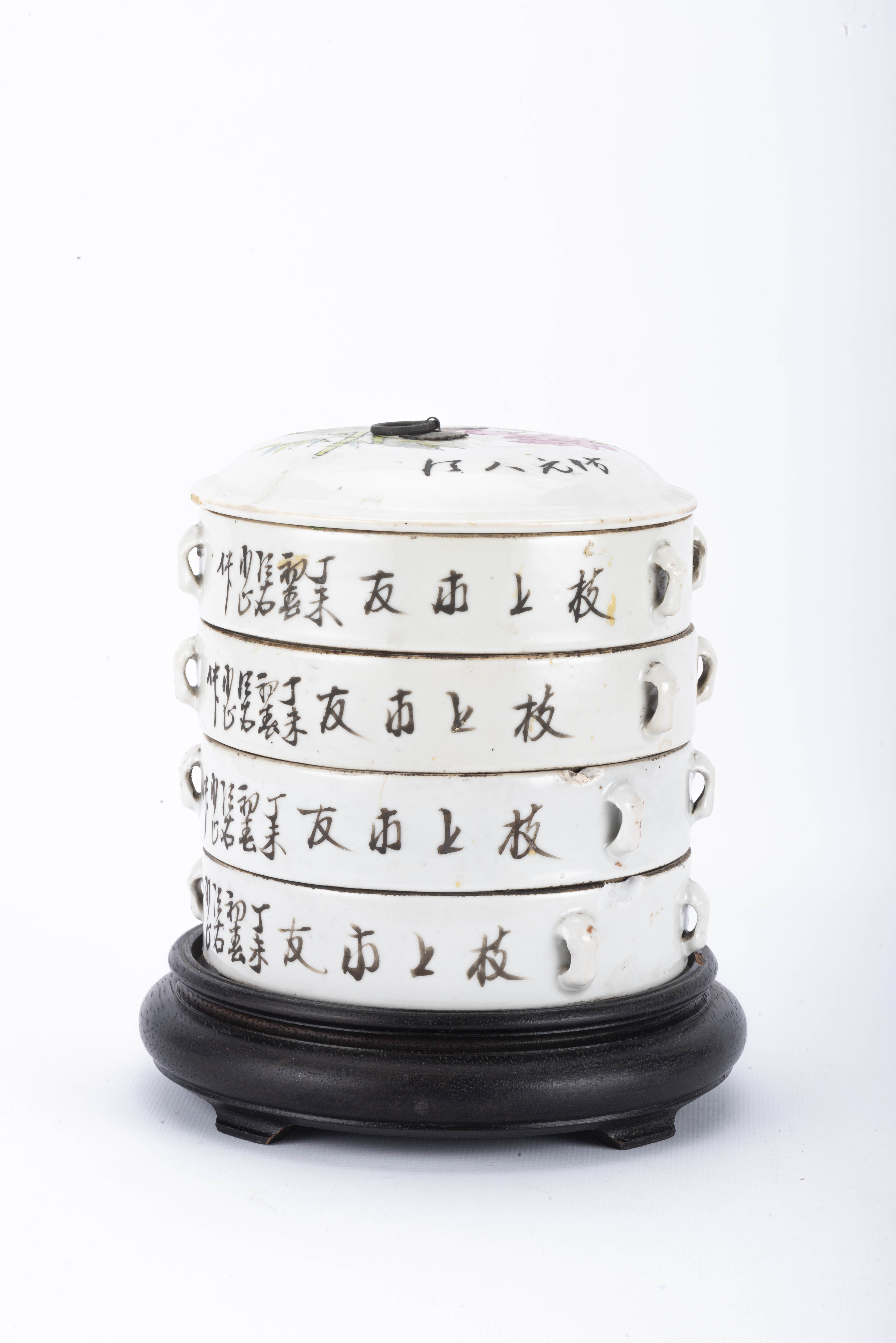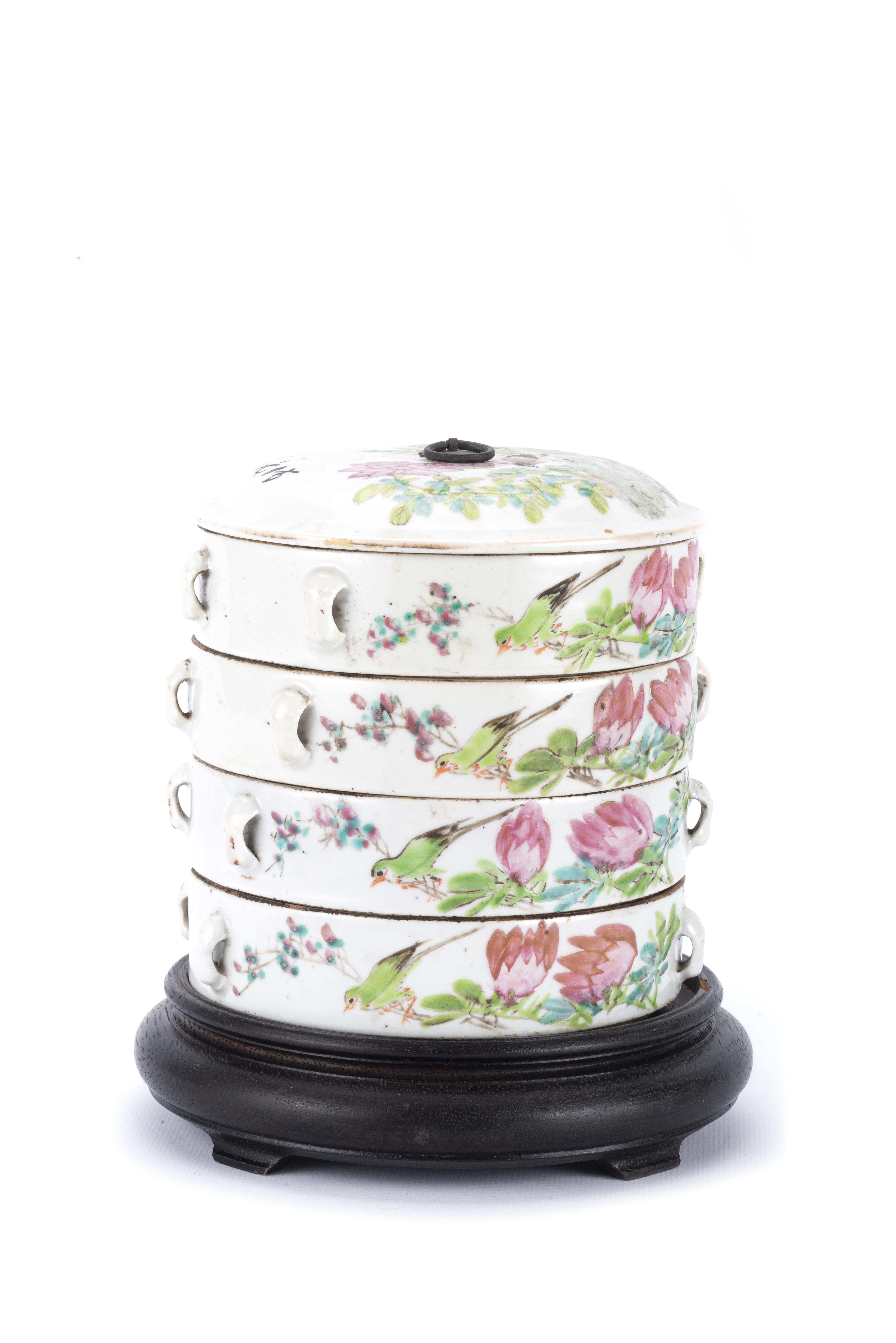 Quatre boîtes cylindriques empilables en porcelaine de Chine à décor en famille rose de fleurs et oiseaux et caractères avec couvercle. Fin des Qing.