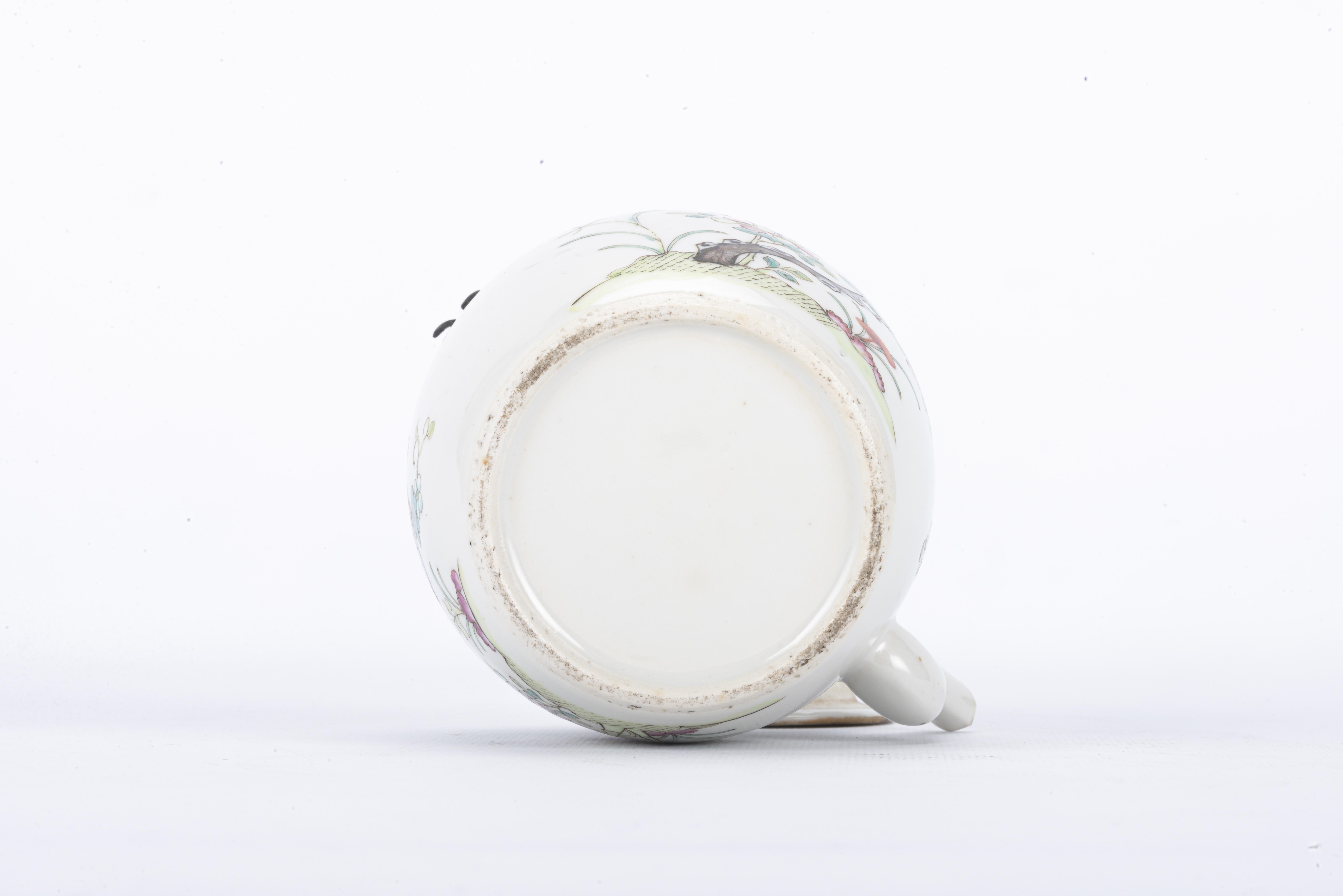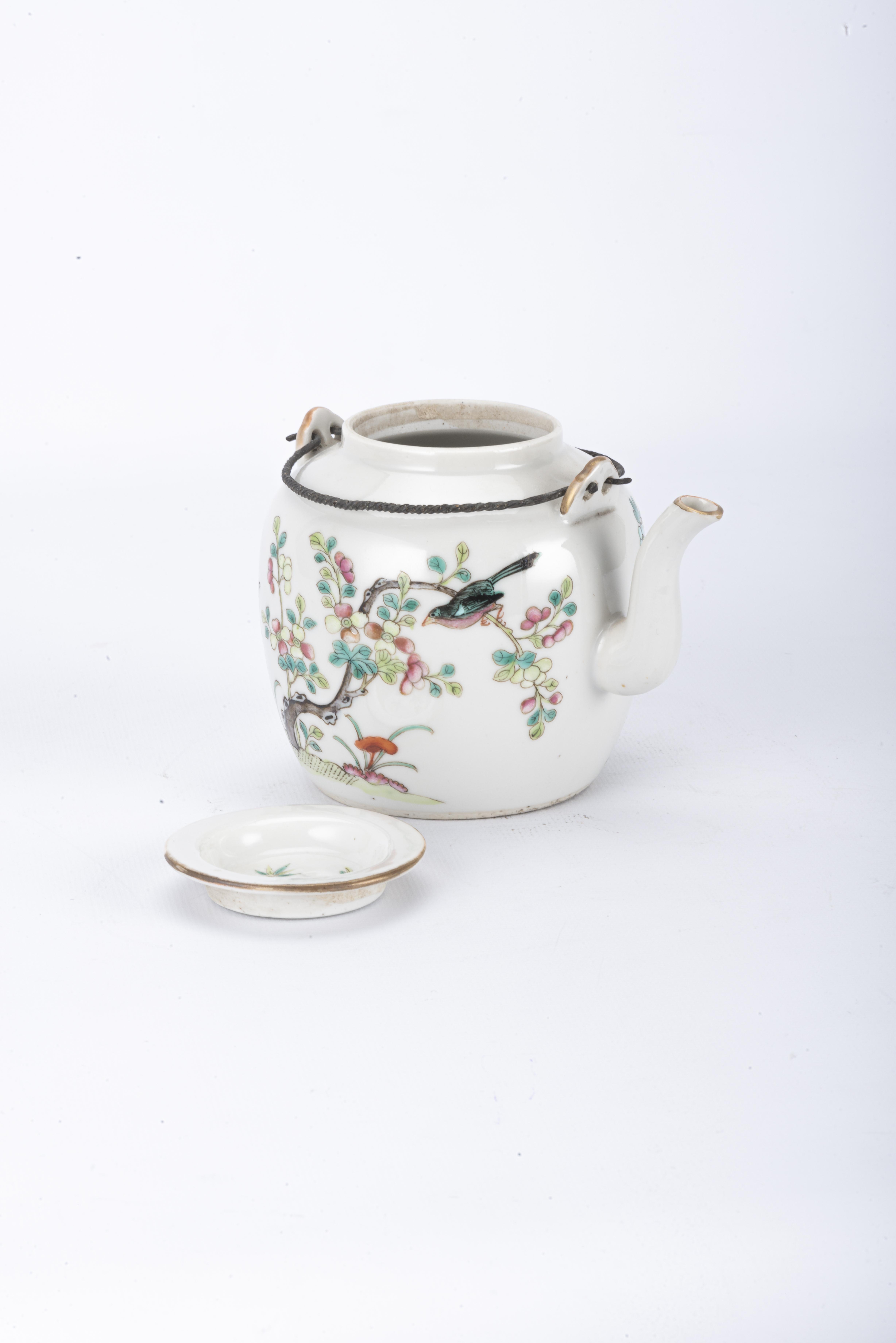 Théière en porcelaine de Chine à décor en famille rose de fleurs et oiseaux, fin des Qing.