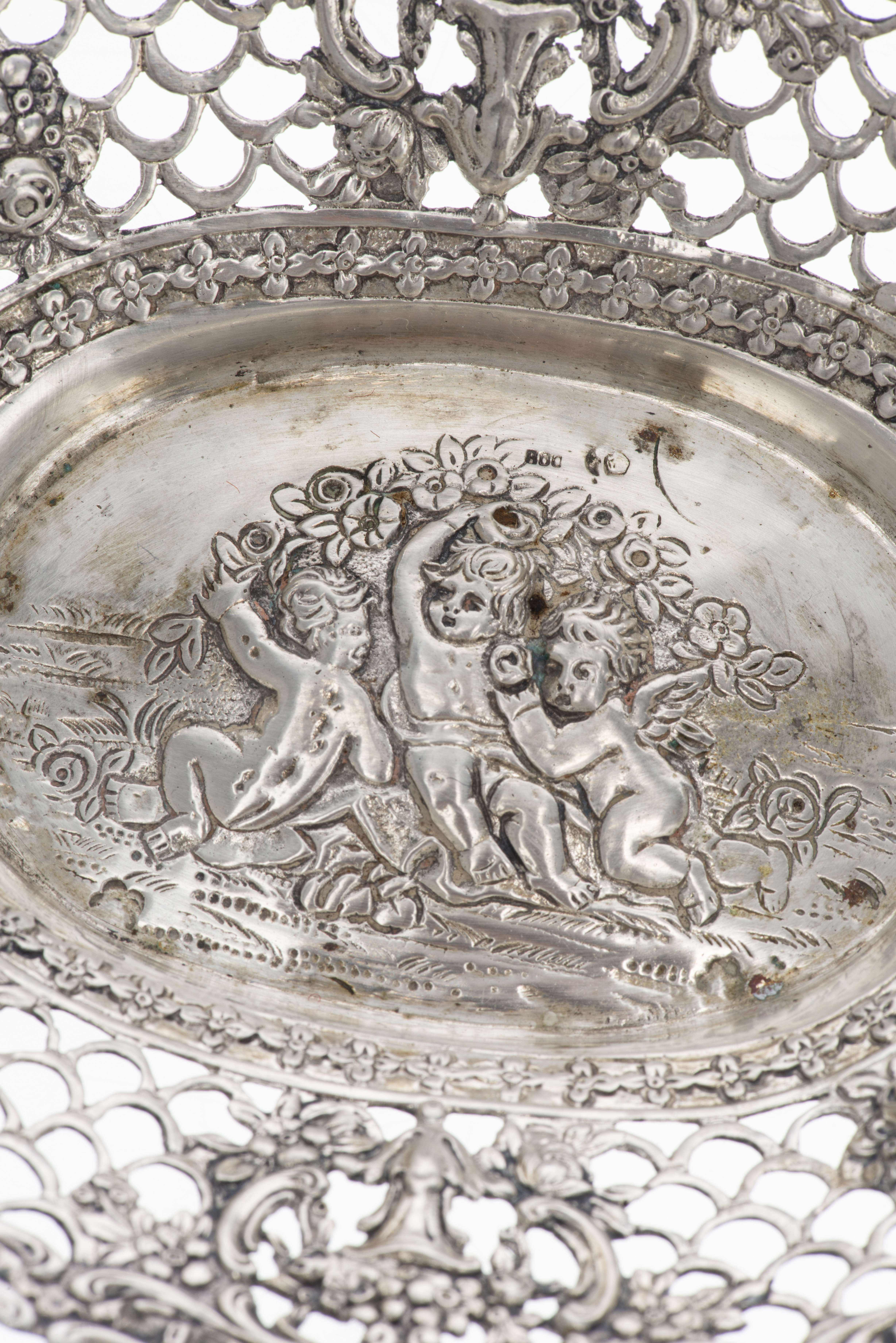 - un ovale en argent .800 allemand, bordure ajourée à décor de vases fleuris et médaillons, partie centrale à décor de putti. H. 2.5 x 13.8 x 11 cm