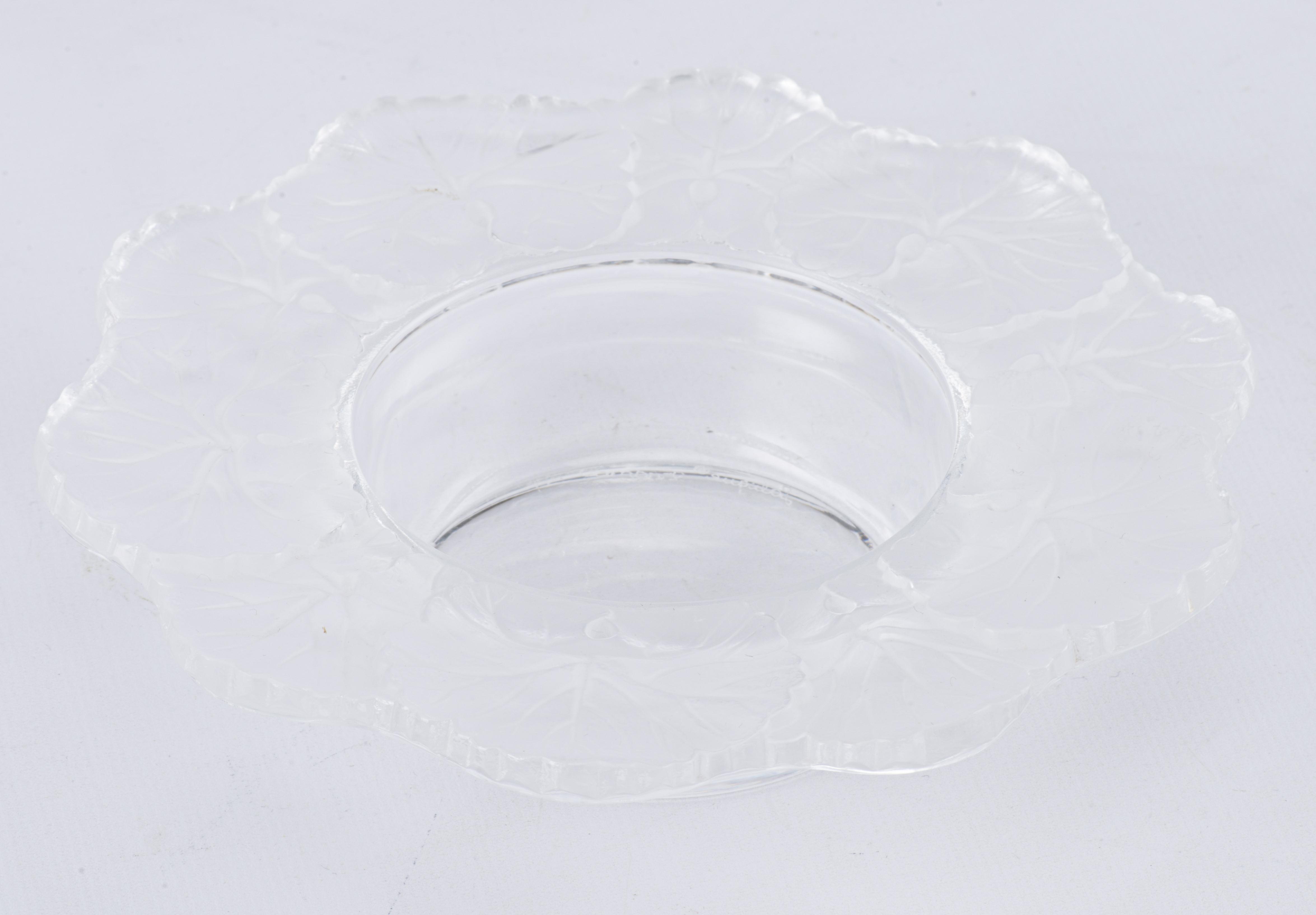 LALIQUE, coupe en cristal moulé partiellement satinée à décor de feuilles nervurées, modèle Honfleur, d'après un modèle de Marc Lalique (1900-1977) créé en 1949, signé au pointil Lalique ® France sous la base (depuis 1978).