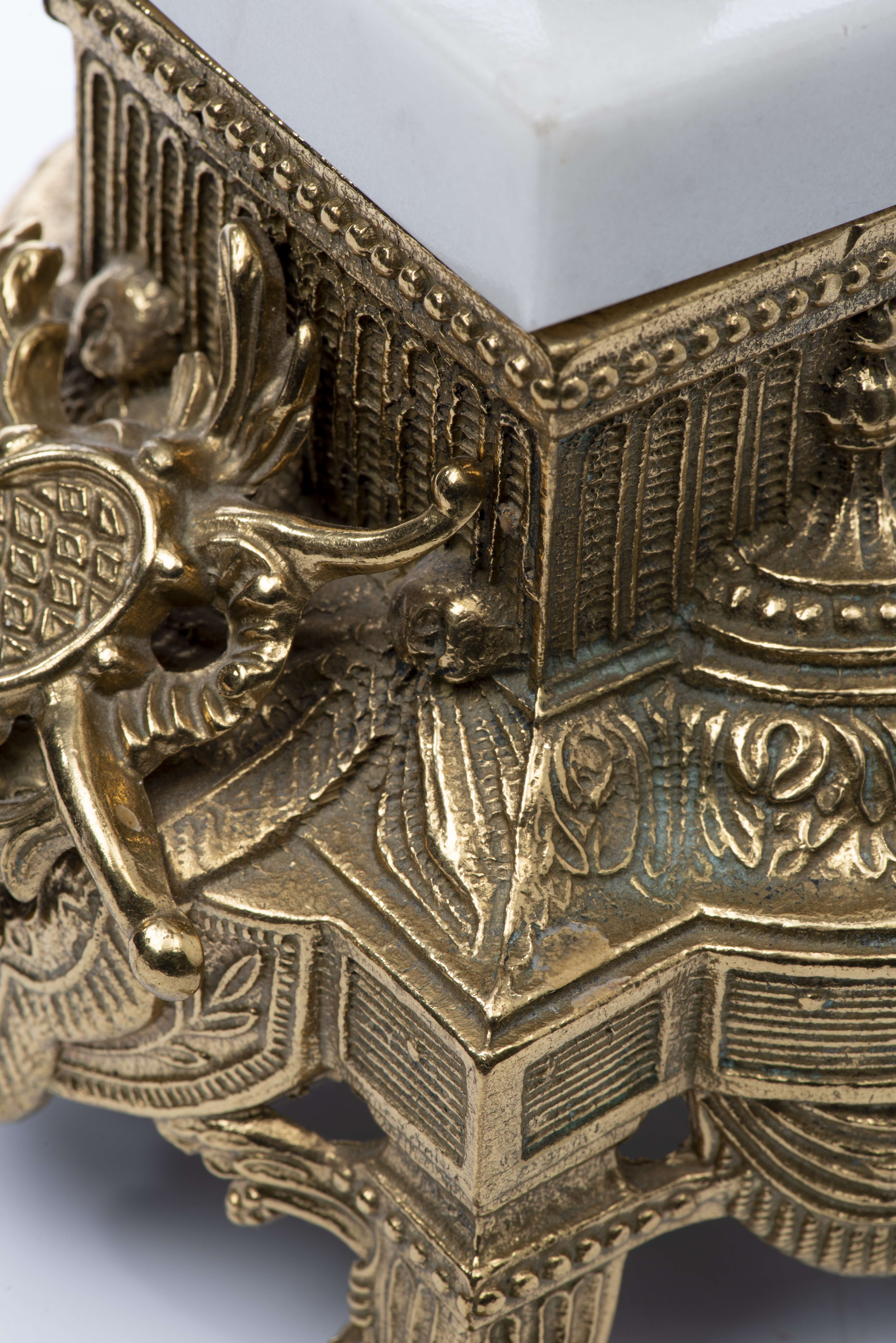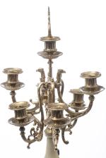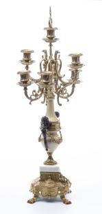 Travail fin XIXe, grand chandelier à 7 branches en bronze doré richement orné et ciselé. Fût en bakélite agrémenté de putti en bronze à patine médaille. Socle en marbre blanc et piètement quadripode.