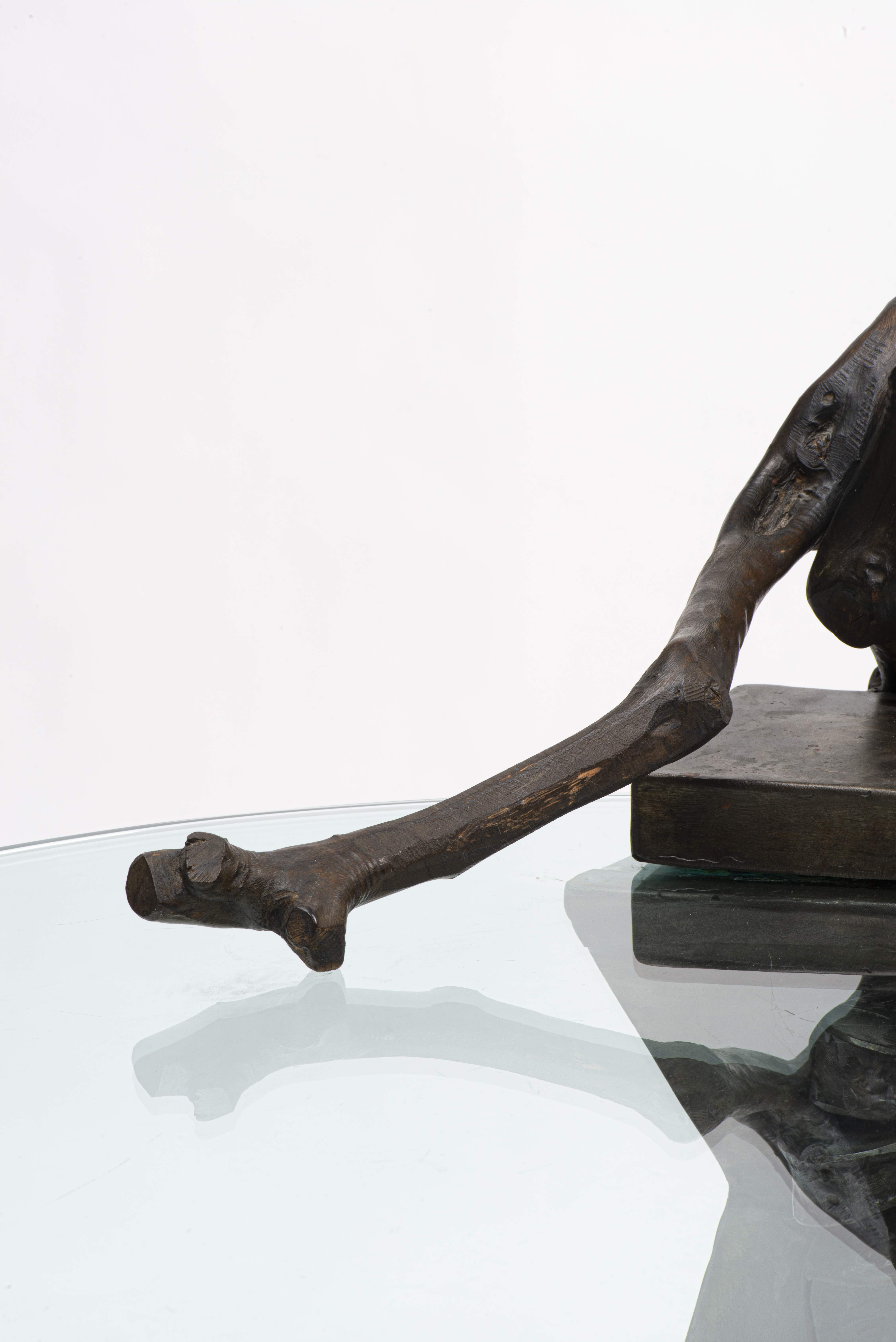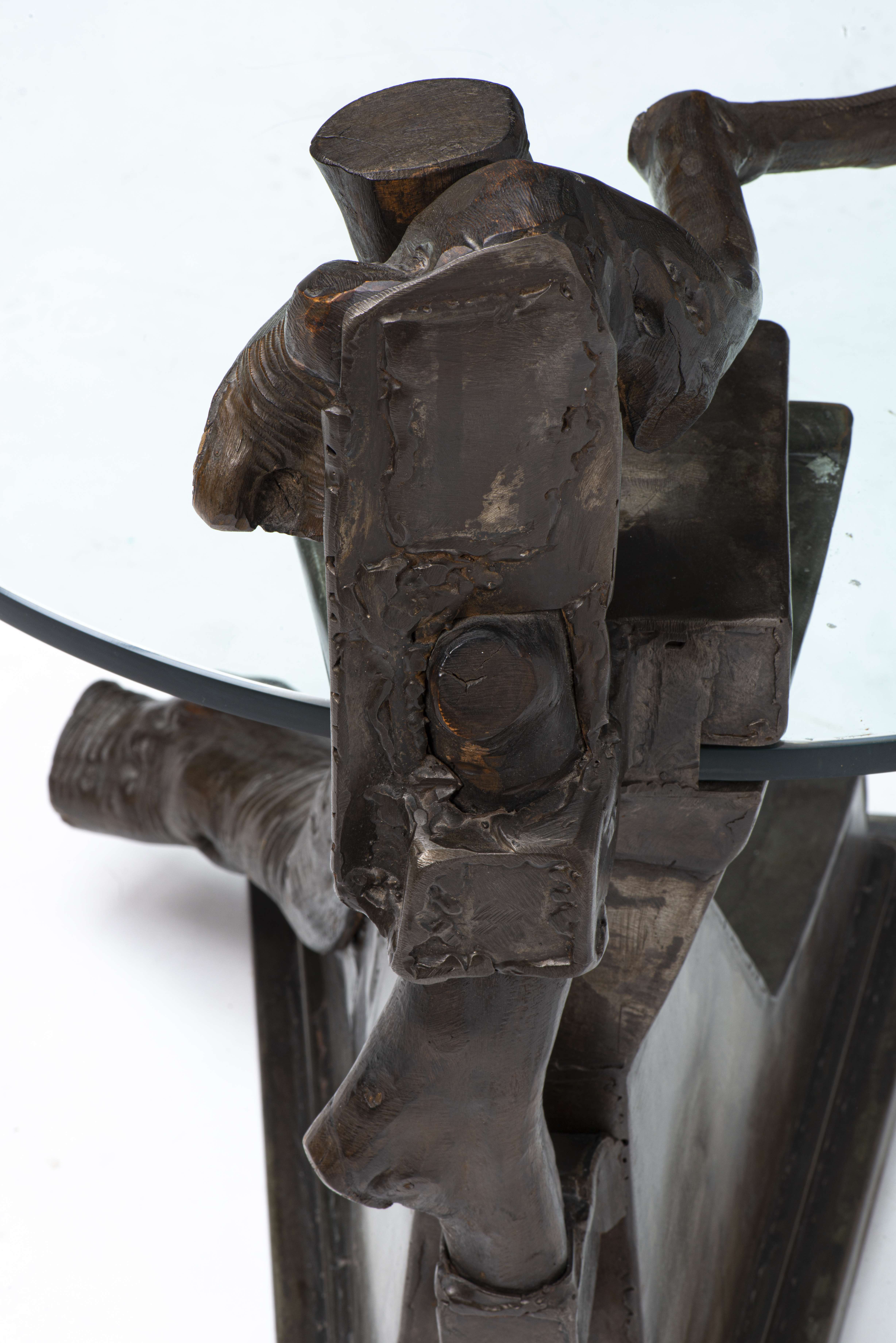 Jacques BASLER (1942) table de salon à plateau ovale en verre avec pied en bois et fer.