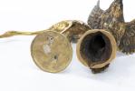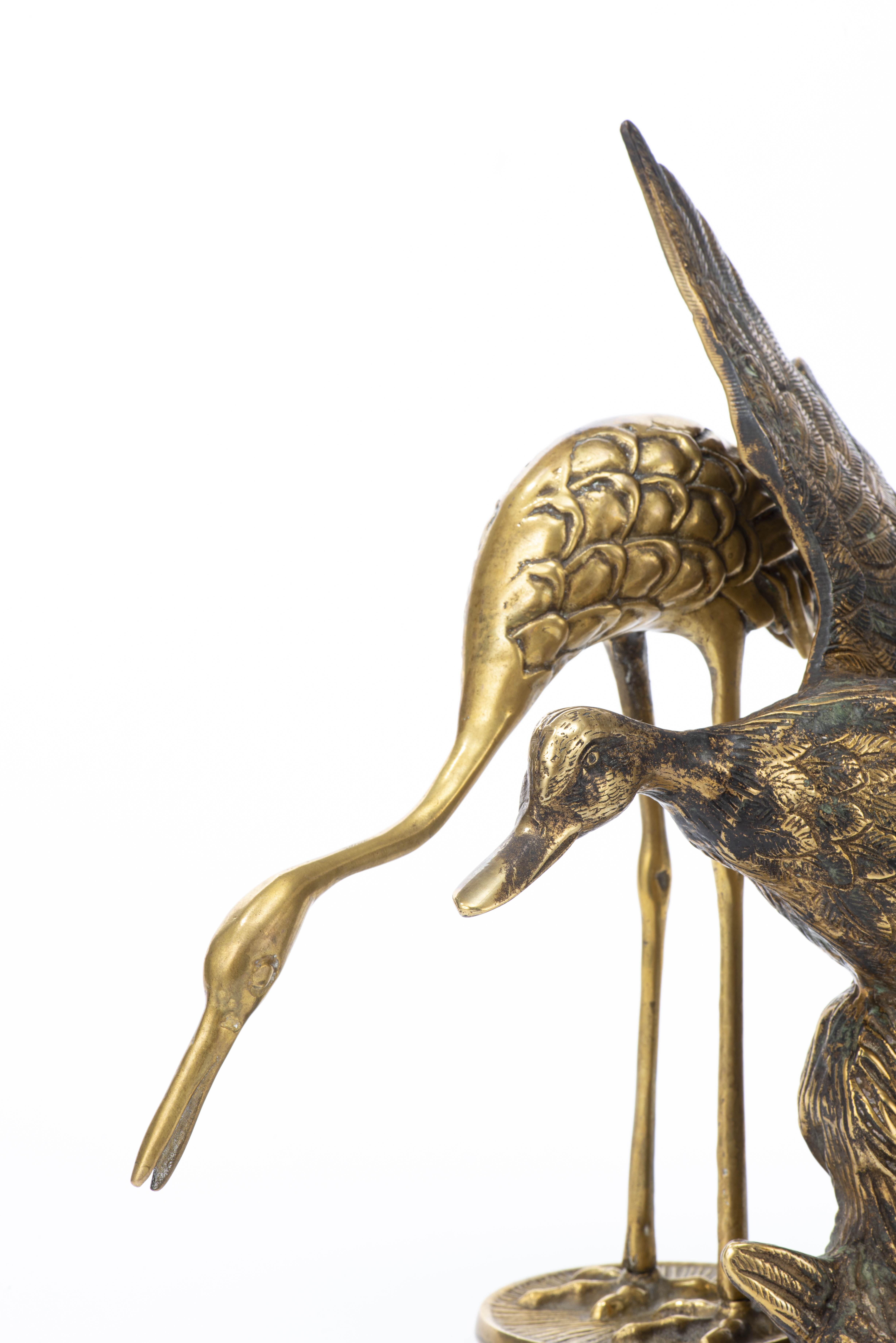 Deux sculptures en bronze représentant, pour l'une, un canard prenant son envol et, pour l'autre, un héron chassant à patine jaune.