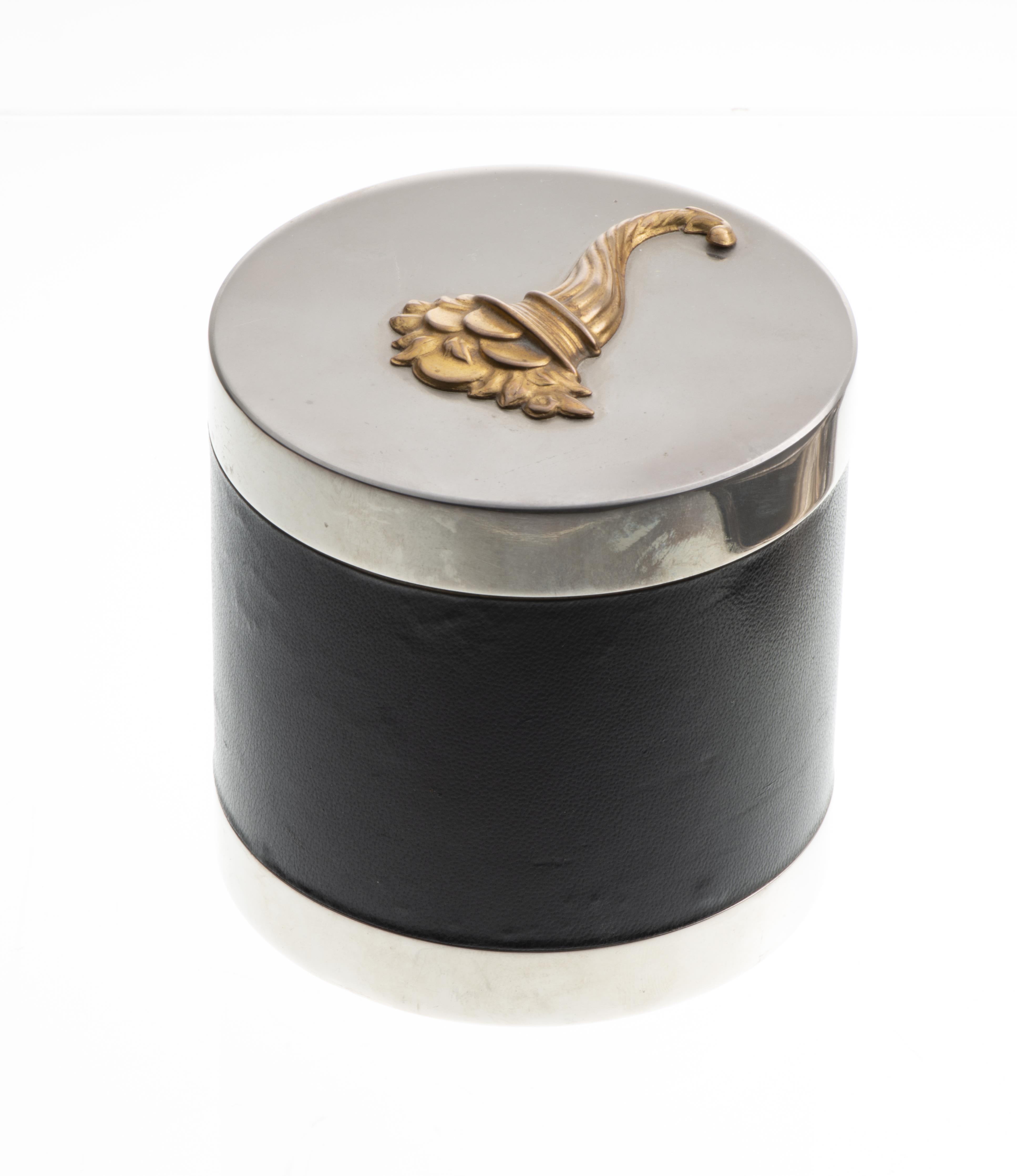 Lot composé d'une boîte HERMES en métal argenté et cuir, décor d'une corne d'abondance en métal doré et de deux plats en métal argenté, l'un rond et l'autre ovale.