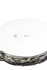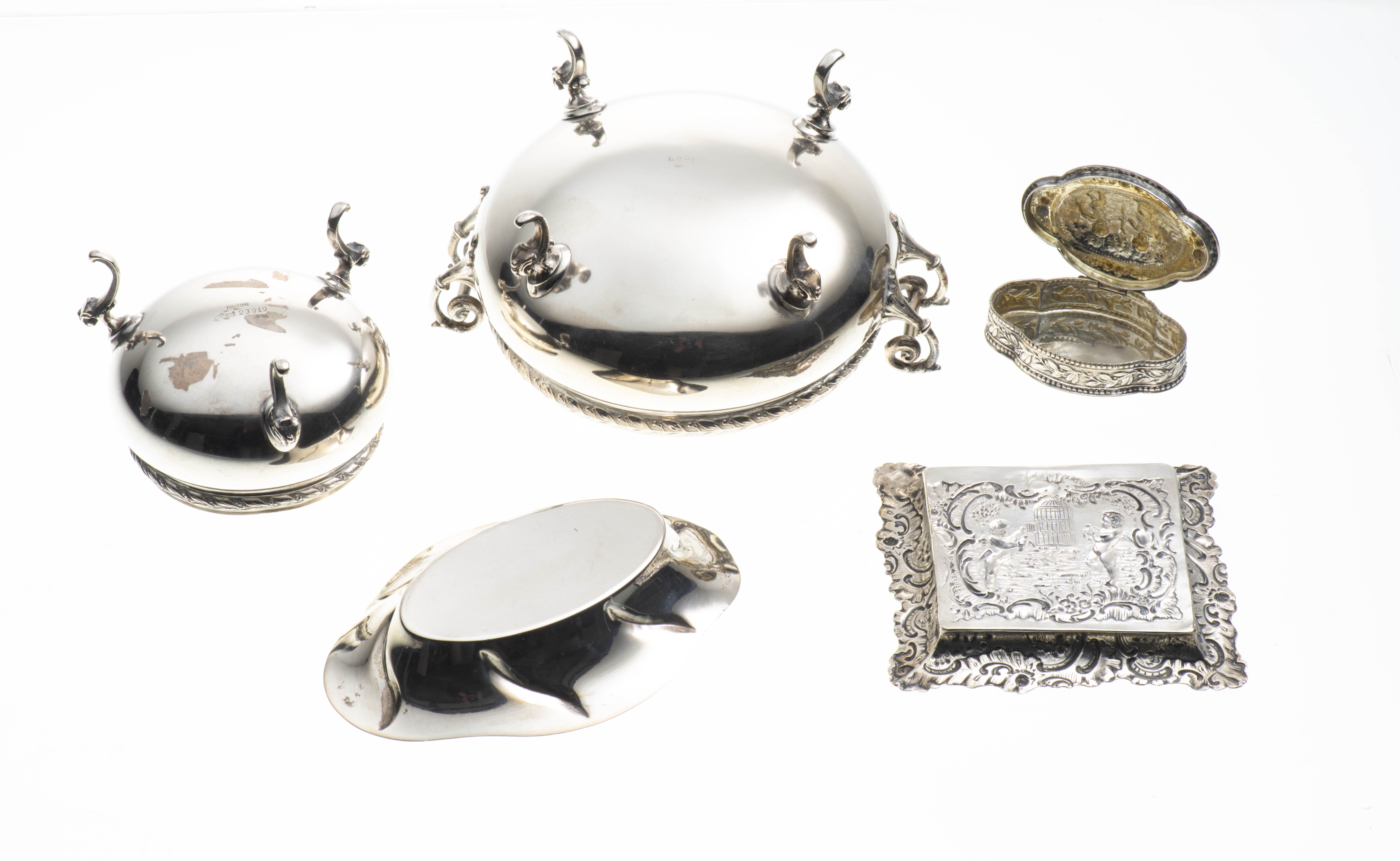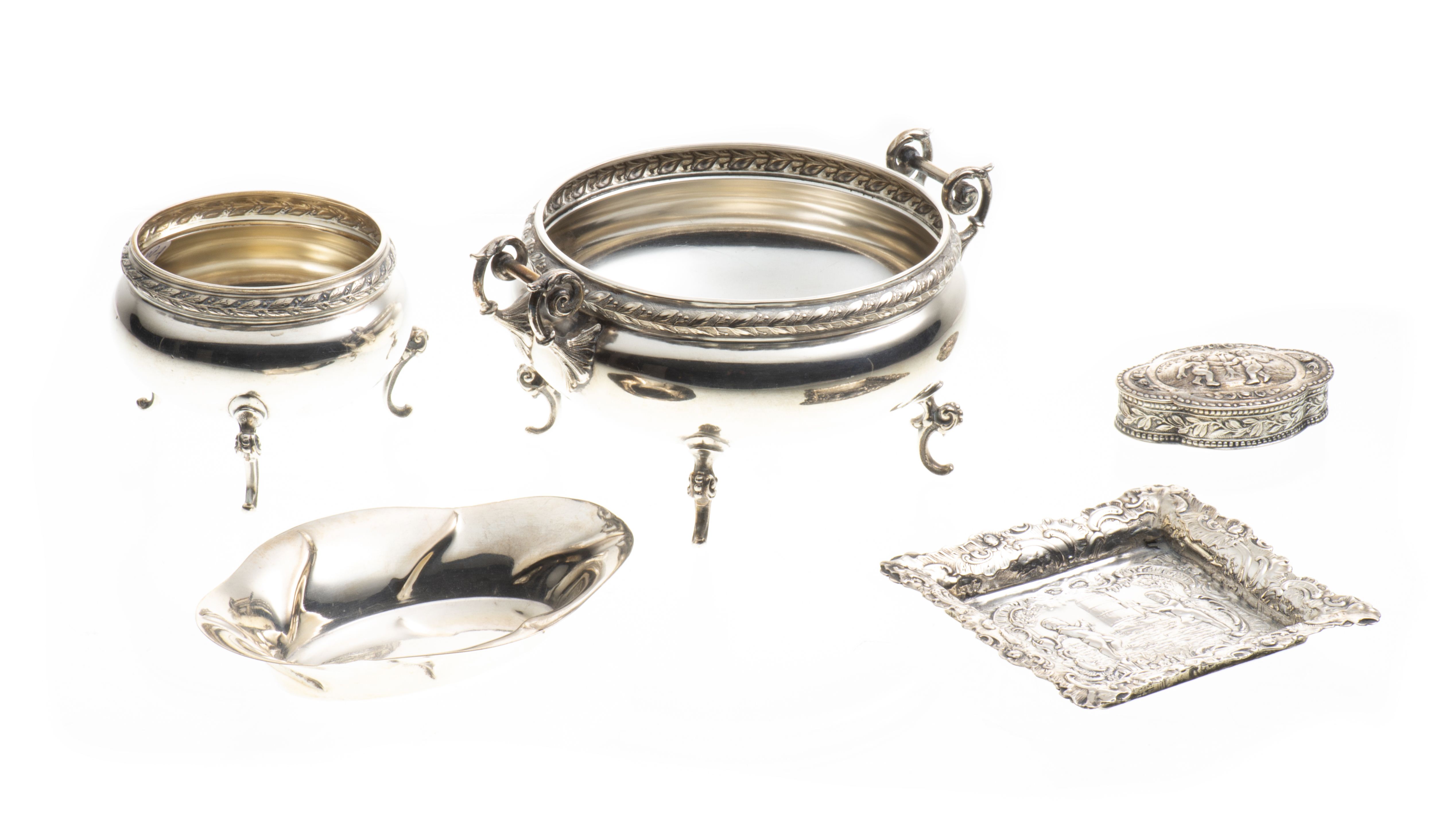 - deux petits vide-poches, dont un mini vide-poche en forme de losange à marli et lèvre mouvementés en argent .800 allemand, et un petit vide-poche carré en argent repoussé .800 de deux angelots mettant en cage un oiseau 8.4x8.7 cm