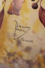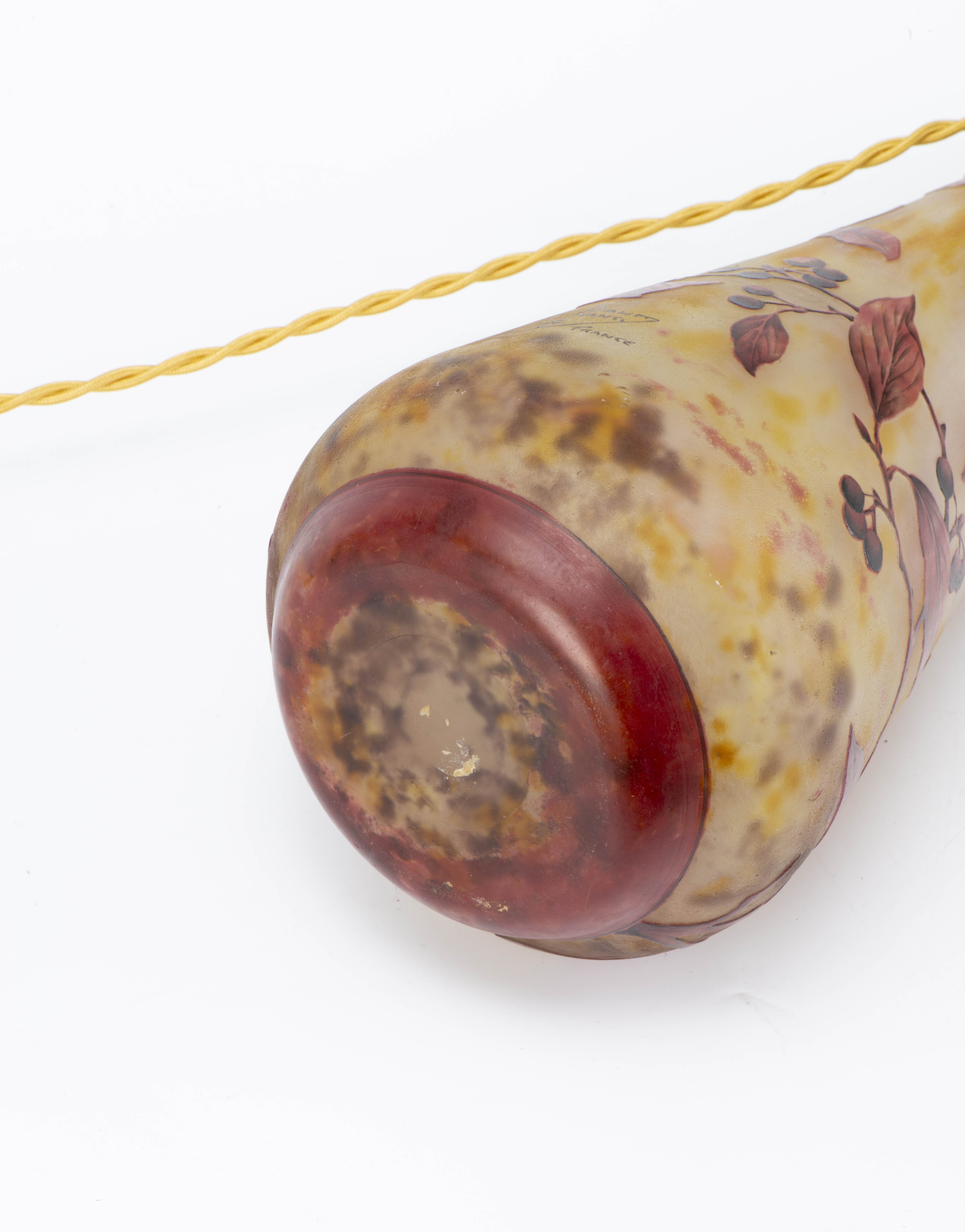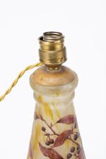 DAUM Nancy, Pied de lampe en verre gravé émaillé en verre double de forme balustre et col polylobé . Décor polychrome gravé et émaillé de feuilles et de branches chargées de baies, sur un fond givré à l'acide et jaspé de poudres intercalaires jaune-brun.