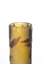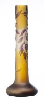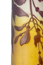 Émile GALLÉ (1846-1904), vase tubulaire en verre épais de couleur jaune et blanc givré à décor gravé à l'acide de feuilles et de fleurs de glycine violet mauve. Signé "Gallé" sur la panse.