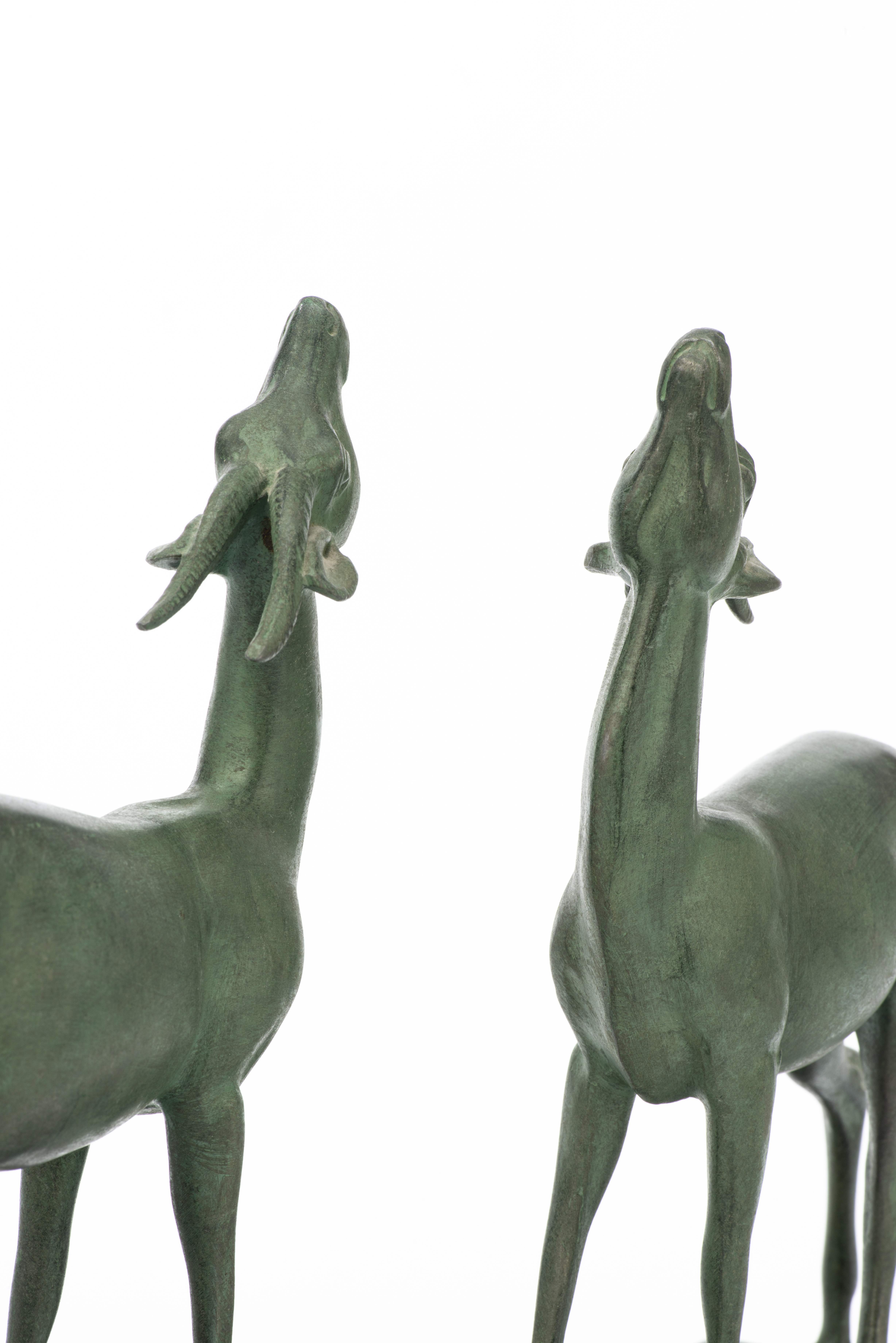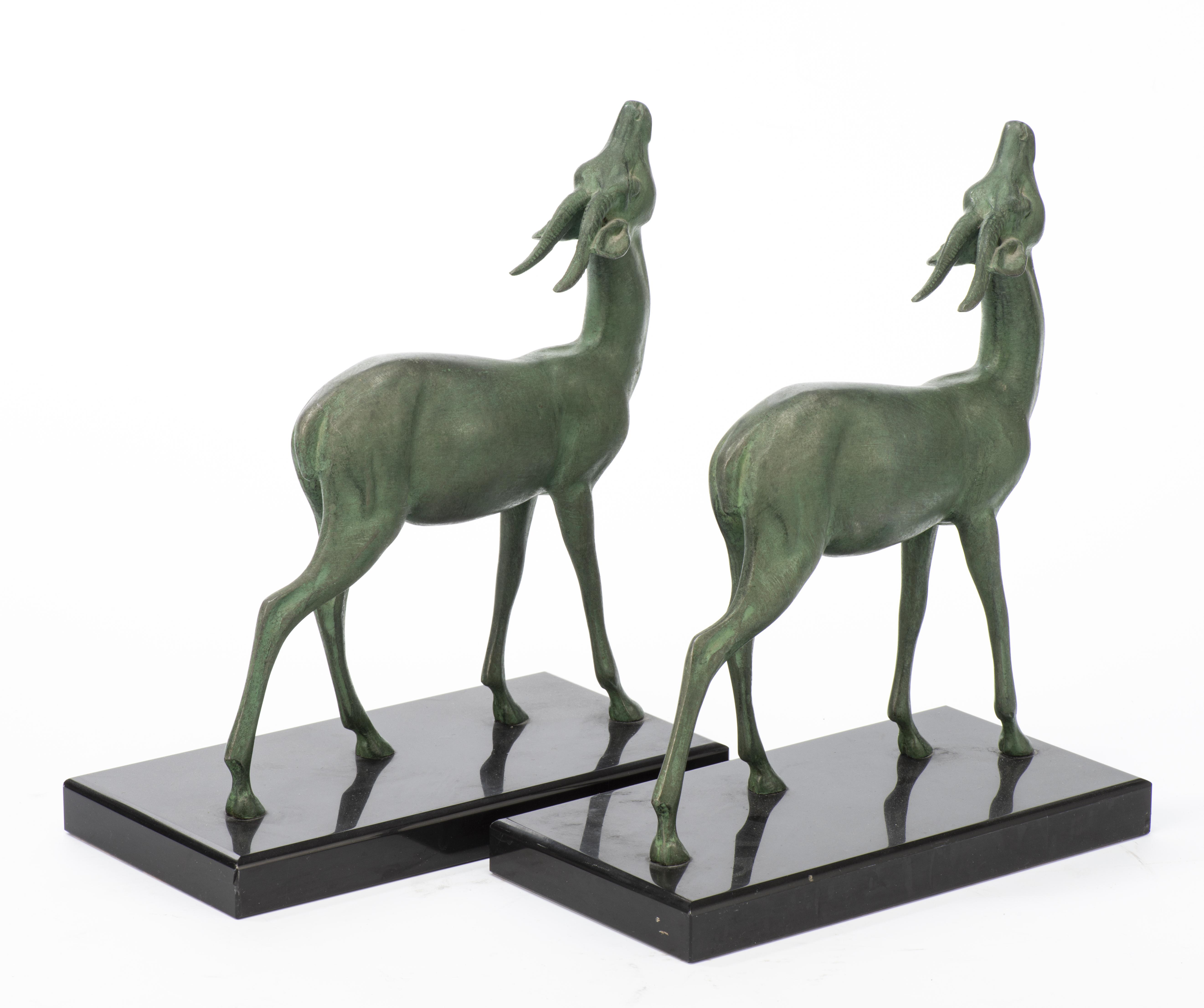 Paire d'antilopes en bronze à patine verte sur socle en marbre noir faisant office de serre-livres.