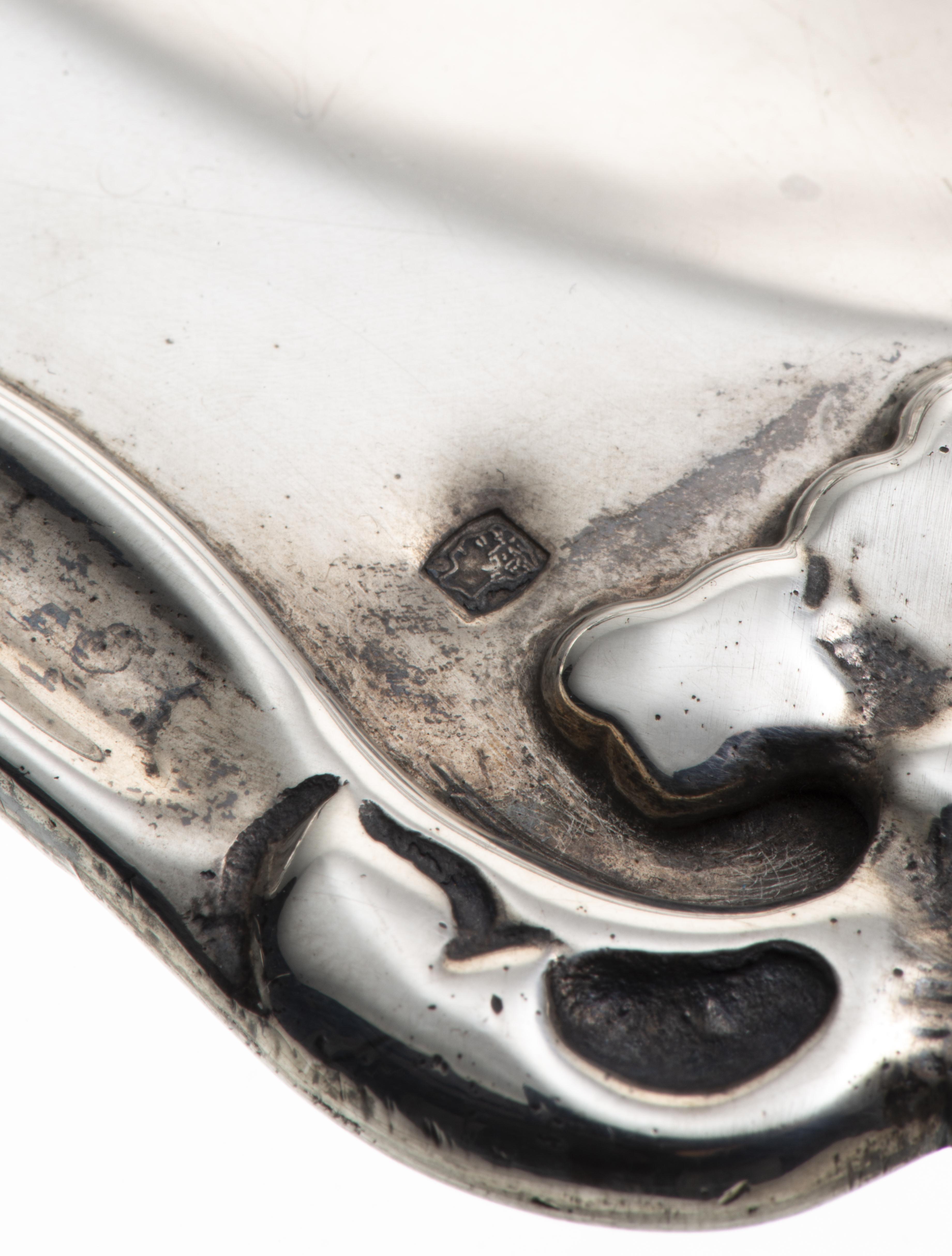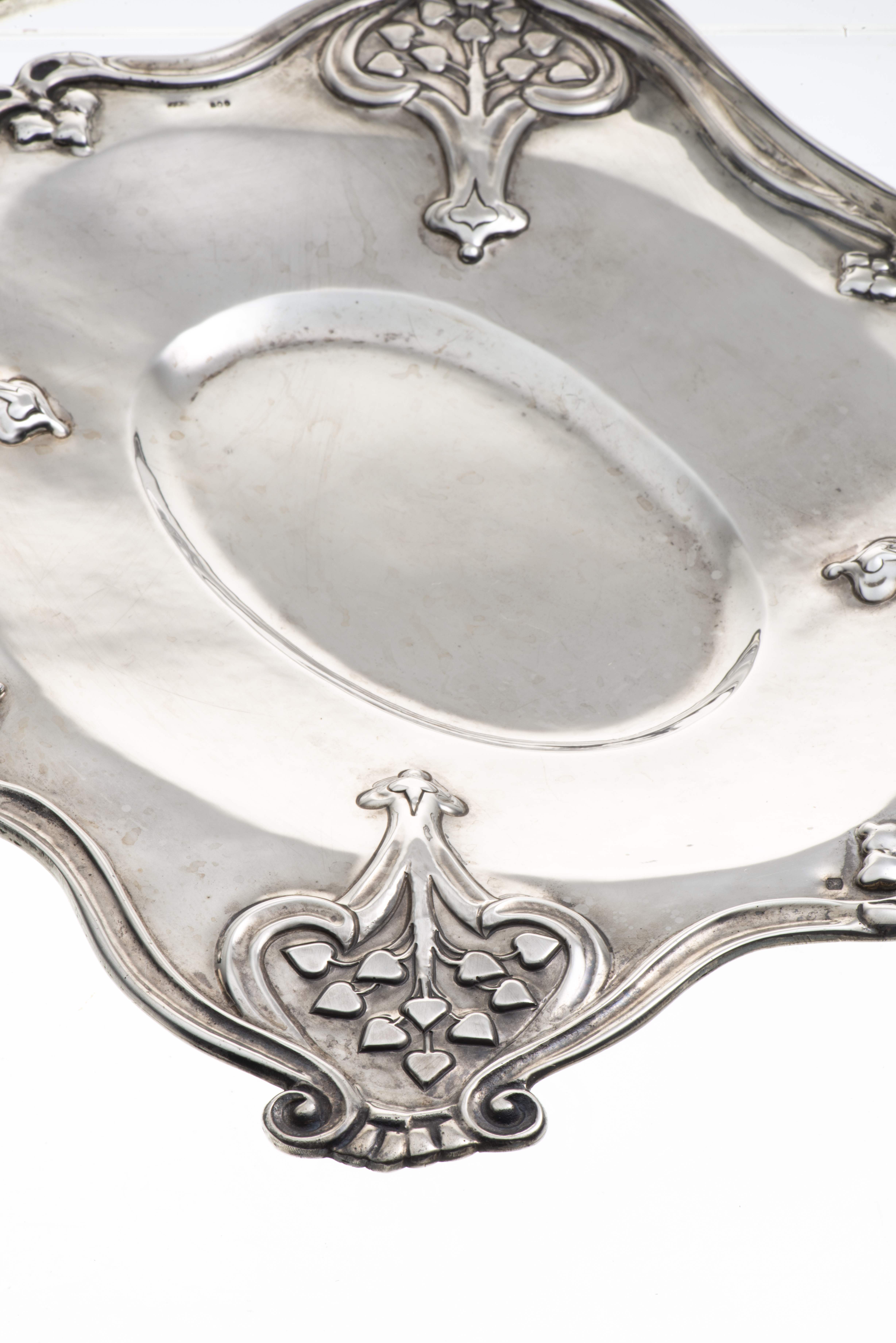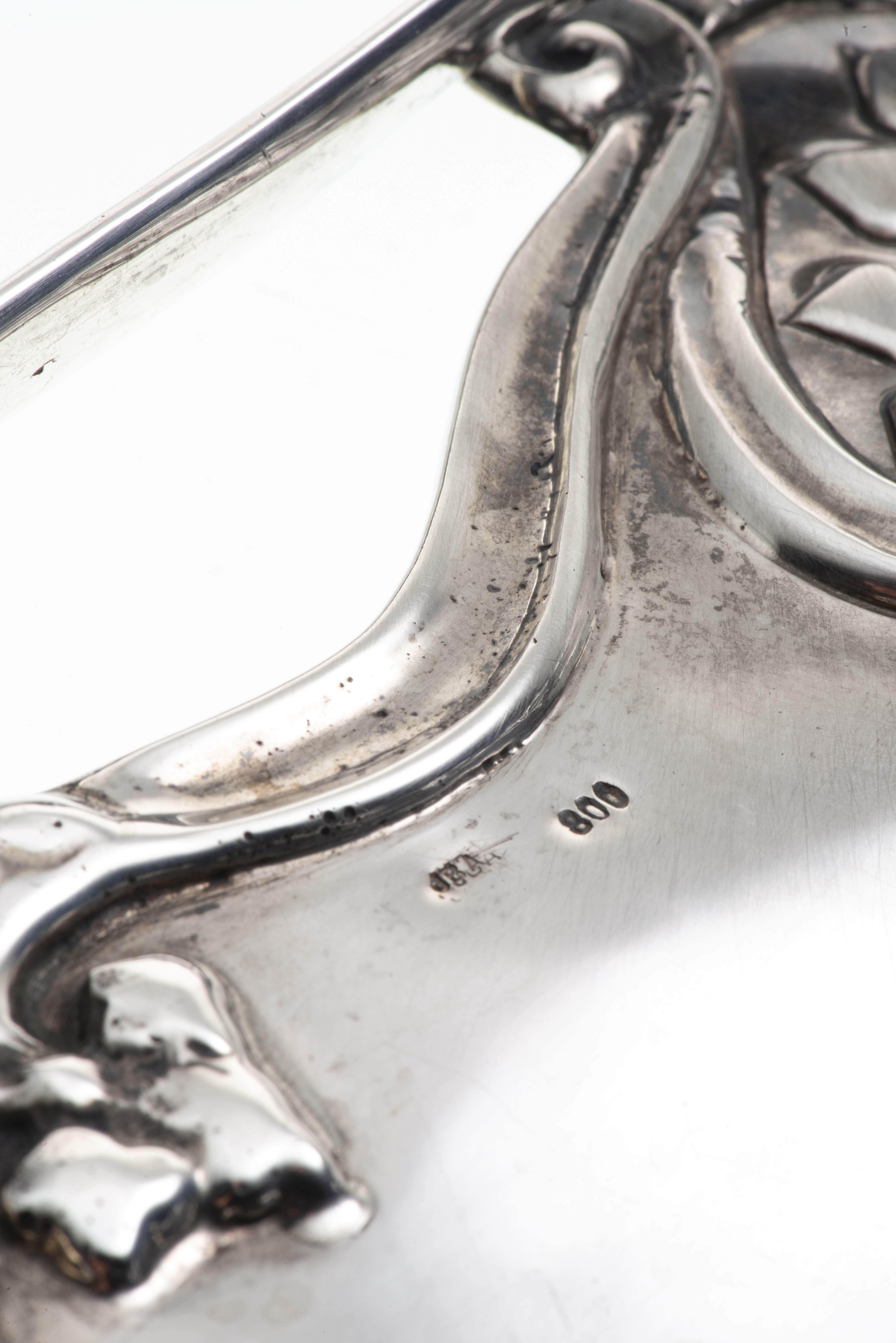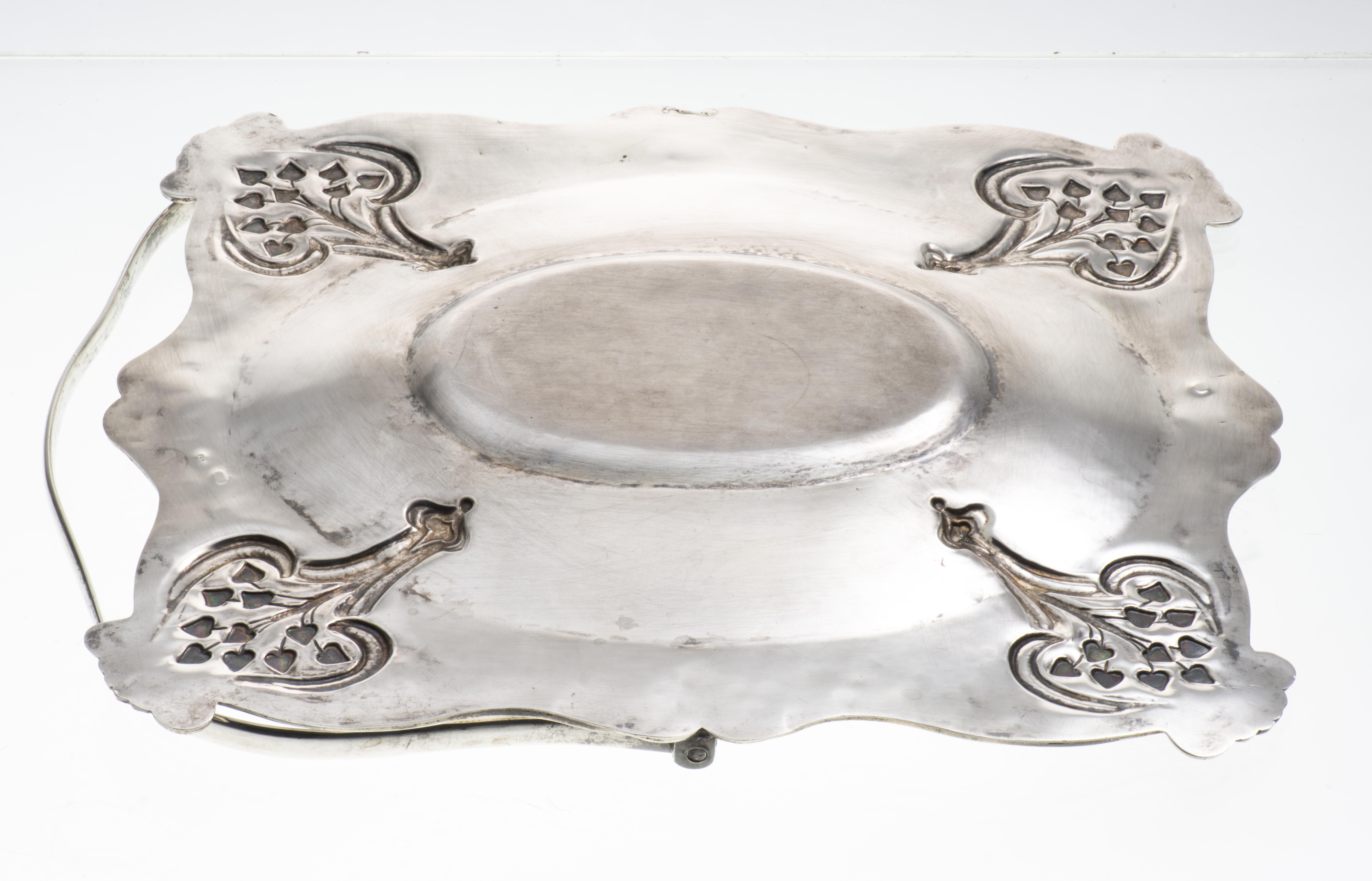 Travail Art nouveau, Plateau en argent d'Italie, en argent .800 à décor végétal aux quatre coins, avec anse panier.