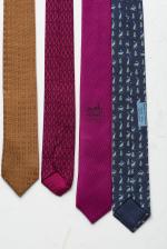 HERMÈS, lot de quatre cravates en soie dans les tons tons de pourpre, bleu et camel.