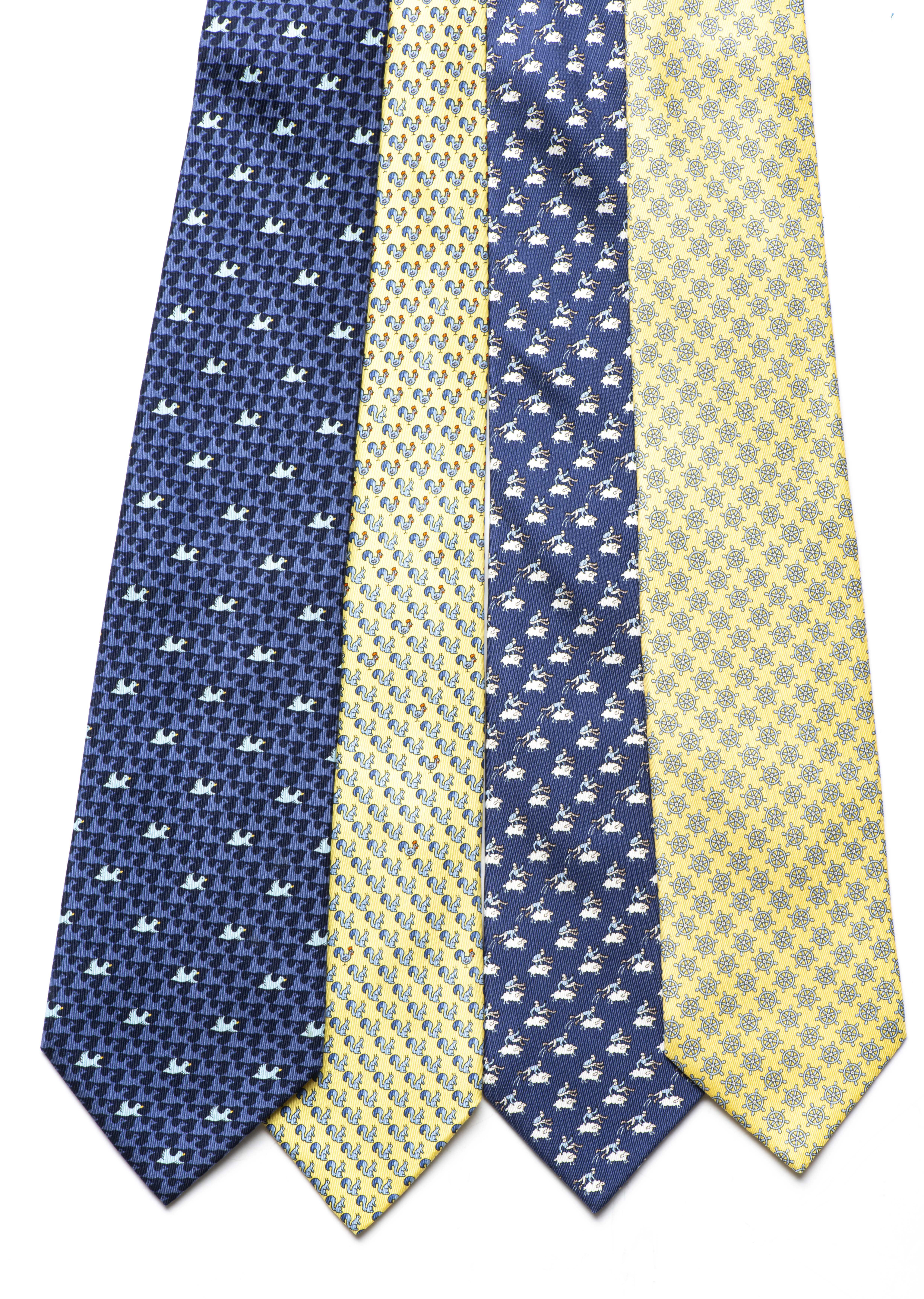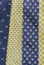 HERMÈS, lot de quatre cravates en soie à motif dans les tons de jaune et bleu.