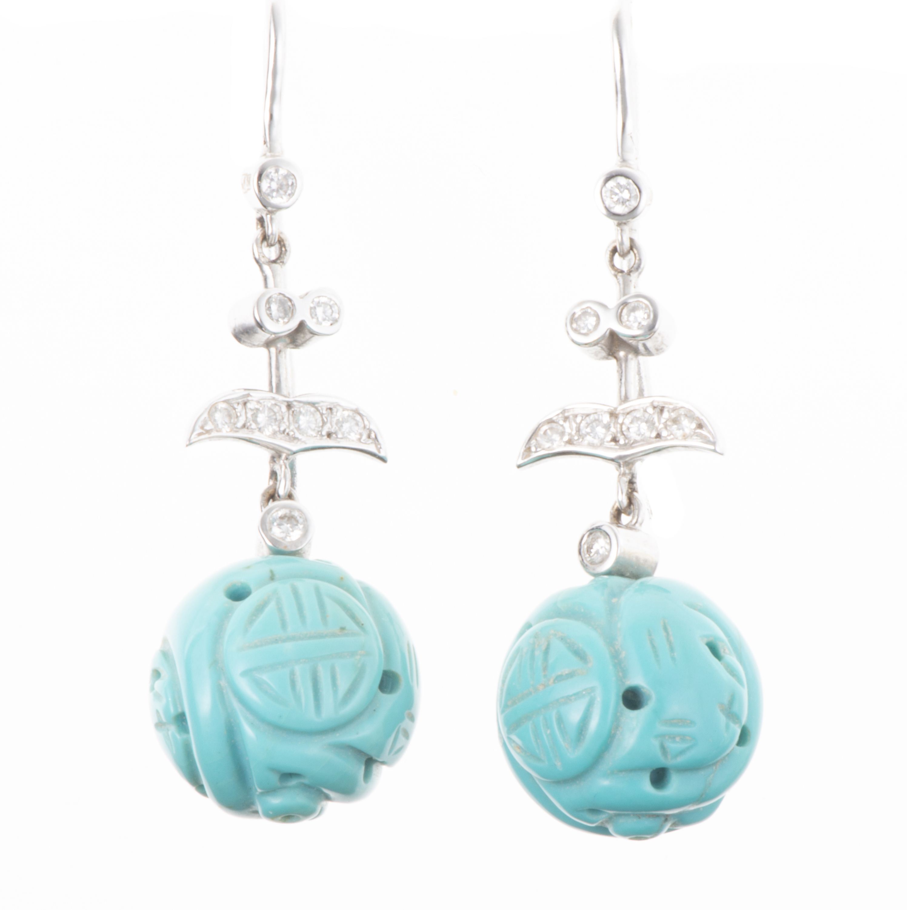 Paire de pendants d'oreilles en or gris .750 avec boules de turquoise et diamants.