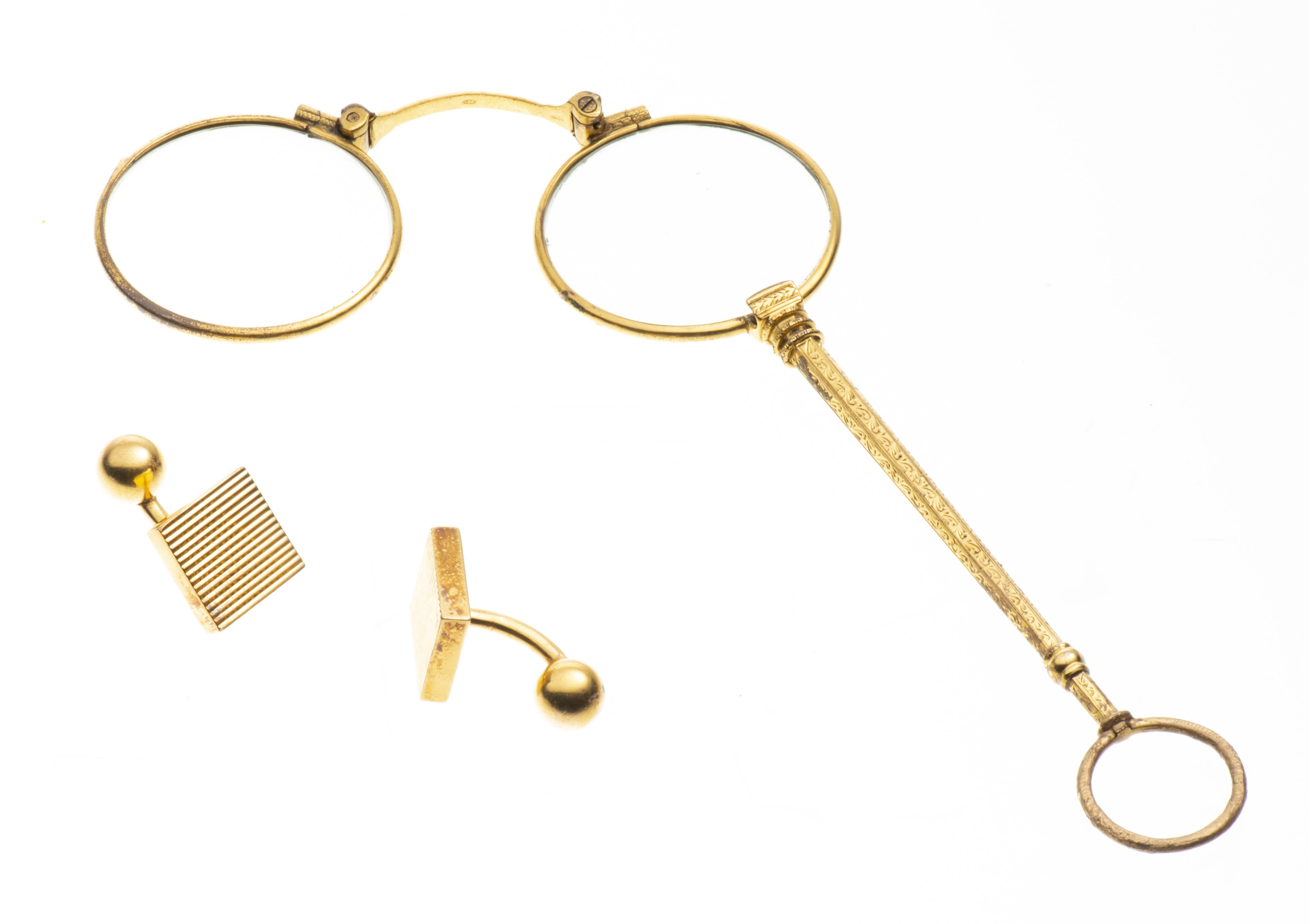 Face-à-main optique et paire de boutons de manchette en métal doré