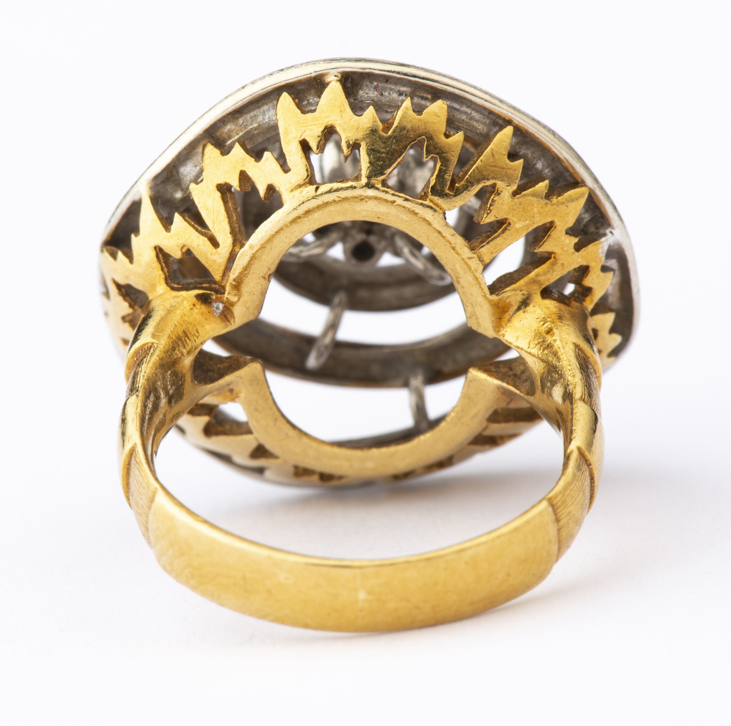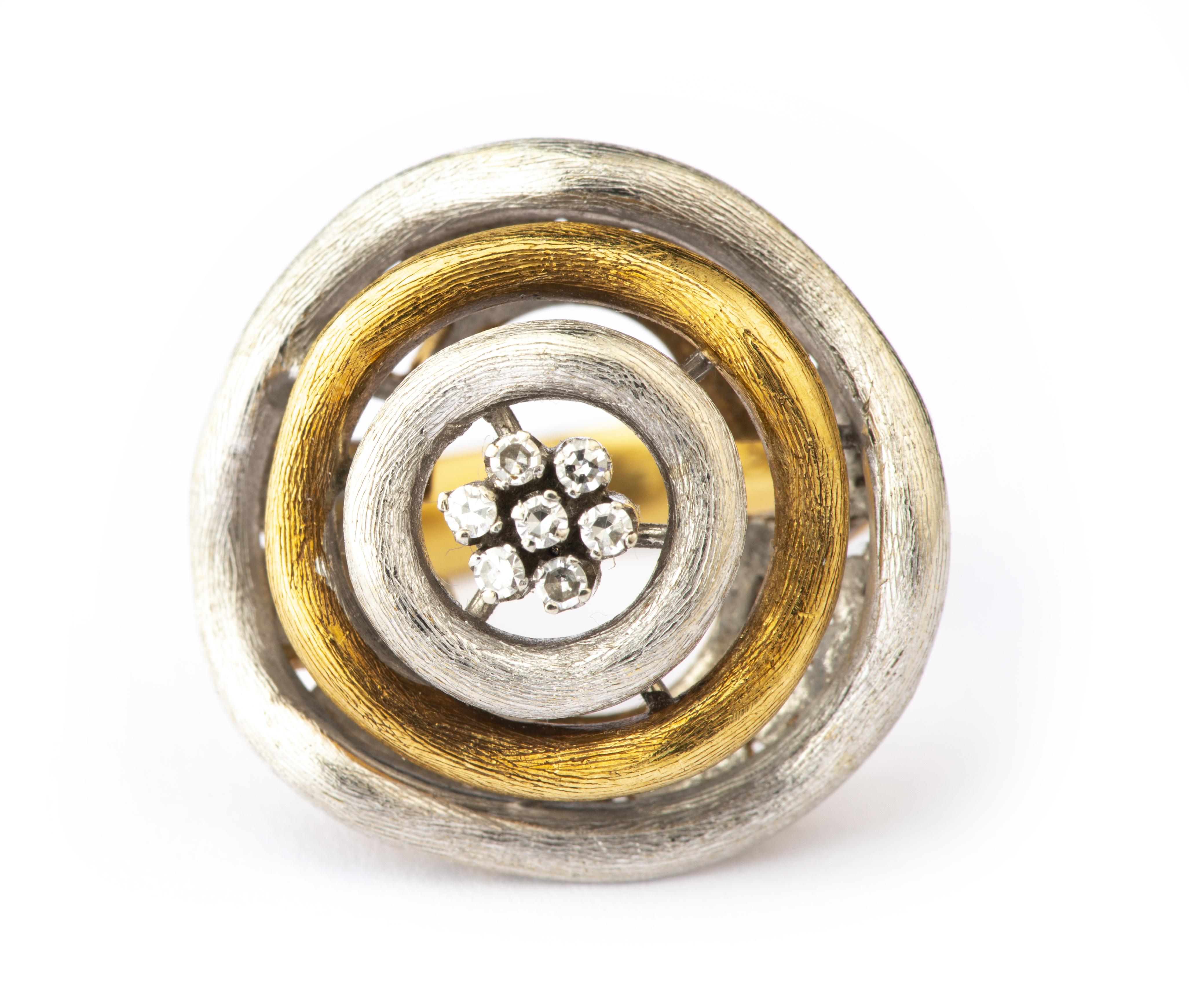 Bague en or jaune et or gris .750 à trois anneaux encerclant 7 diamants 8/8 pour un total de 0.07 ct.