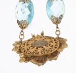 Miriam HASKELL (1899-1981), Collier vintage année 50 en verre facetté bleu et strass. Pendant à structure en métal doré sertie de strass "diamant" et bleu. Signé du cartouche au verso du pendant.