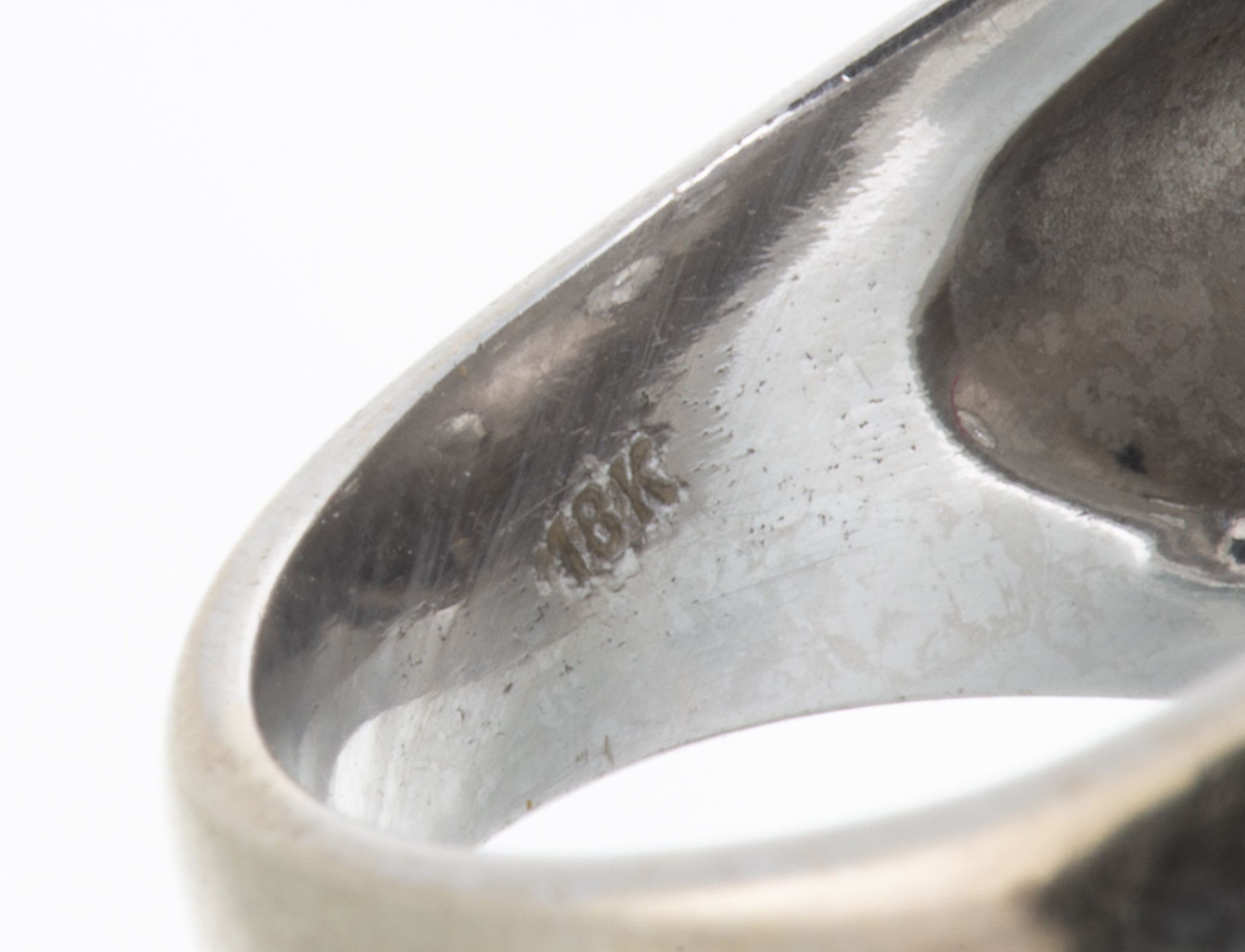 7 diamants de taille brillant d'un diamètre en env. 4.0- 3.3 mm, d'un poids total estimé à env 1.20 ct qualité blanc VS-P1 serti clos à niveau et 1 pierre noire (éventuellement spinelle?) de env. 2 mm, sertie à niveau.