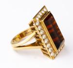 Bague en or jaune .750 sertie en son centre d'une citrine madère de taille émeraude sertie close de 7 cts et entourée de 26 diamants de 3 pts chacun pour un total de 0.78 ct.