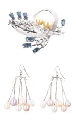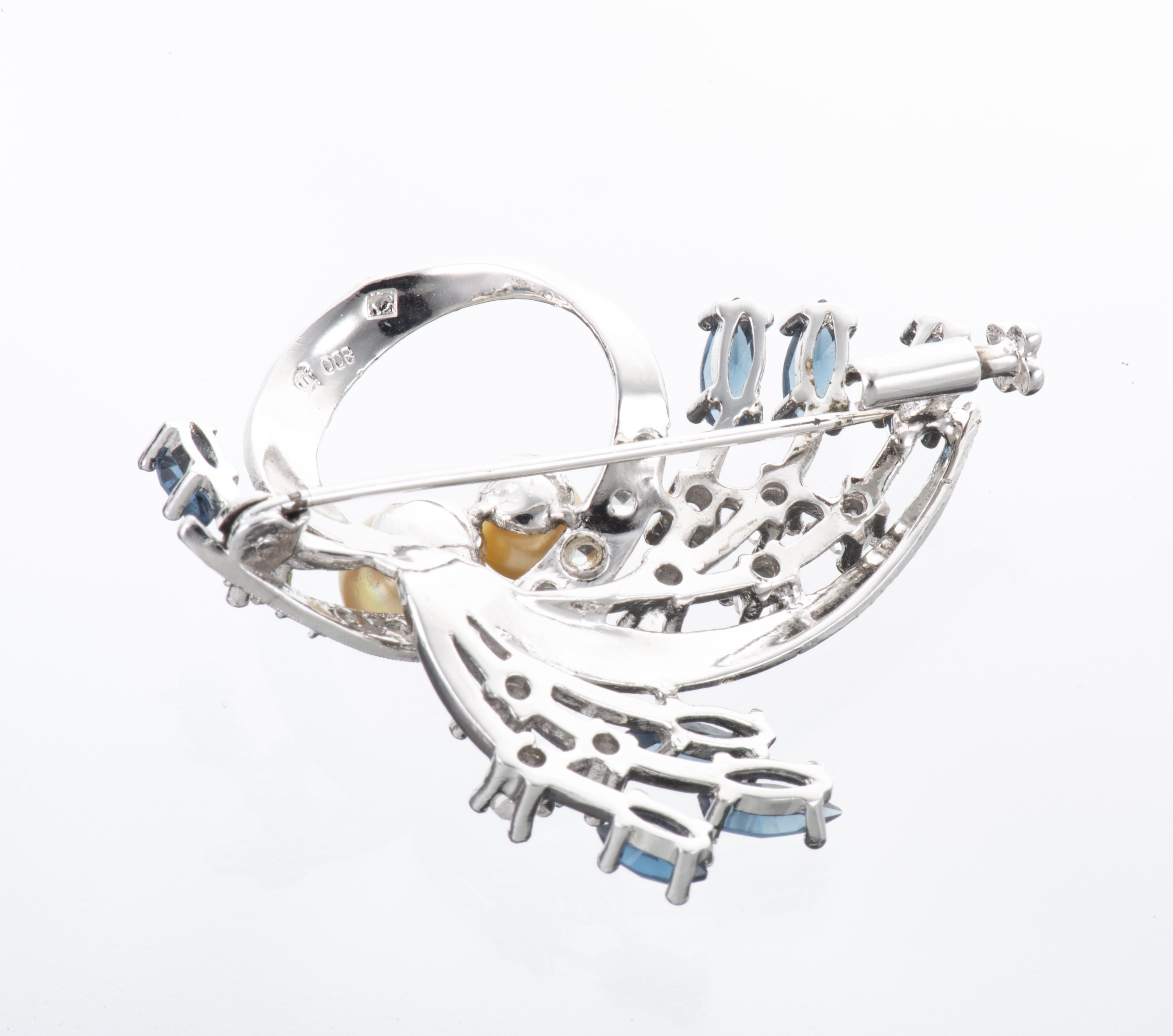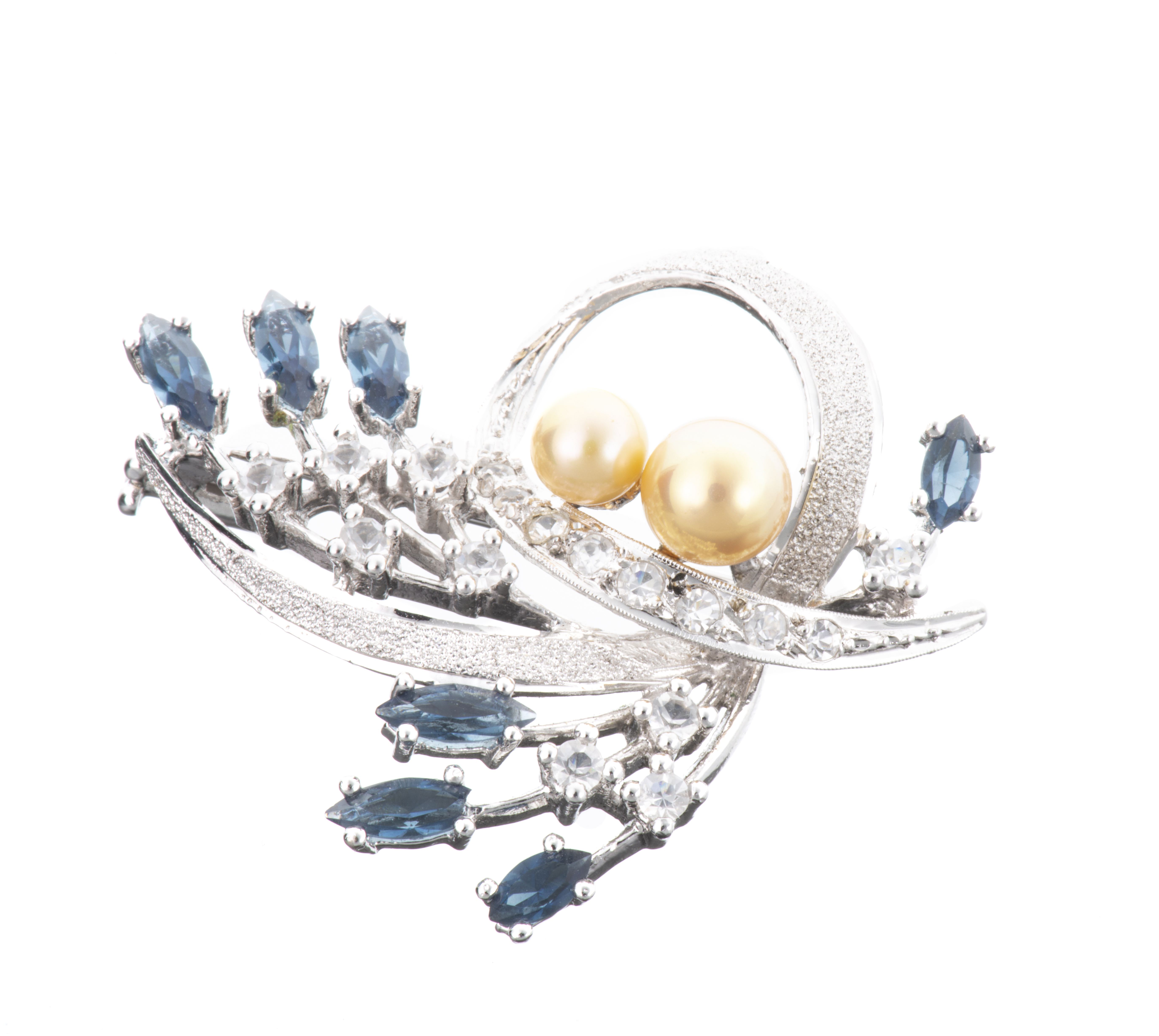 On y joint une broche en argent avec des saphirs blancs et bleus et 2 perles d'imitation.