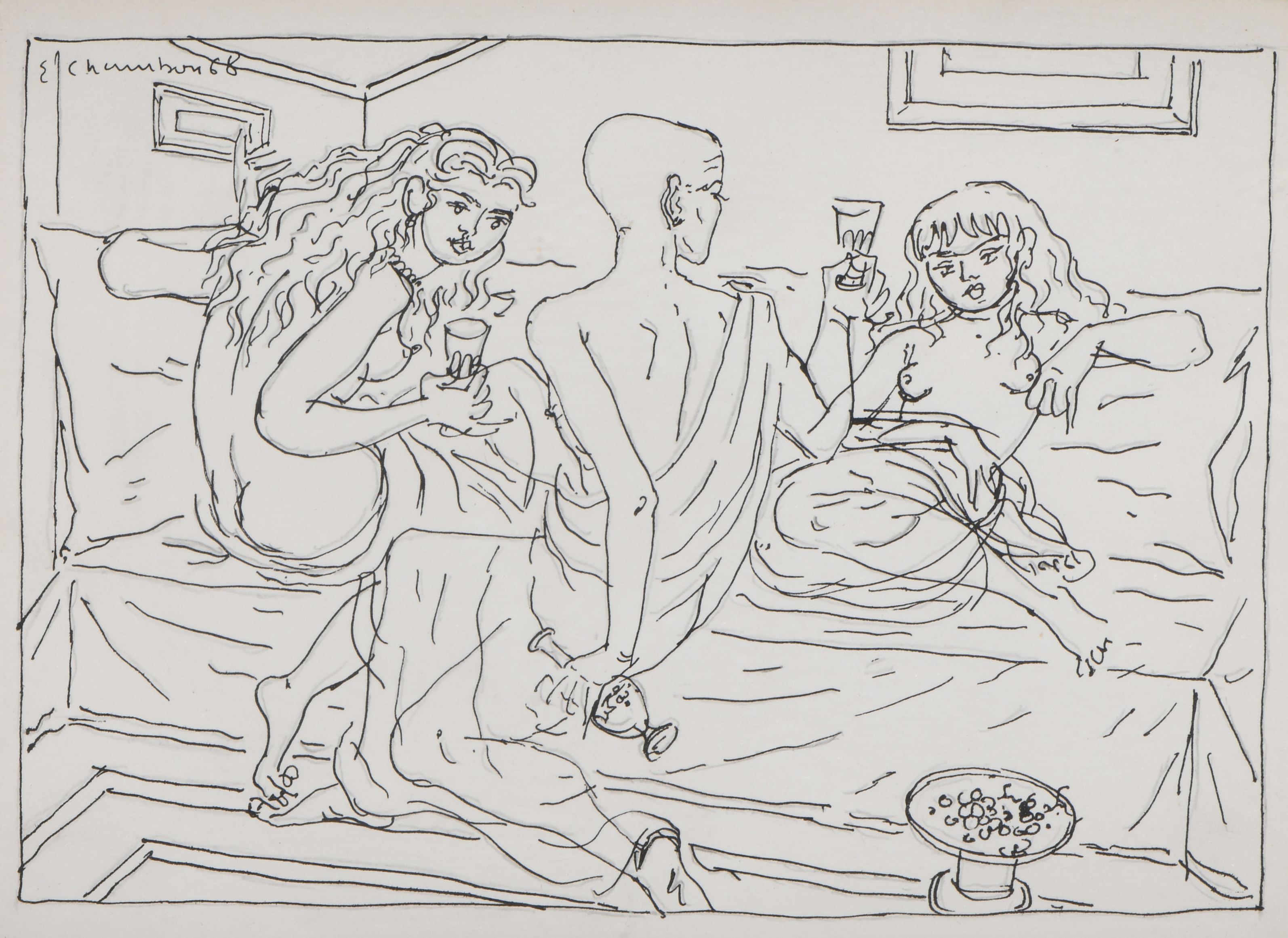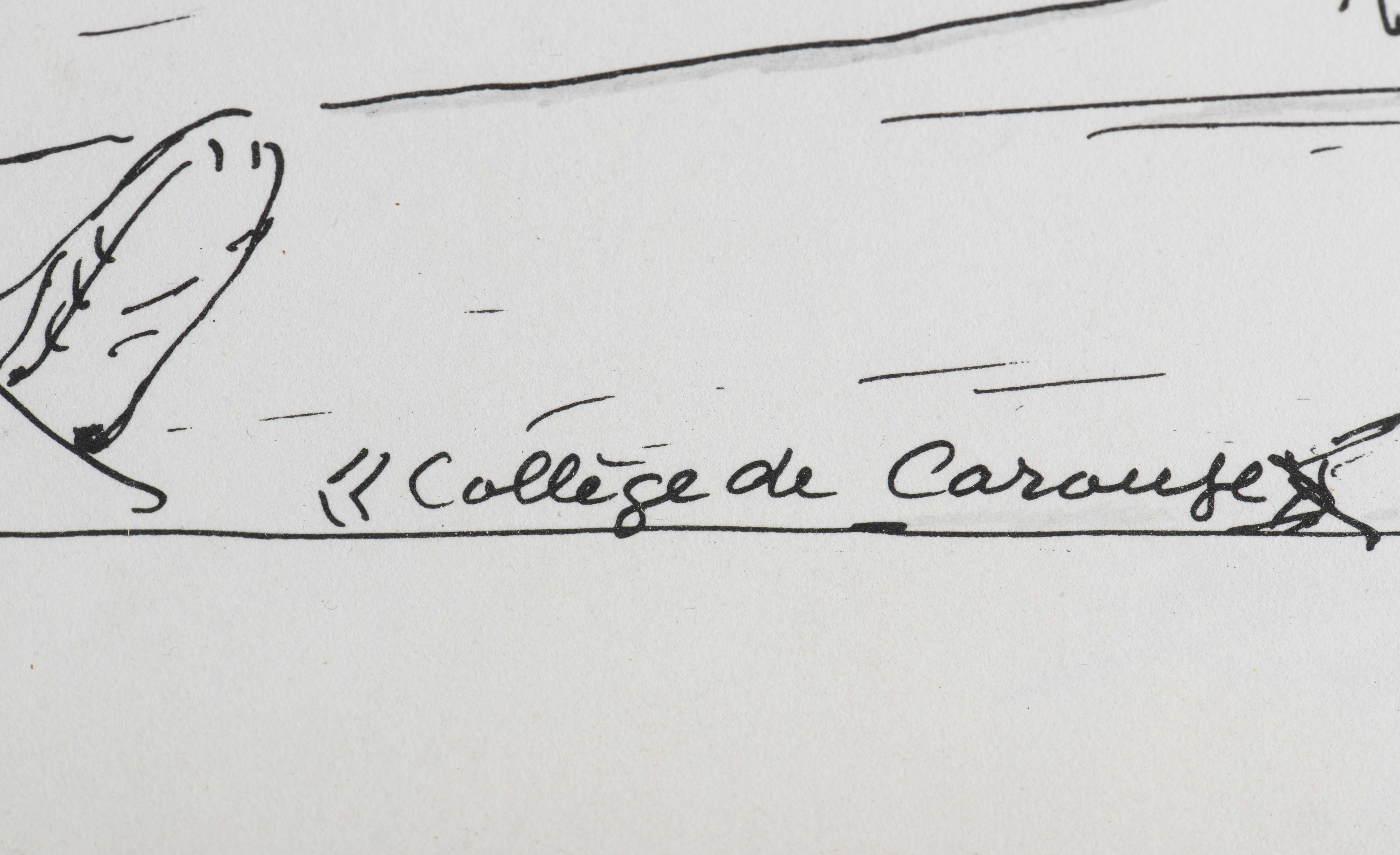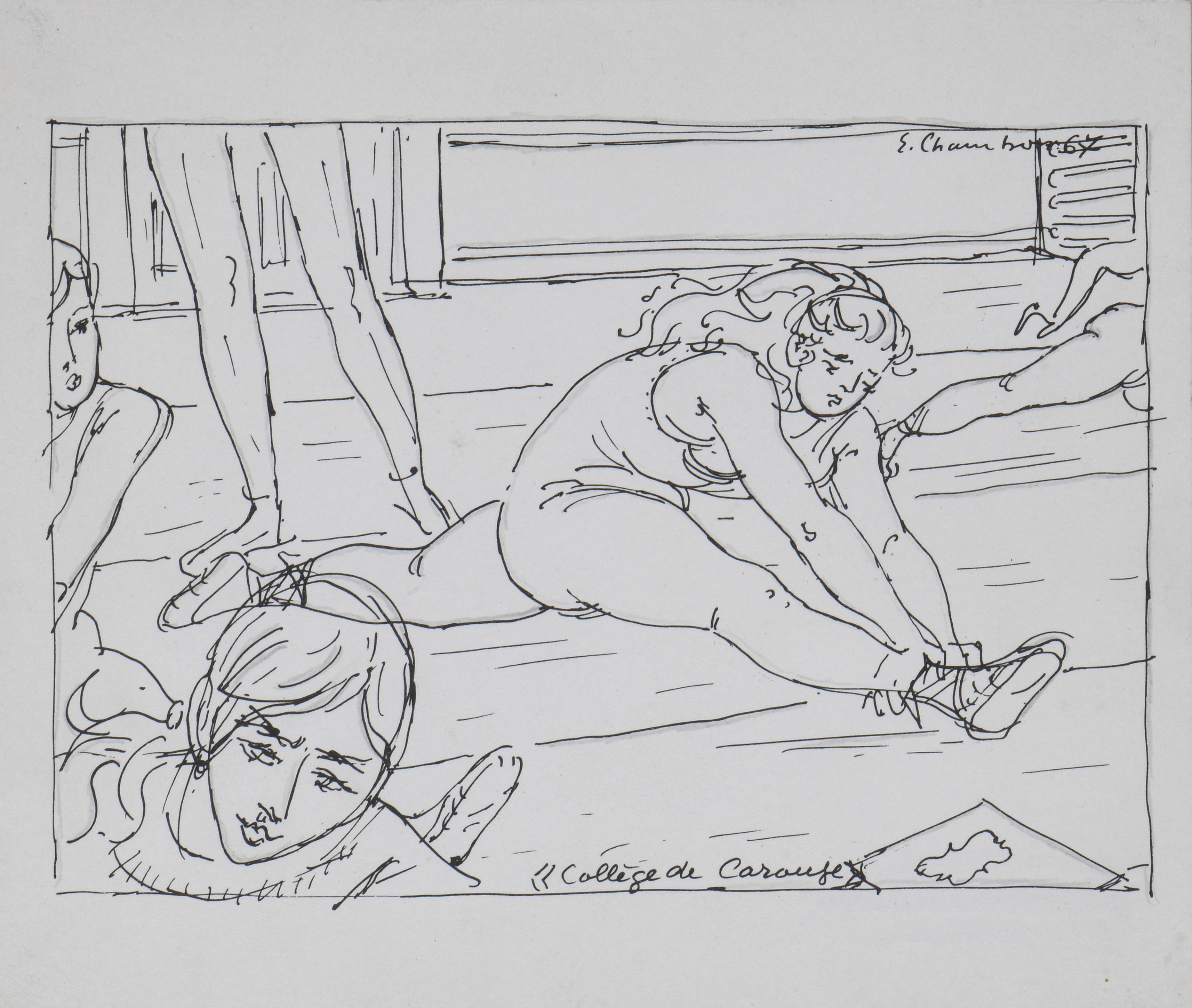 Emile François CHAMBON (1905-1993), "La leçon de gym au collège de Carouge" & "Toge party", plume sur papier, signé en haut à gauche et daté 1967 & signé en haut à droite et daté 1968