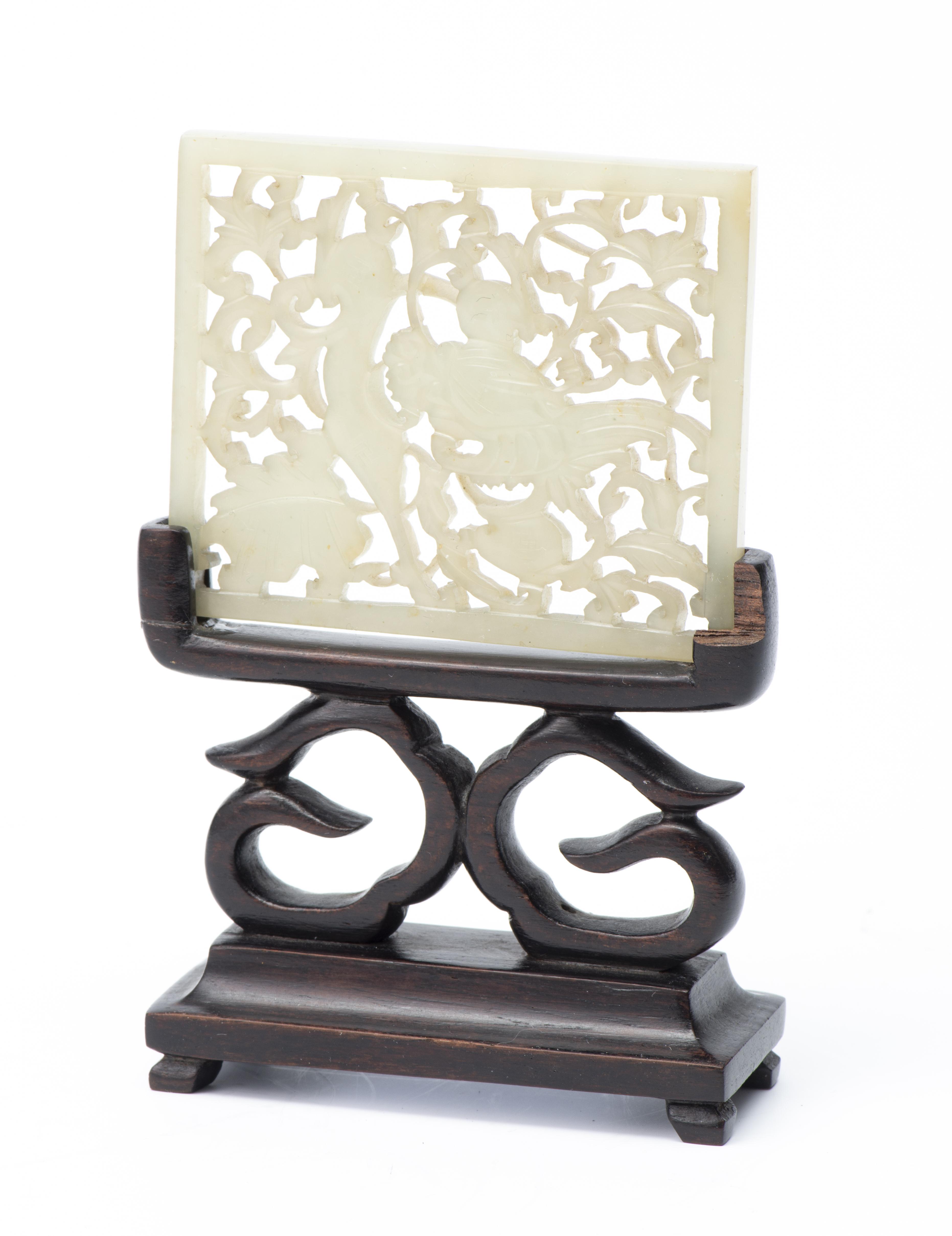 CHINE, petit écran en jade sculpté sur socle en bois