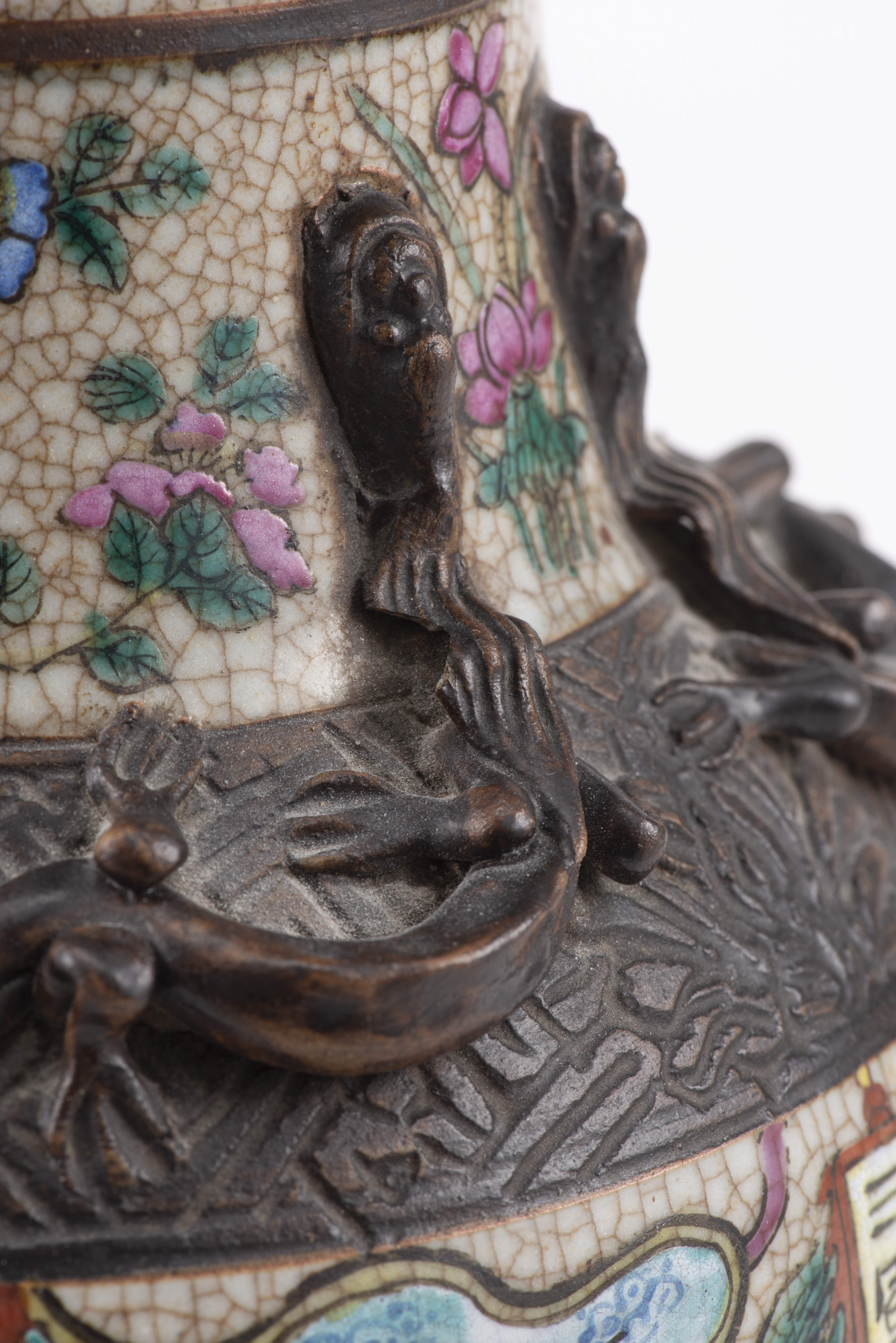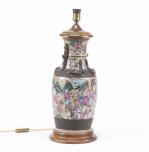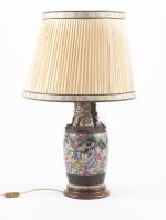 Lampe de table avec pied en porcelaine de Chine de Nankin, à décor en trois registres: sous la lèvre une scène de bataille, puis des fleurs, puis, sur la panse, une scène de bataille des Trois Royaumes, monture de la lampe en bois.