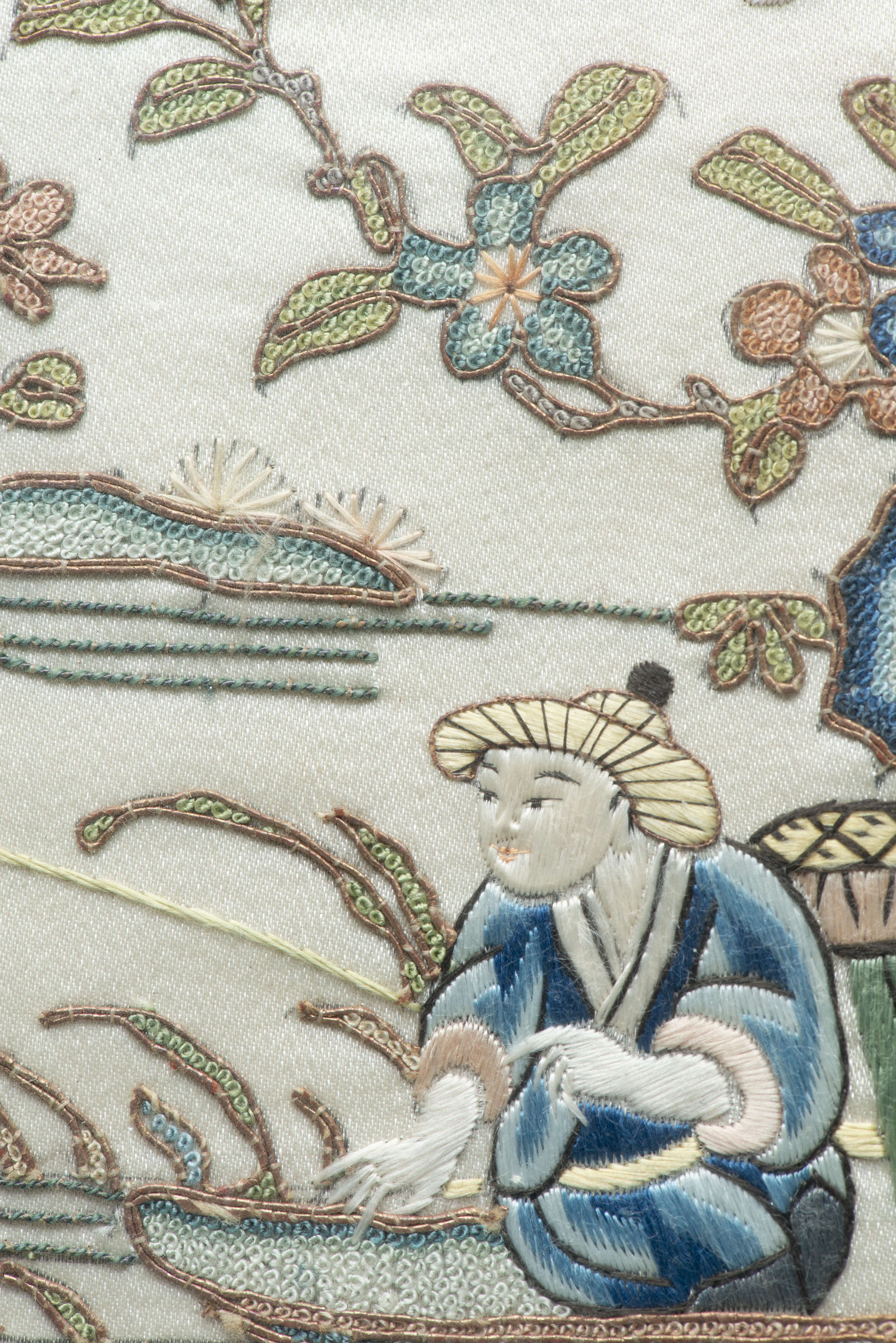 Trois broderies de manches d'habit sur soie, encadrées, deux dans des cadres en bois sculpté ajouré à décor de fleurs et feuilles, la troisième dans un cadre en bois doré plus simple. Les broderies représentent des scènes de la vie quotidienne dans la campagne.