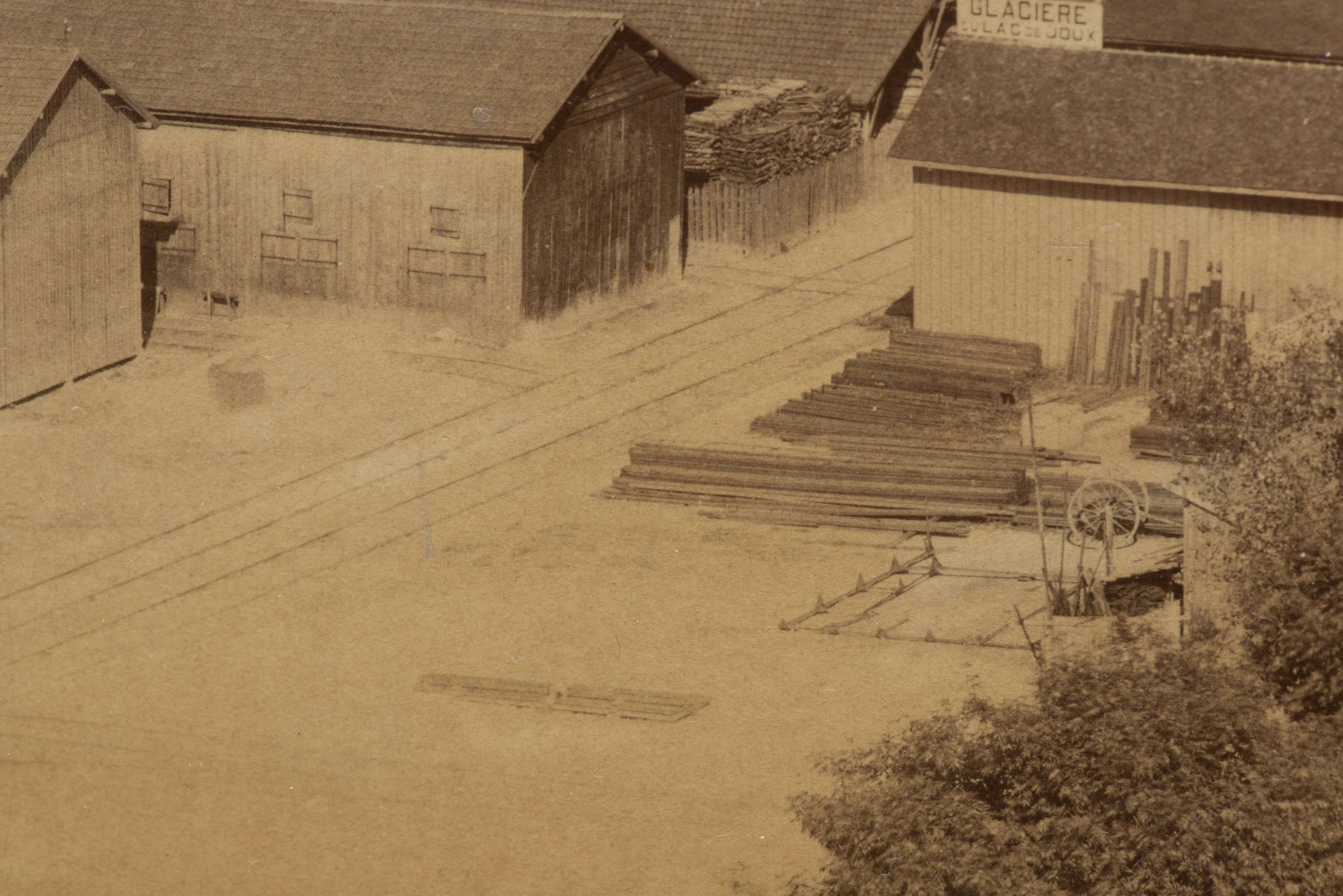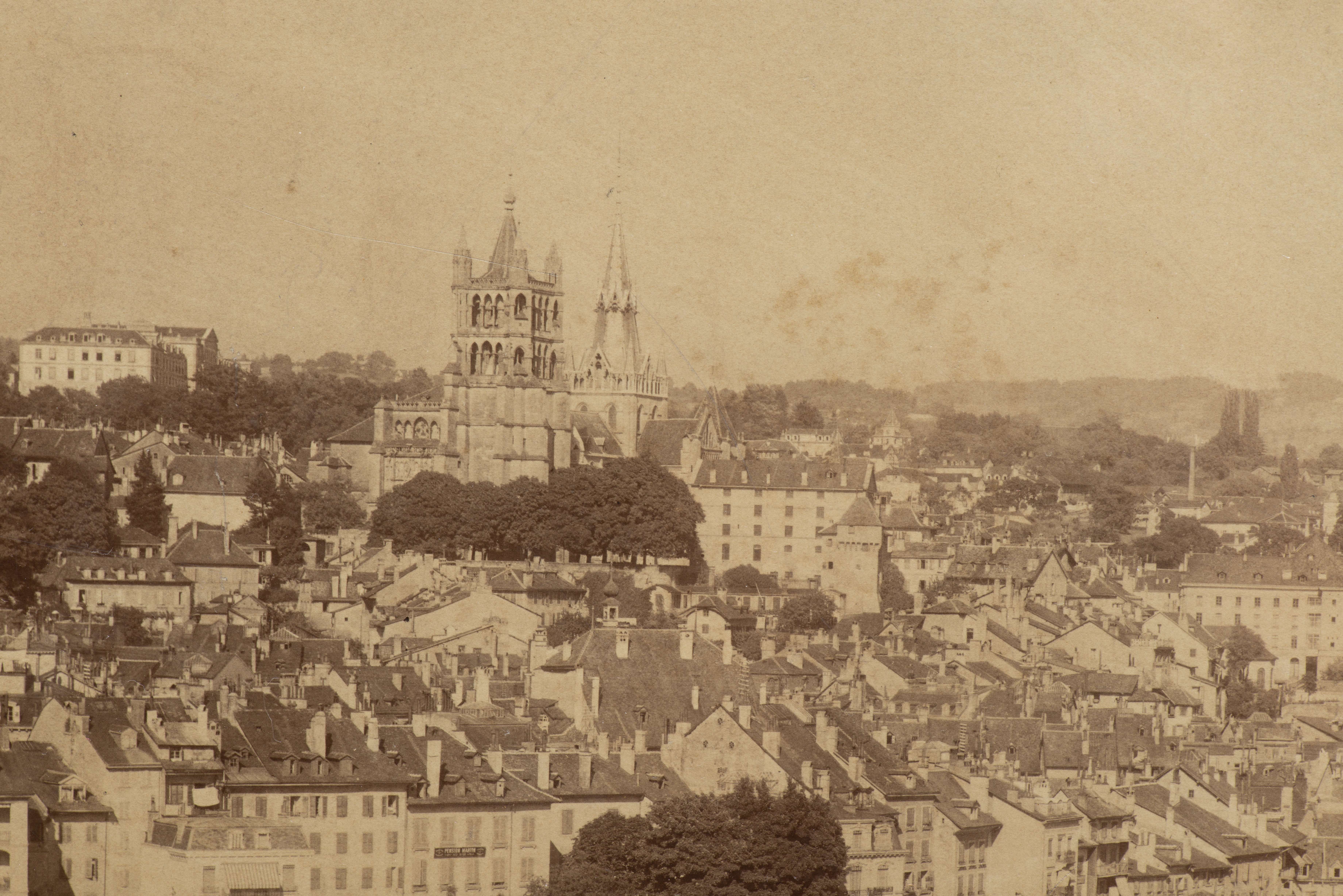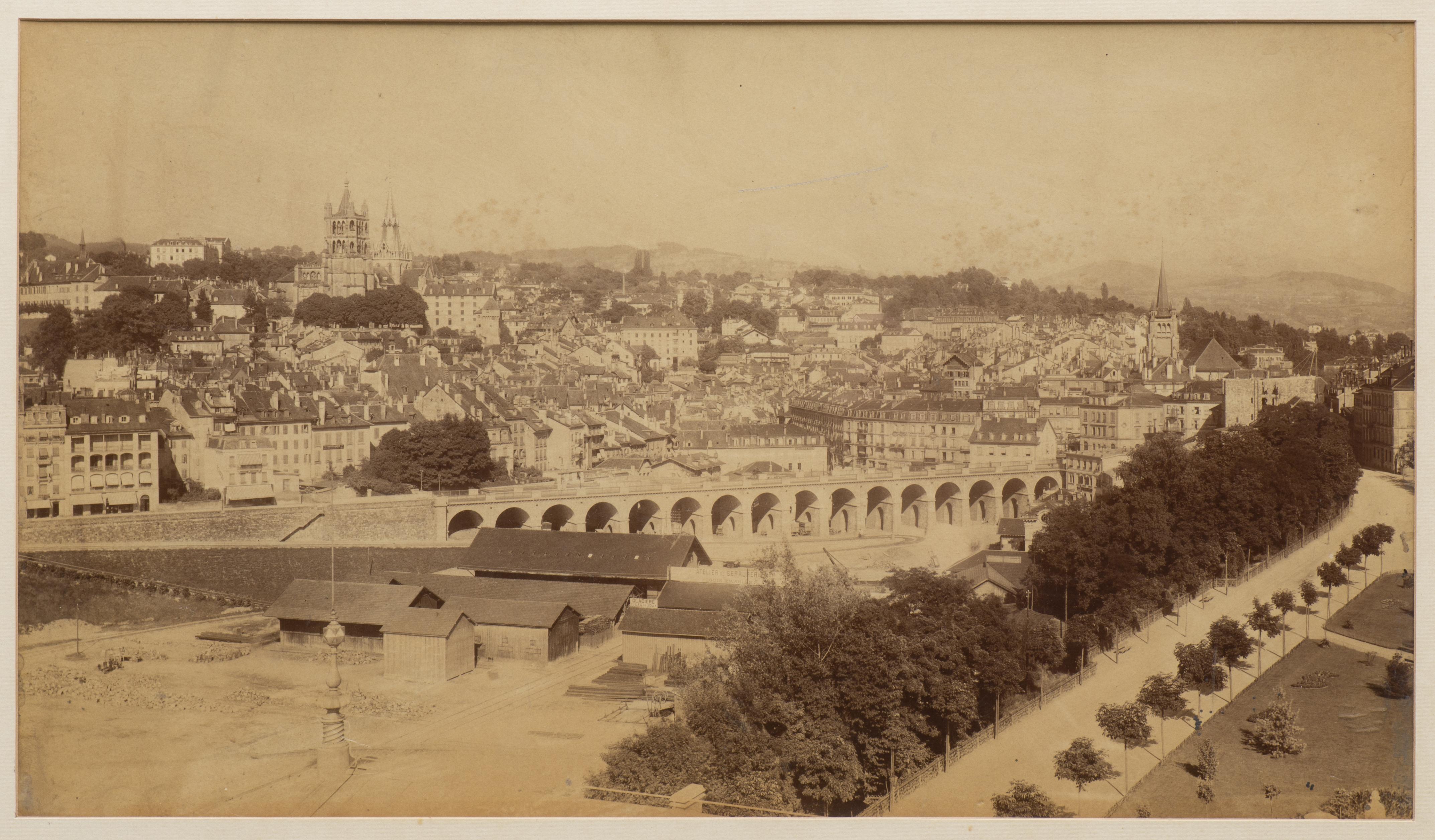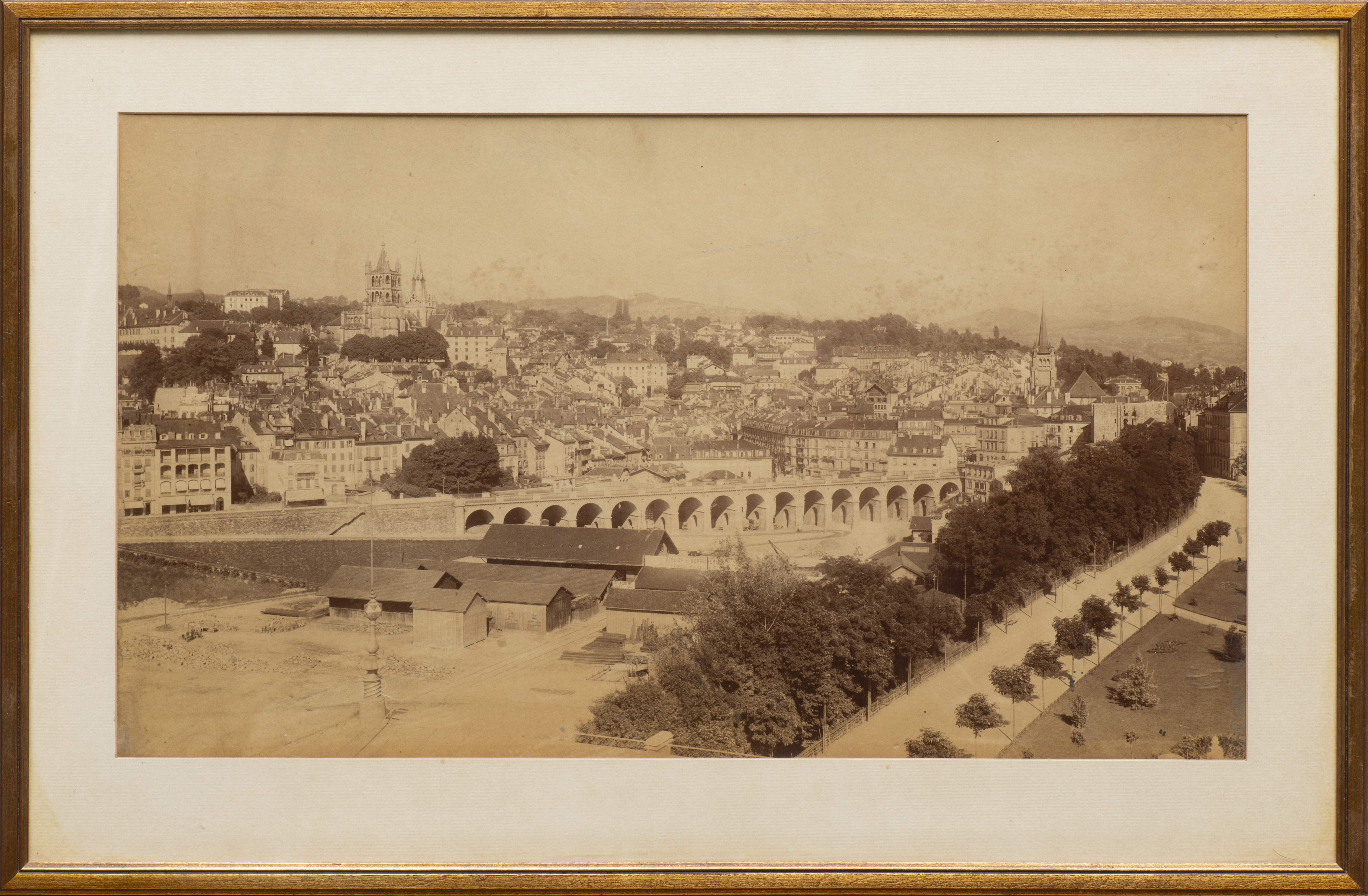 Tirage à l'albumine d'une vue du Grand Pont et du Flon de Lausanne